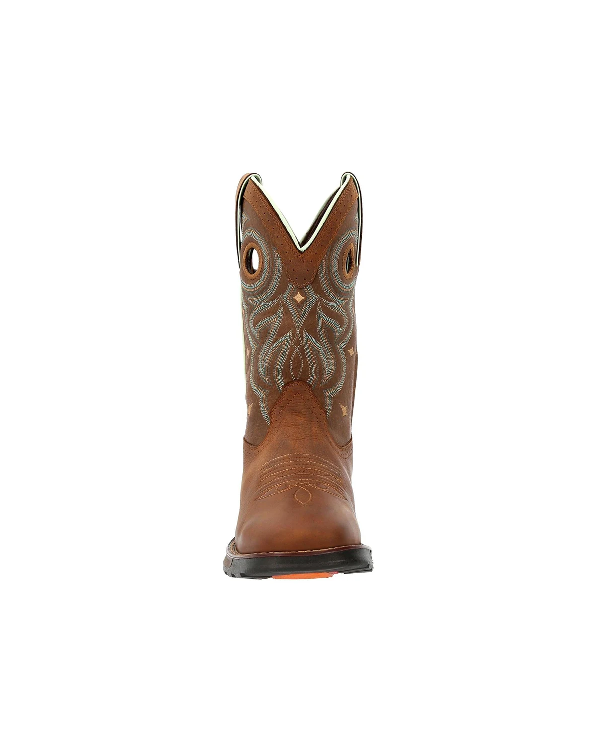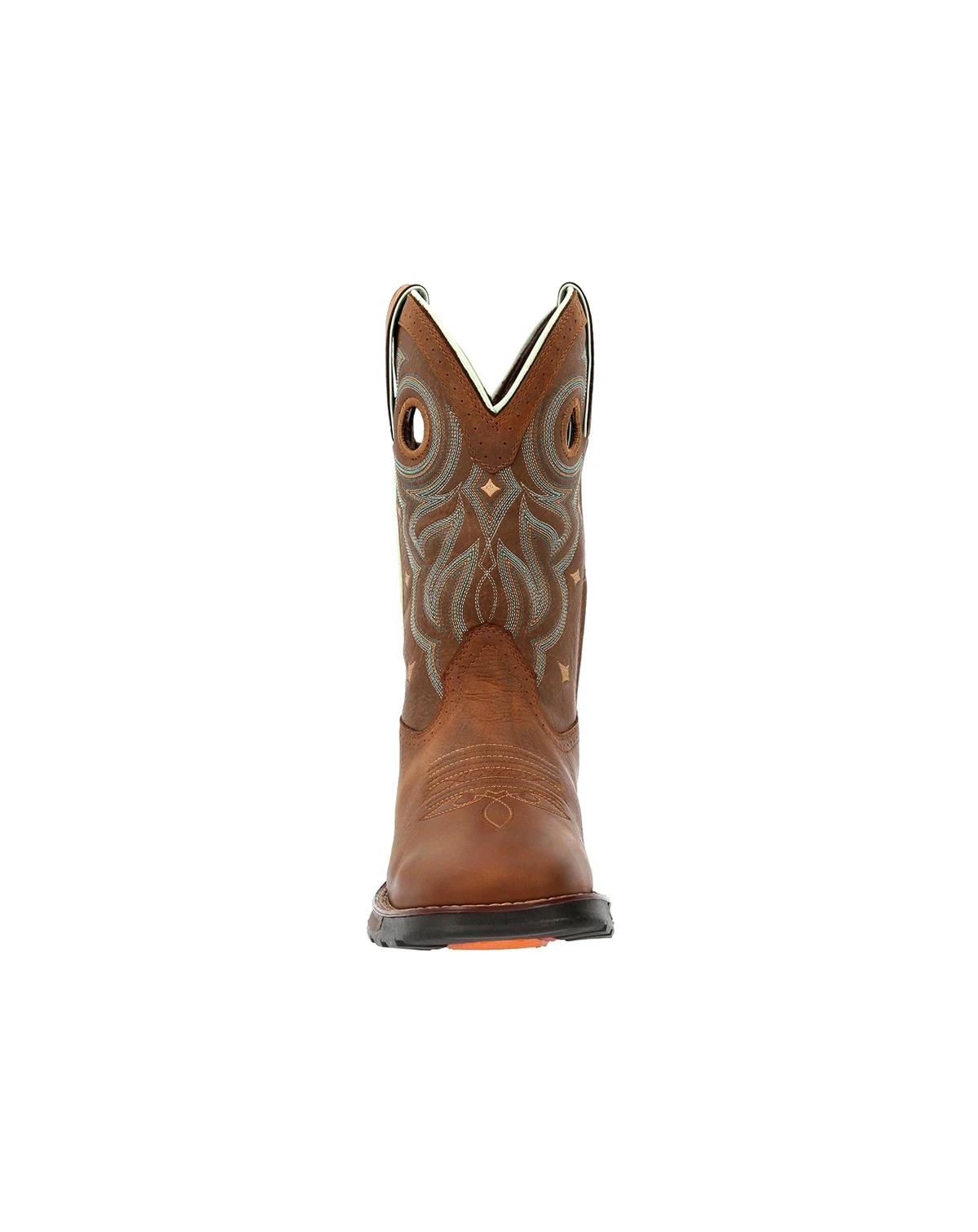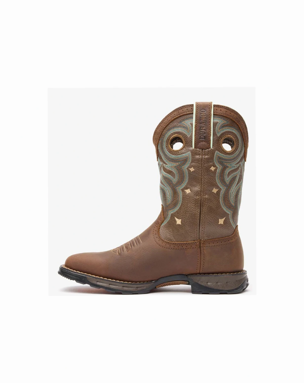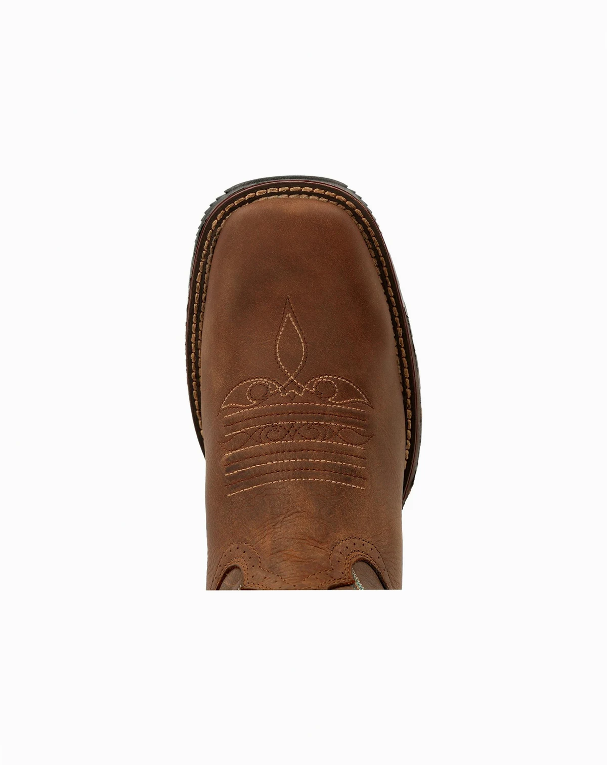 This is the women's 10 Waterproof Western Waterproof Rugged Tan Durango Maverick. This style is full-grain leather with a faux shaft, has a soft mesh lining, waterproof membrane bootie construction and the Durango X-Pand System which is a hidden gore expansion for universal fit and easy on/off. It also includes the Durango X-Treme Comfort Footbed with memory foam for all day comfort and support. This style also features a fiberglass shank which provides lightweight stability, and the rolled shank area allows easy placement in the stirrup. The style is finished off with a slip and oil-resisting rubber outsole, single row sole stitch, 1 1/8 rocker heel and square toe. Pull on all-day work comfort in this women's 10 Western Waterproof Rugged Tan Durango Maverick. Get a pair today!.
