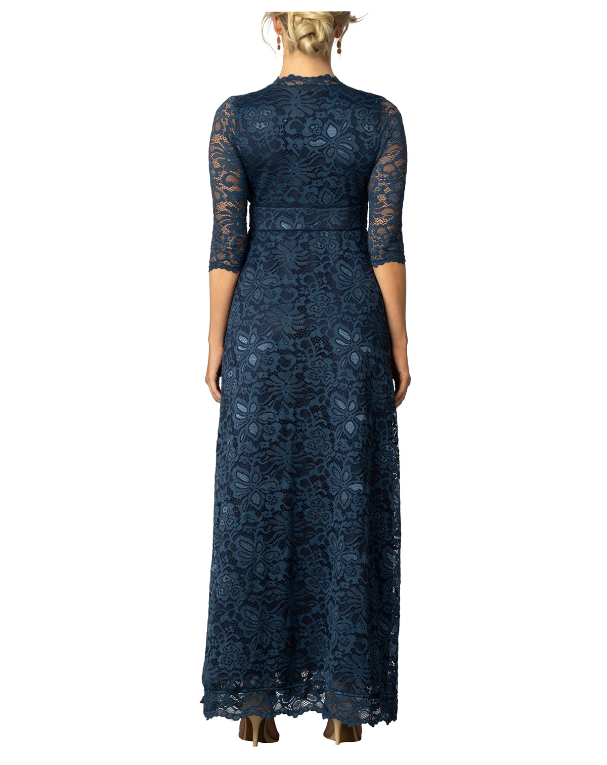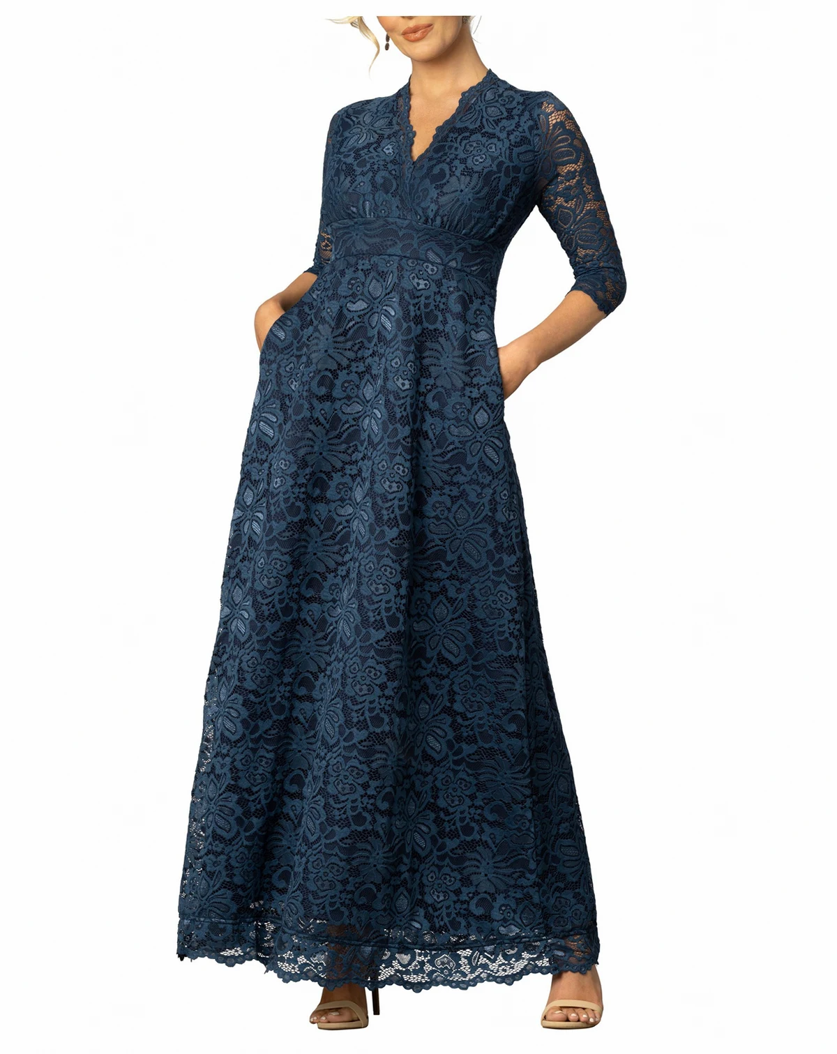 The Maria Lace Evening Gown is a long, formal gown featuring an A-line silhouette, surplice V neckline, 3/4 sleeves, and everyone's favorite - pockets!
