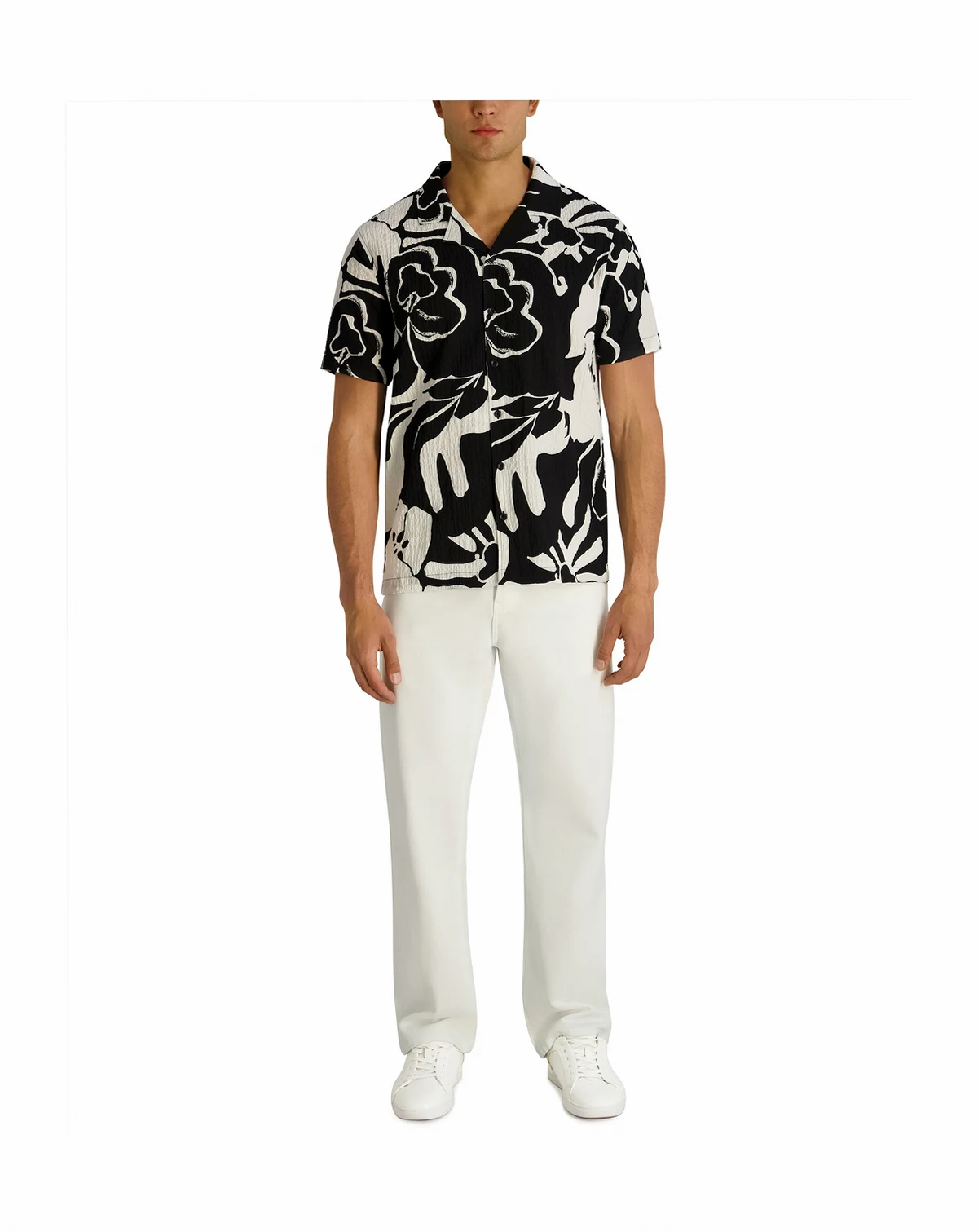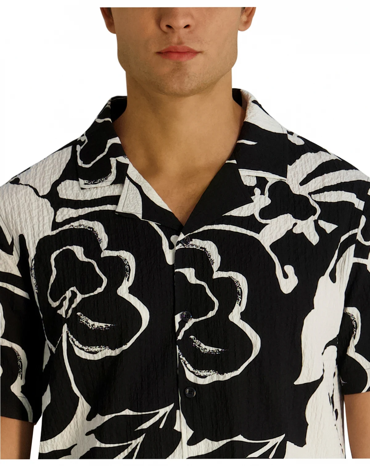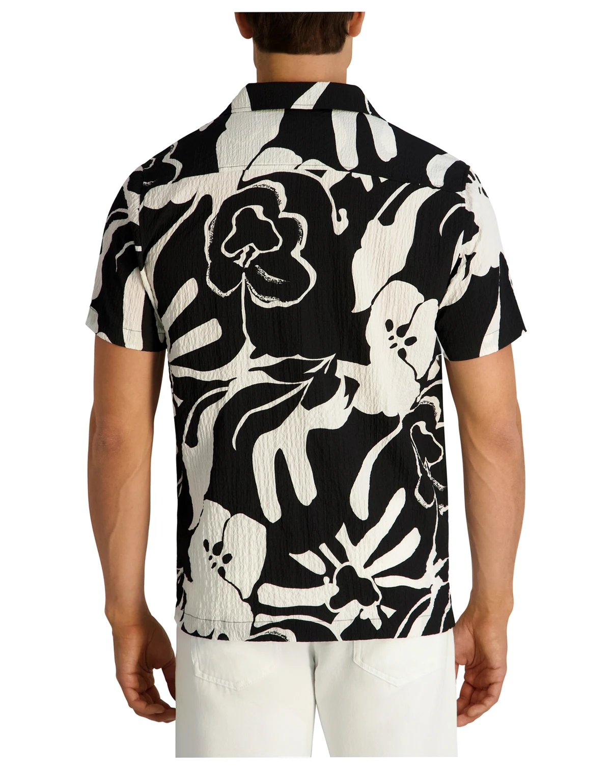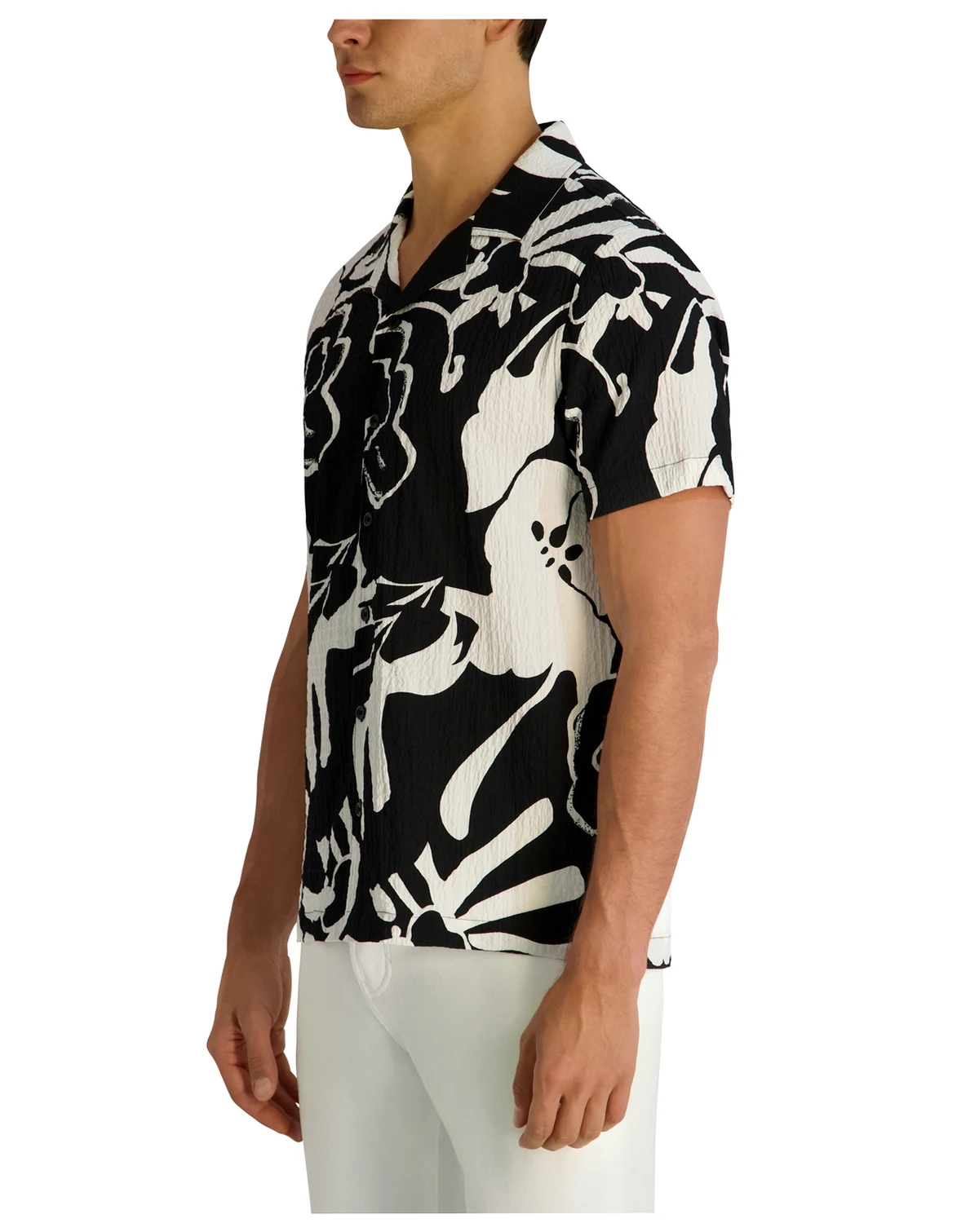 Sun-soaked refinement sets the tone for this KARL LAGERFELD PARIS shirt crafted in lightweight seersucker with a subtle floral pattern and camp collar. The relaxed construction enhances breathability for effortless, vacation-ready appeal.