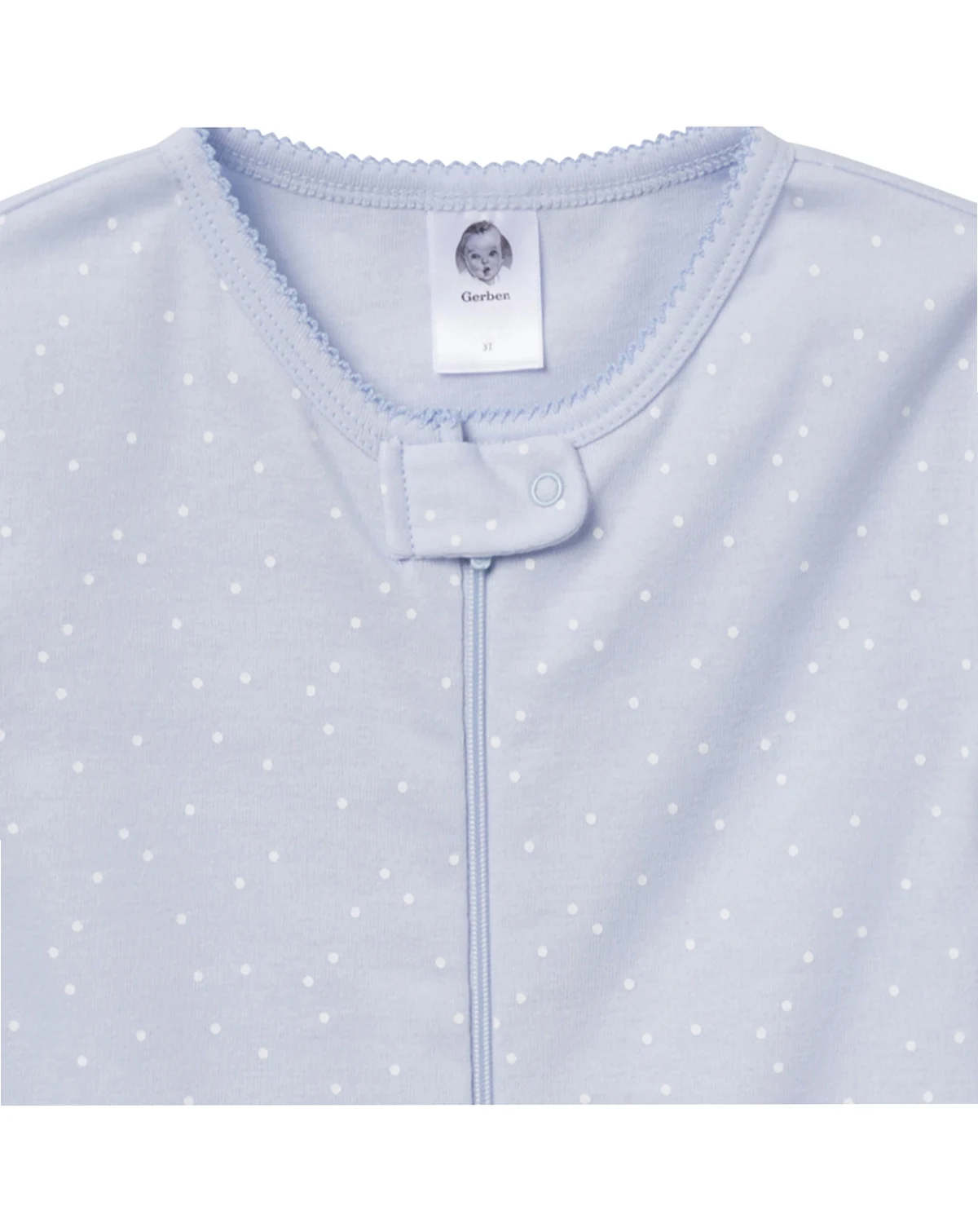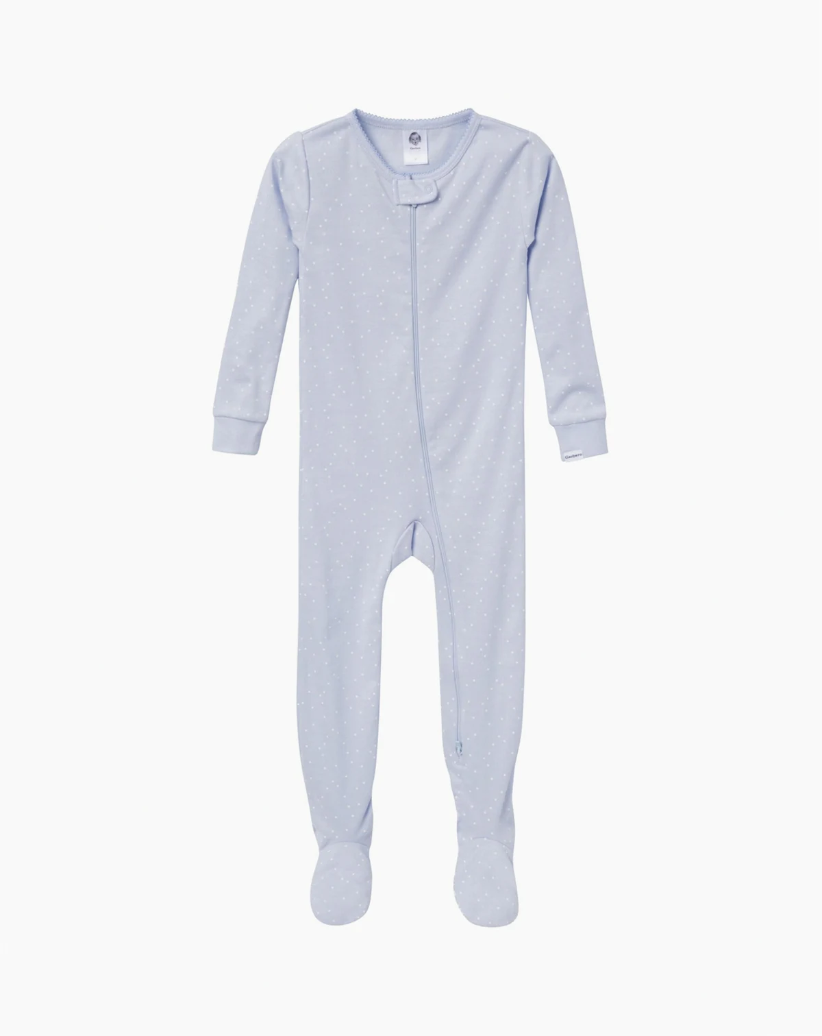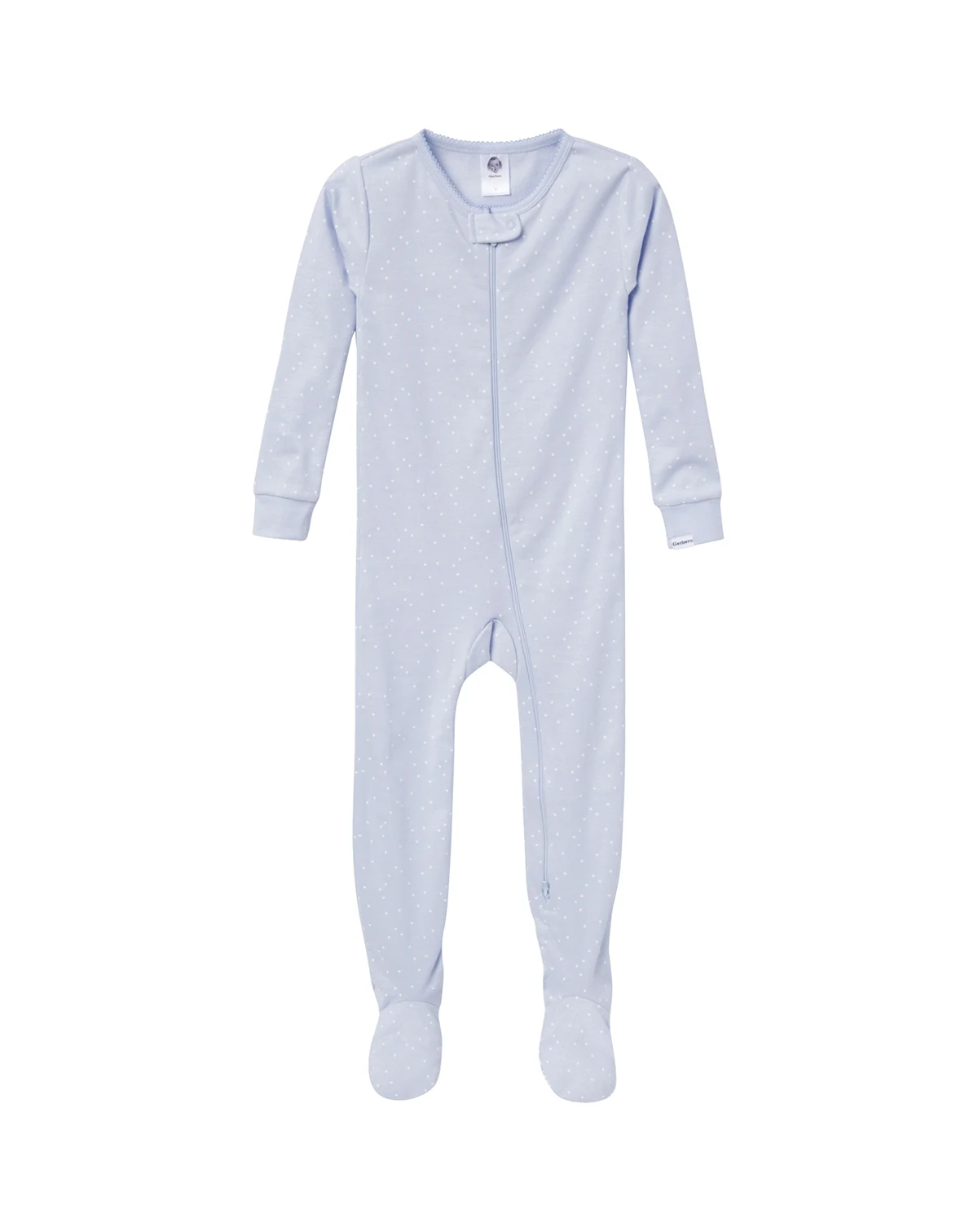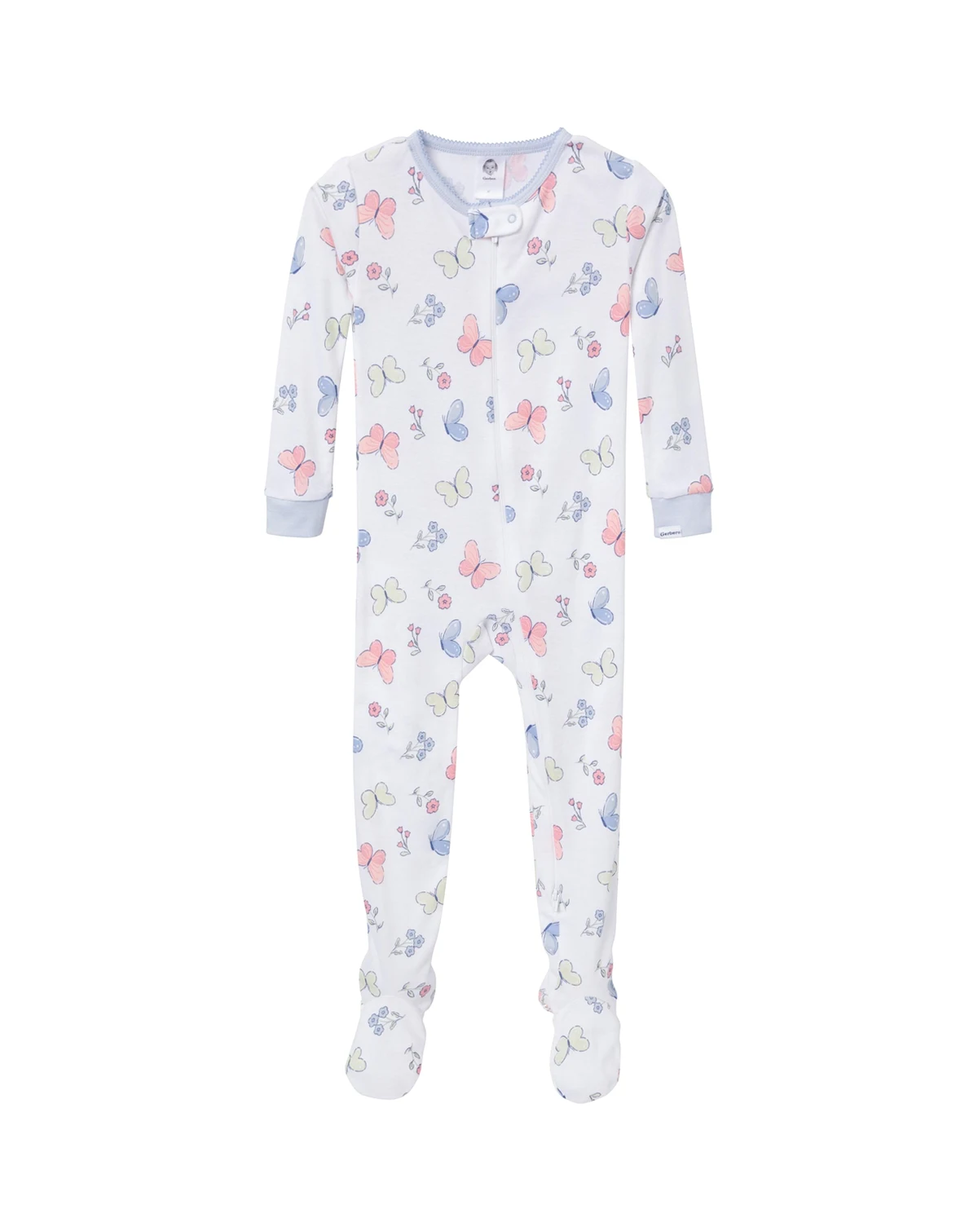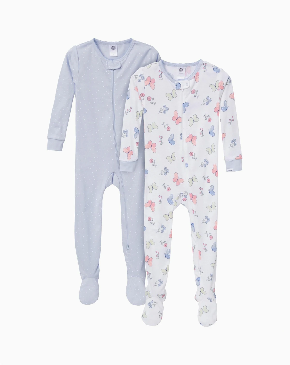 After a long day of play, our baby pajamas or toddler pajamas offer the cozy comfort your little one needs to unwind and drift off to sleep. Made primarily from soft cotton, the pajamas provide a breathable feel that keeps her snug all night. The 2-pack includes a calming blue style with white polka dots and another in white with enchanting multi-color butterflies, making bedtime feel magical and fun. The two-way zipper with a neckline guard ensures easy dressing and quick diaper changes, while the non-skid soles offer extra traction for safe steps. Spandex trim at the neckline and wrists provides a flexible, secure fit, and the tight-fitting style is designed for safe wear. These pajamas are a perfect blend of comfort and style, ideal for relaxing after a day of fun. Our essentials have been independently certified with STANDARD 100 by OEKO-TEX so that you don t have to worry about harmful substances in your baby s wardrobe. Pack includes two snug fitting footed pajamas.