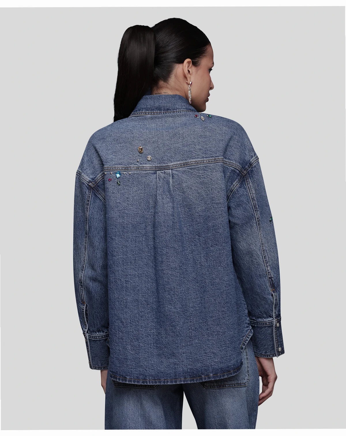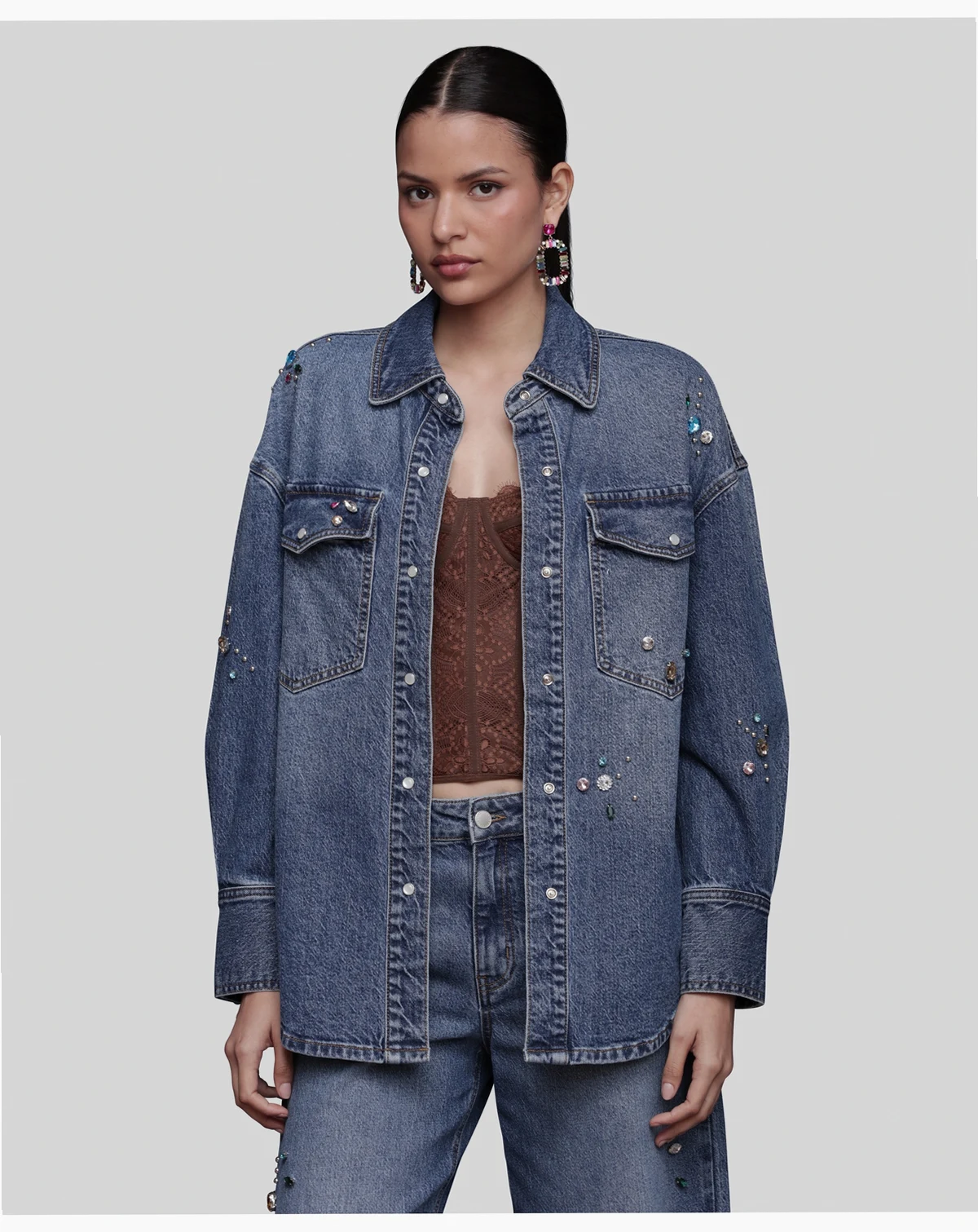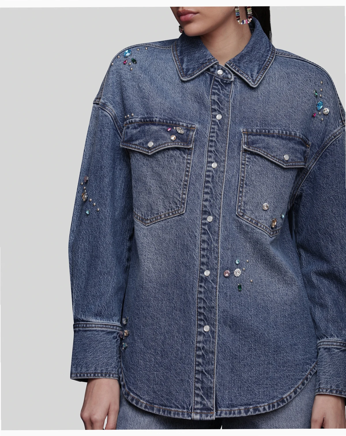 Add brilliance to your rotation with this Avec Les Filles bejeweled oversized shirt, featuring front snaps for easy wear and chest pockets for utility. A spread collar and long sleeves enhance its versatile frame.