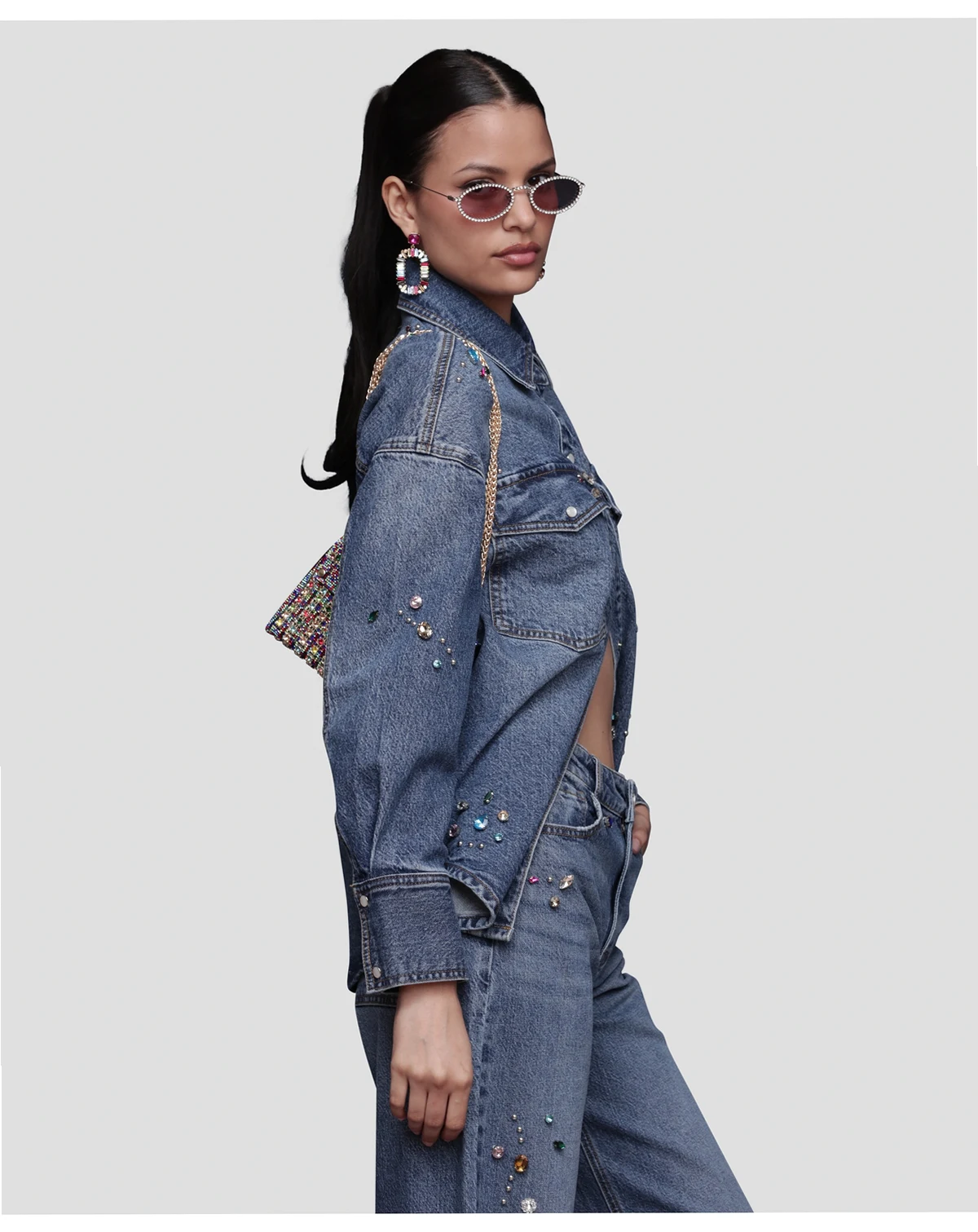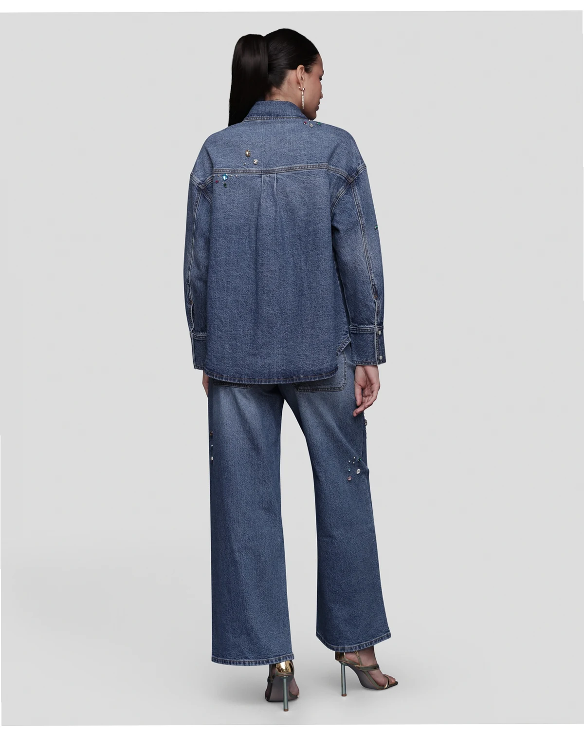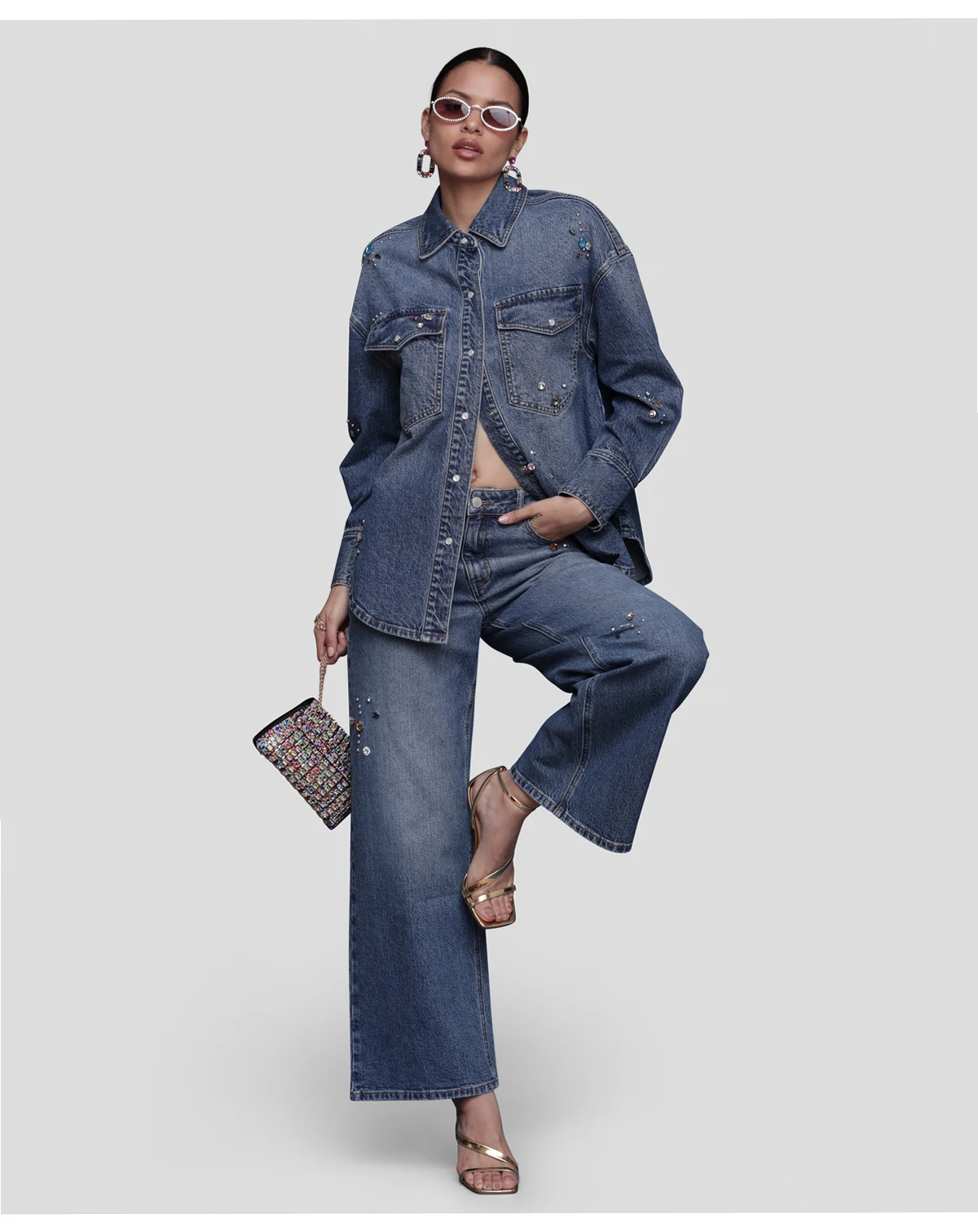 Add brilliance to your rotation with this Avec Les Filles bejeweled oversized shirt, featuring front snaps for easy wear and chest pockets for utility. A spread collar and long sleeves enhance its versatile frame.