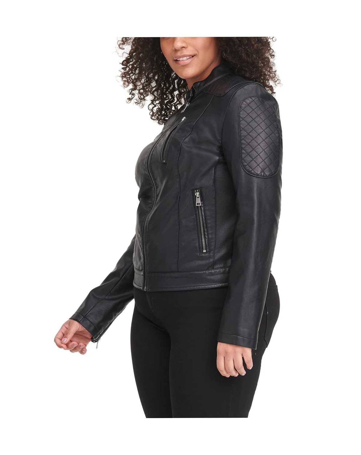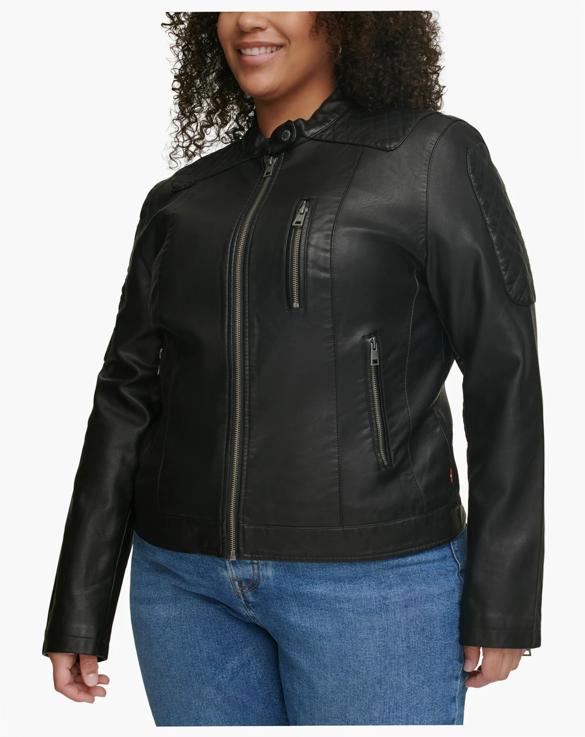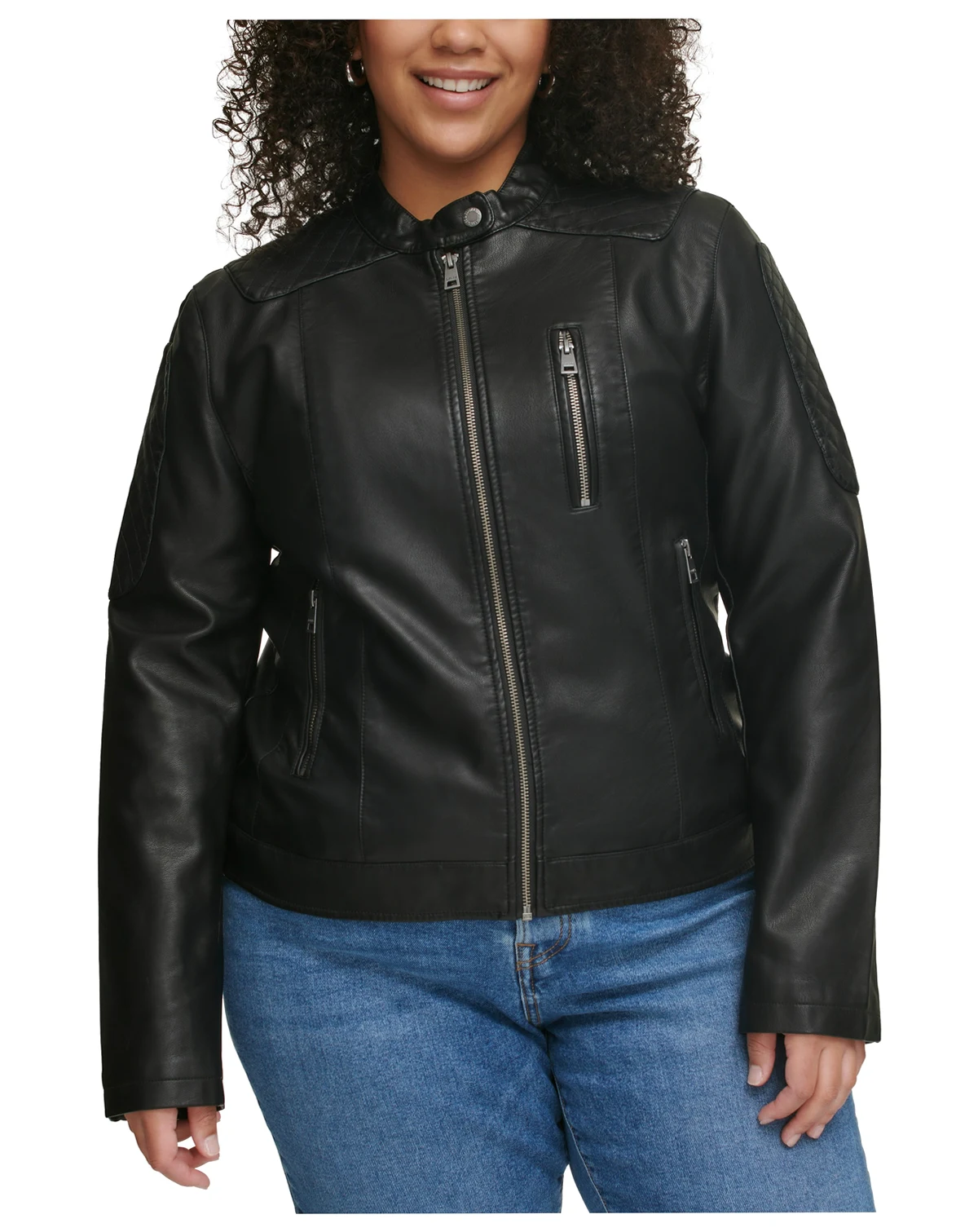 Smooth lamb touch faux latch collar fashion racer with lower zipper pockets.