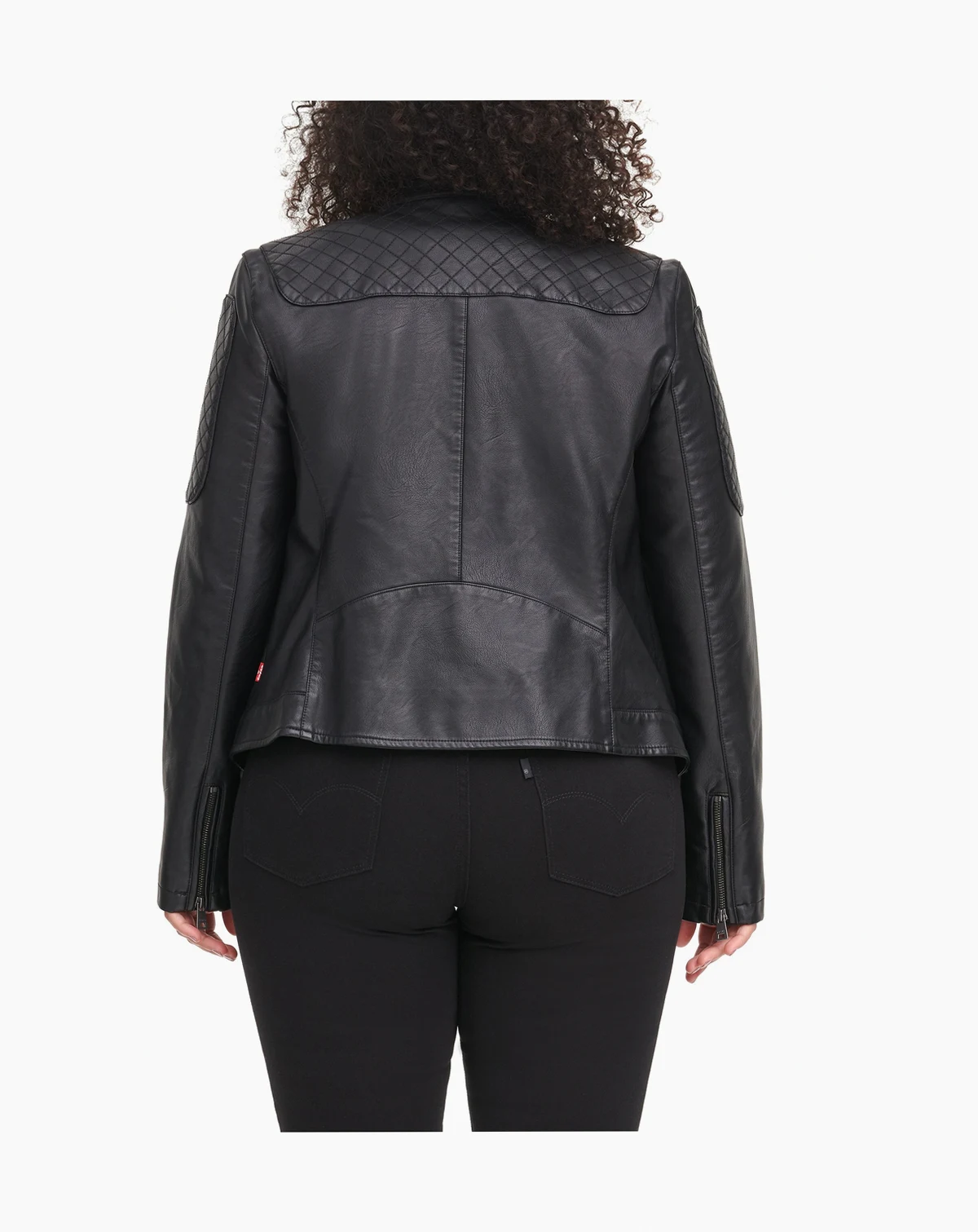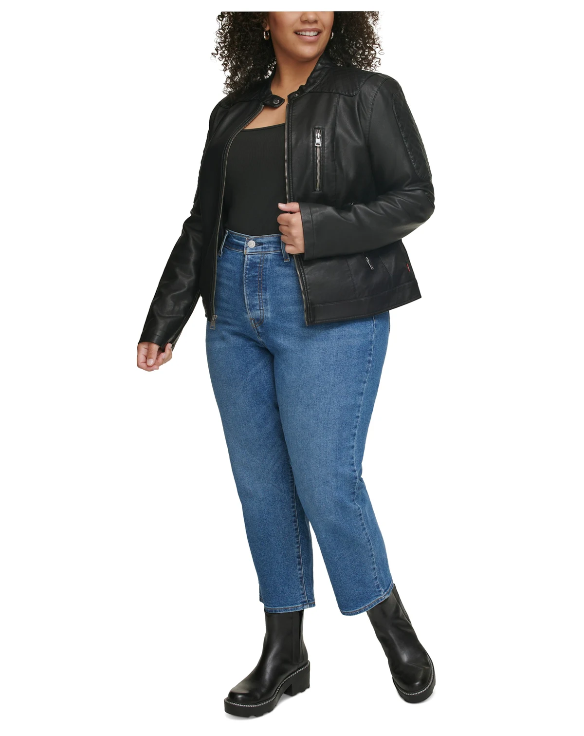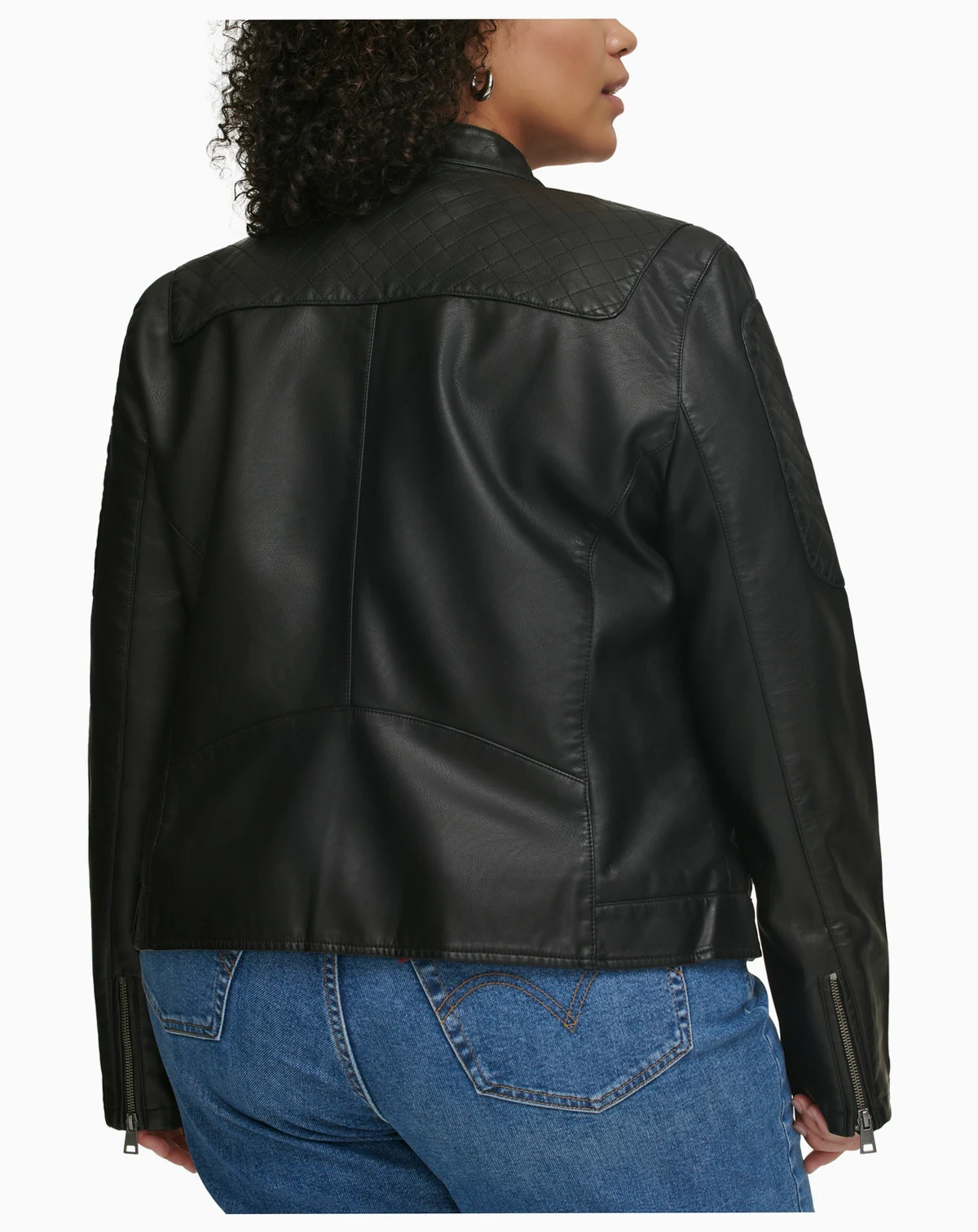 Smooth lamb touch faux latch collar fashion racer with lower zipper pockets.
