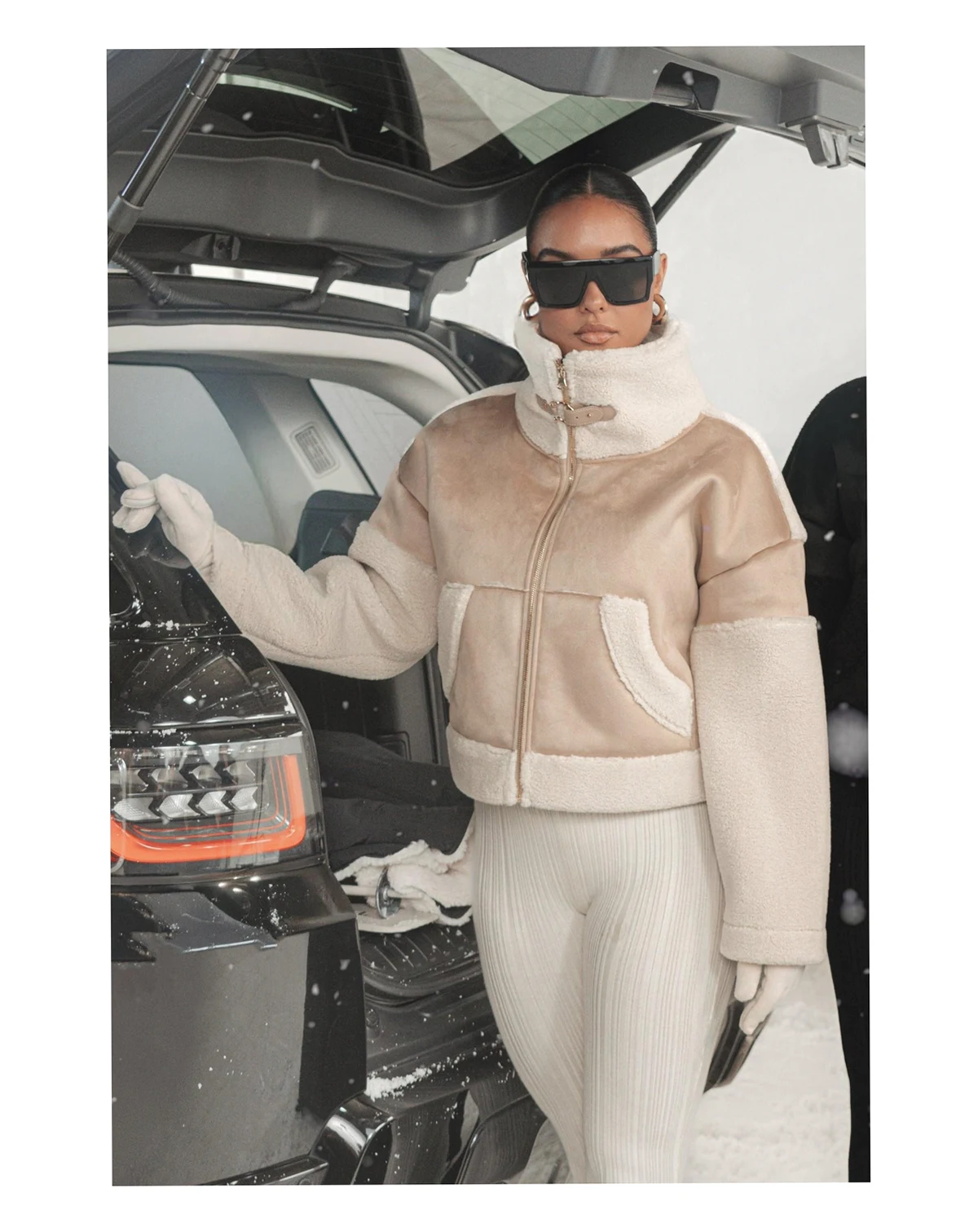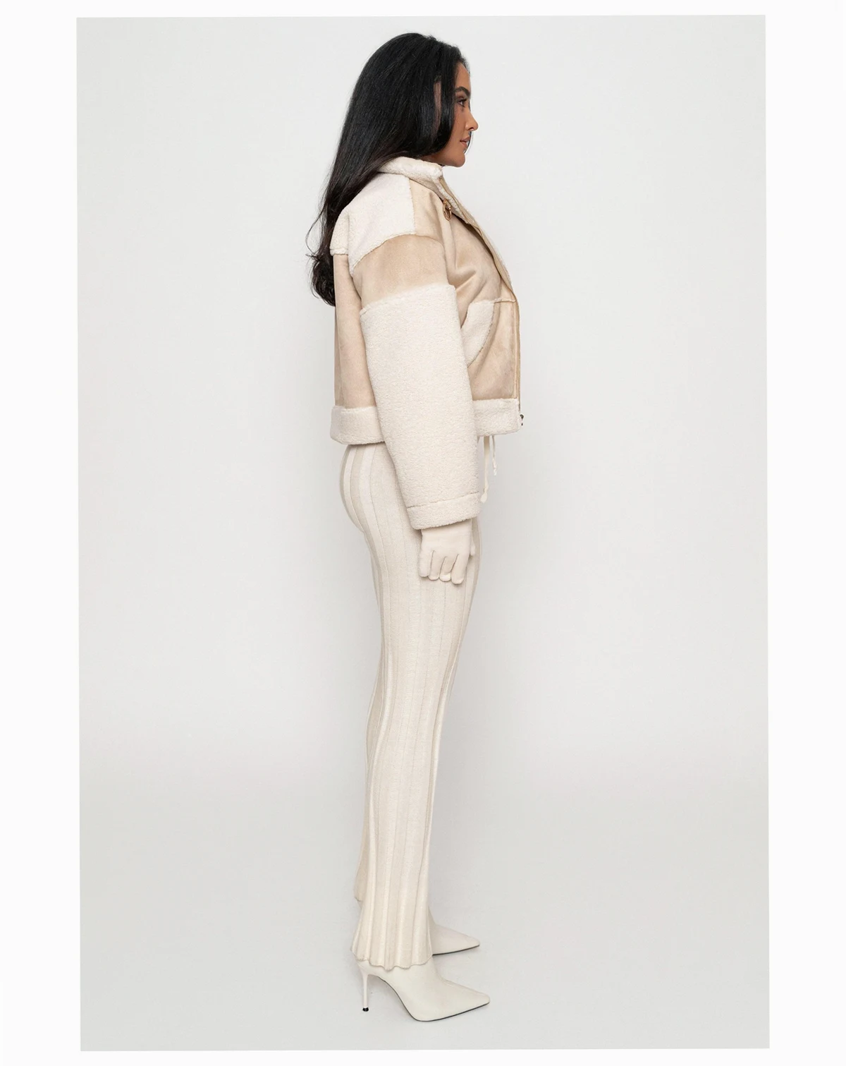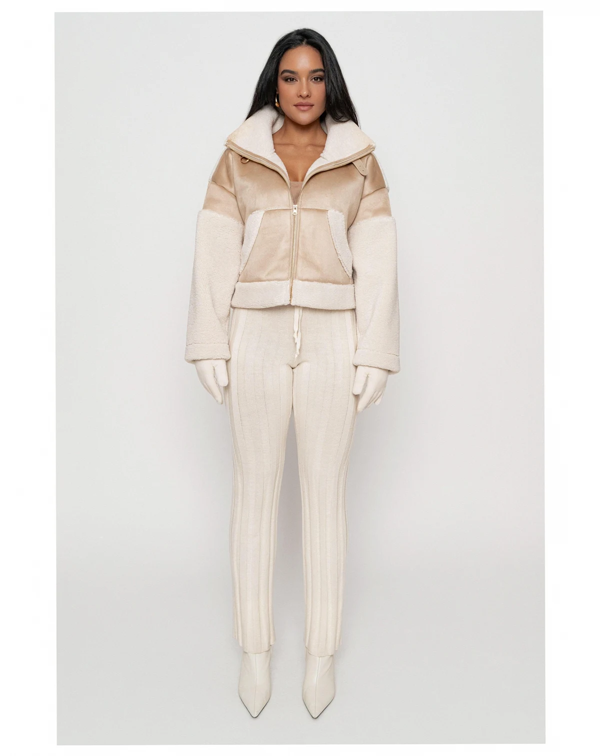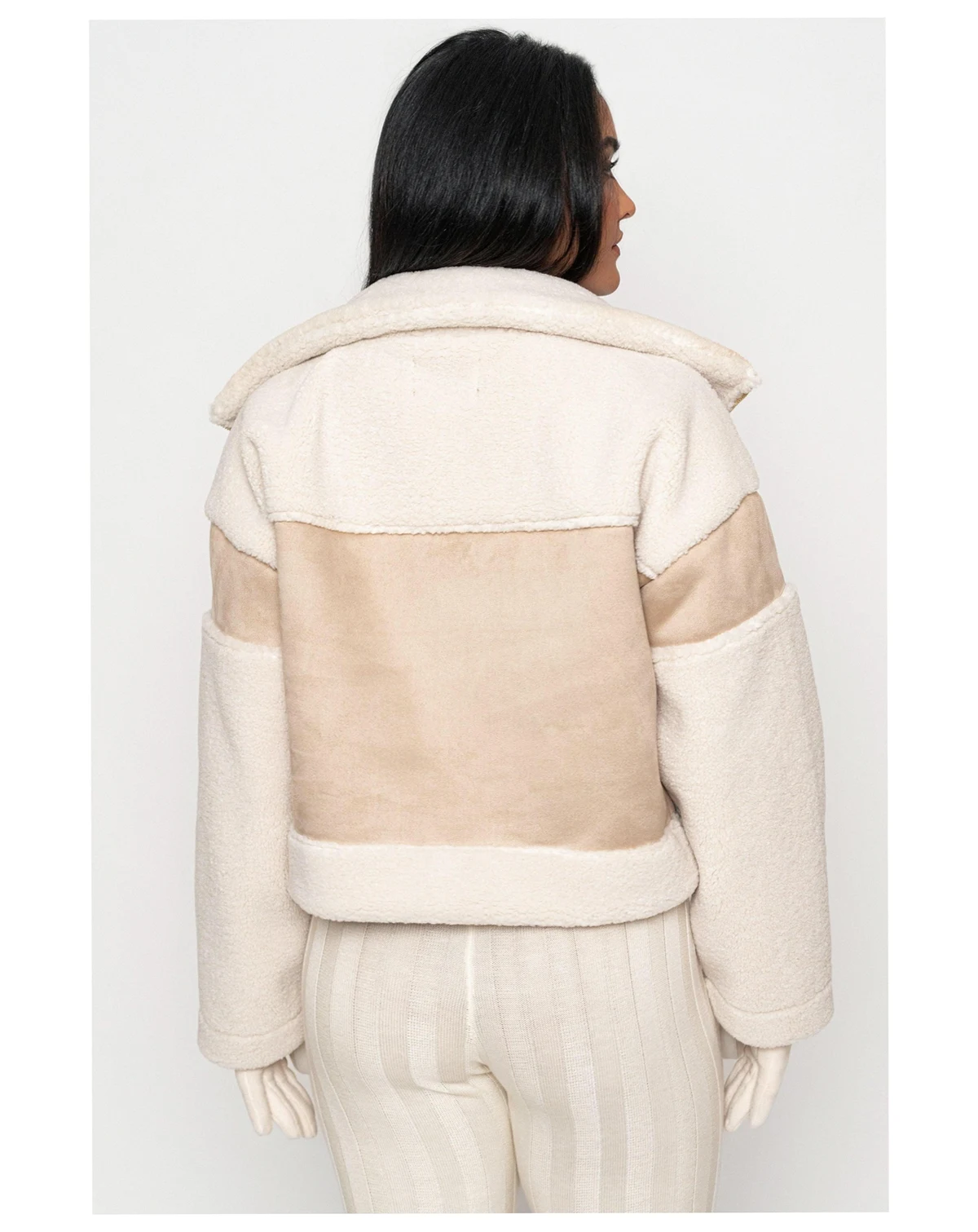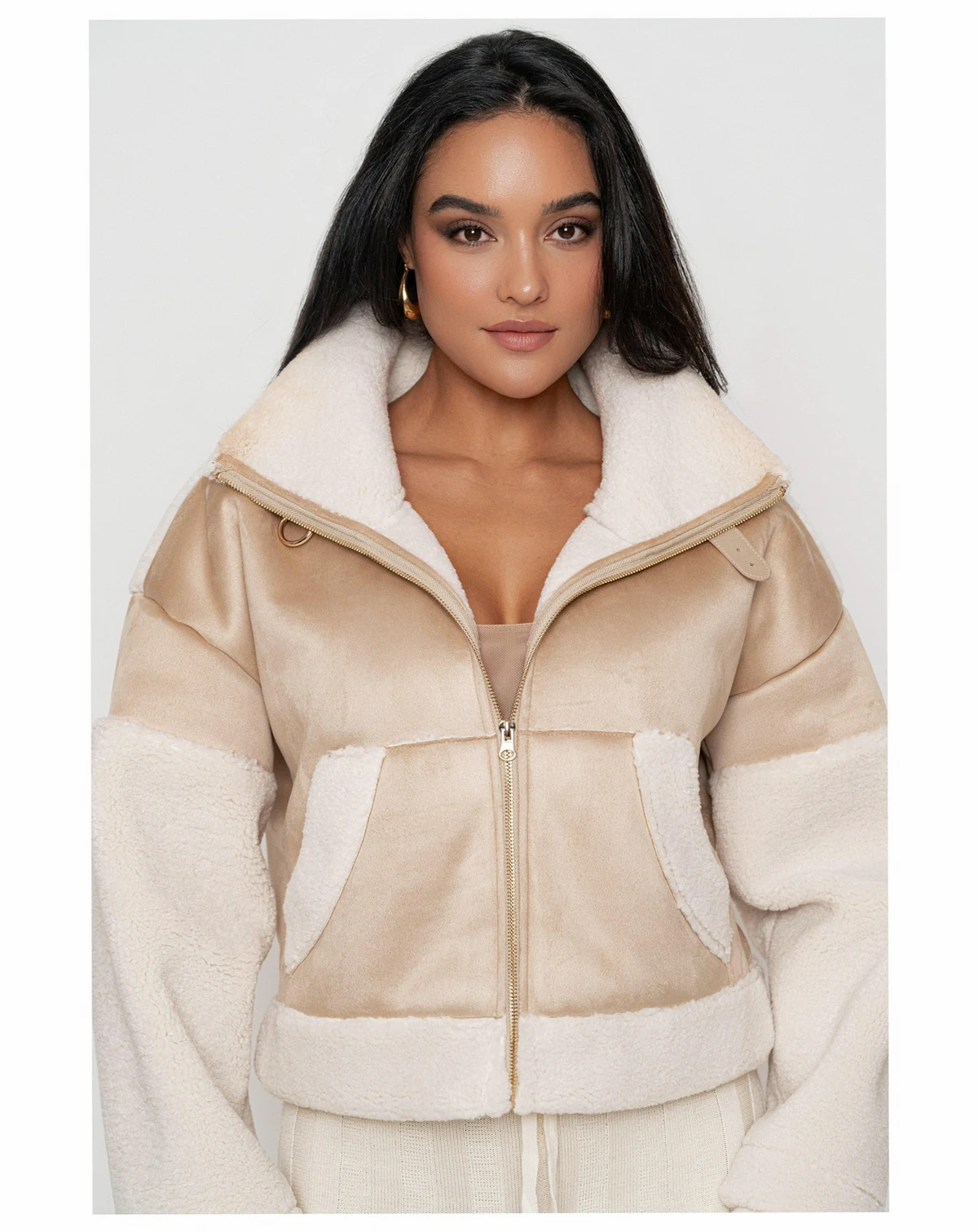 Unleash your winter style with our Suede And Sherpa Jacket, bringing you a sophisticated blend of contrasting textures in smooth suede and cozy sherpa trims. This luxurious winter layer features a stylish turtle neckline, adorned with a faux leather strap and gold-tone hardware for a touch of luxury. Complete with a front gold-tone zipper and functional side pockets providing convenience without compromising style.