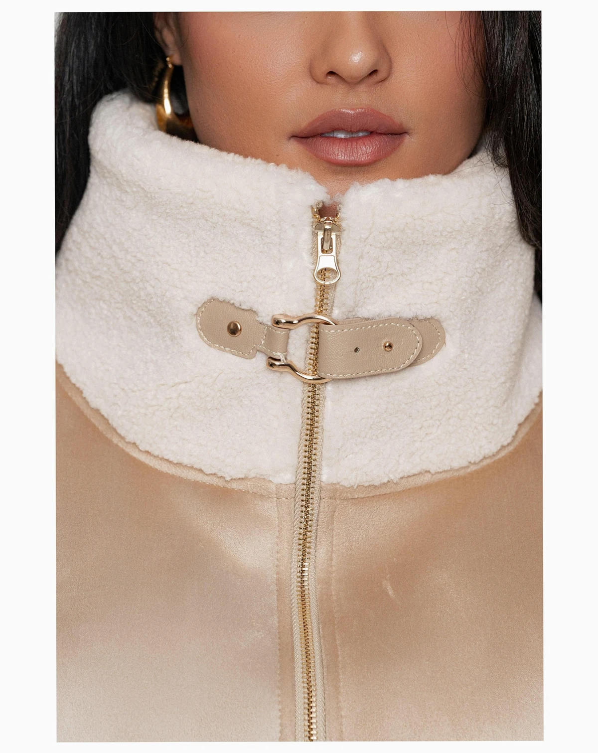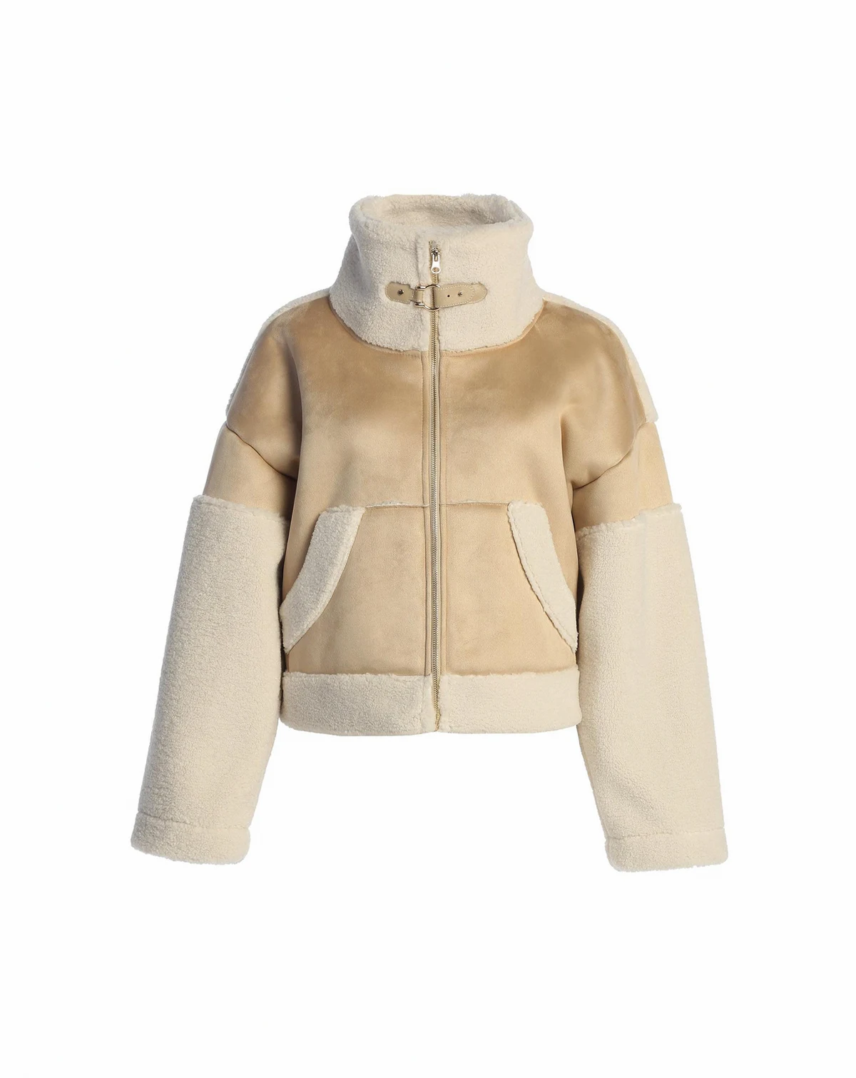 Elevate your winter wardrobe with our Suede And Sherpa Jacket, expertly crafted from smooth suede and accented with cozy sherpa trims for a chic and contemporary outerwear choice.; 100% polyester; Designed with a stylish turtle neckline, this jacket features a faux leather strap and gleaming gold-tone hardware, adding an elegant touch to your winter ensembles.