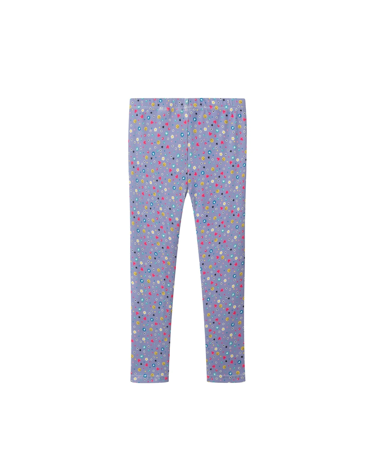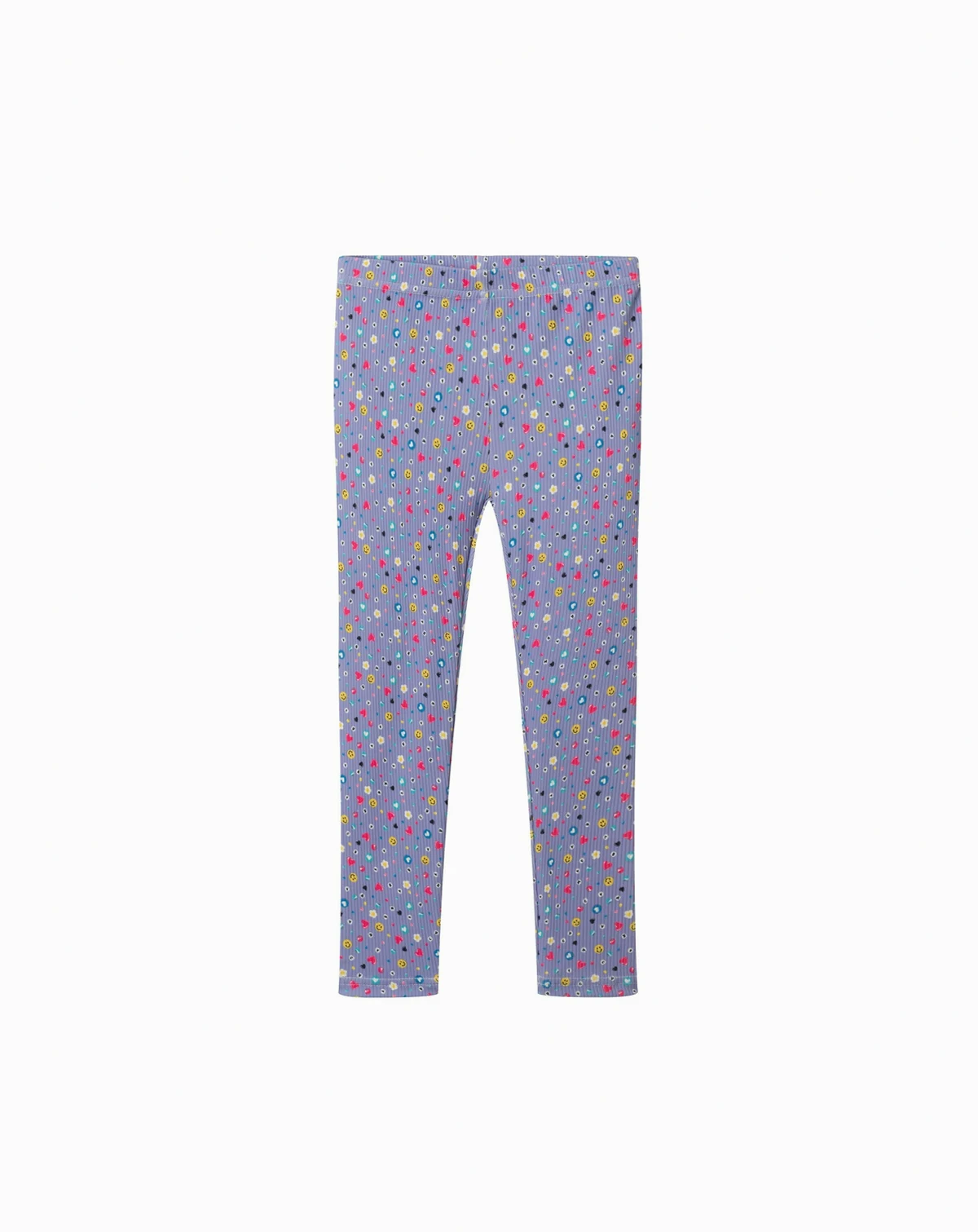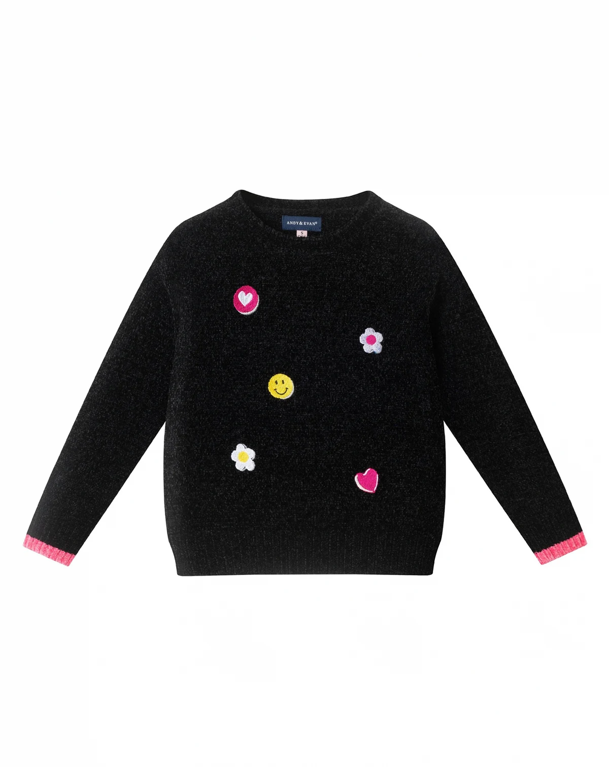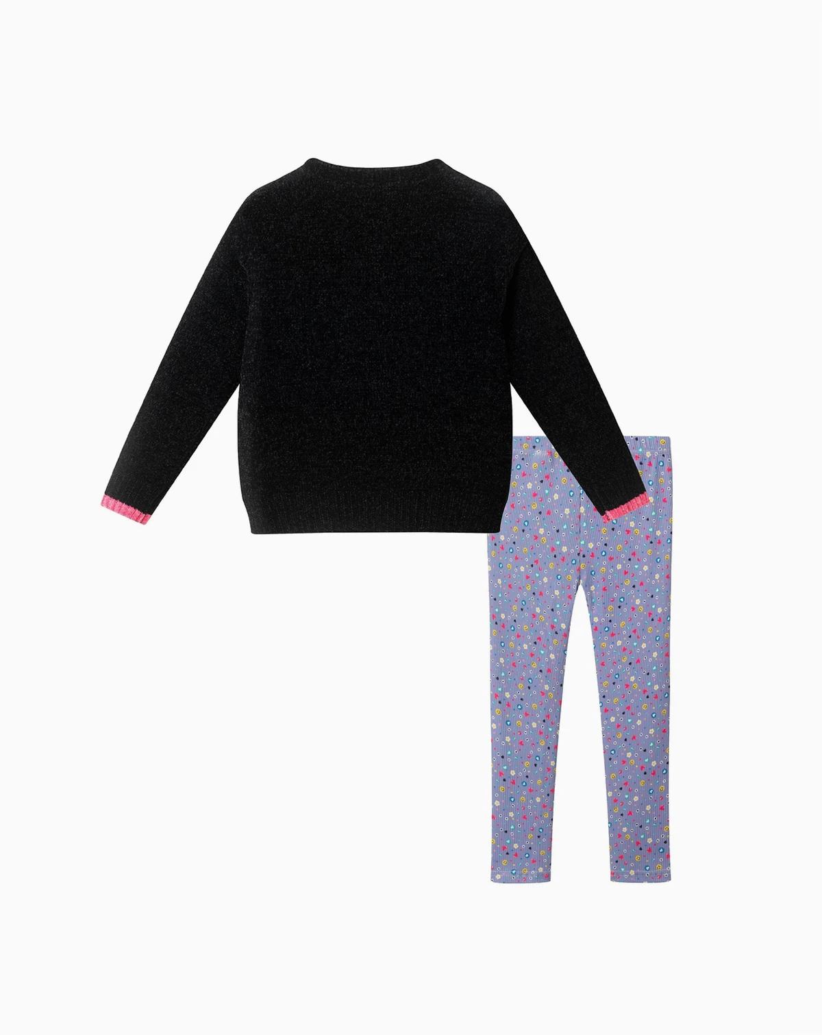 Brighten up cooler days with this cheerful and comfy set. The black knit sweater features playful patches - smiley faces, hearts, and flowers - that pop with personality, plus a surprise pink cuff detail for extra fun. It pairs perfectly with vibrant leggings printed all over with tiny multicolor florals, bringing color and comfort together in one easy outfit. Soft, stretchy, and full of joy, this set is made to move and made to smile.