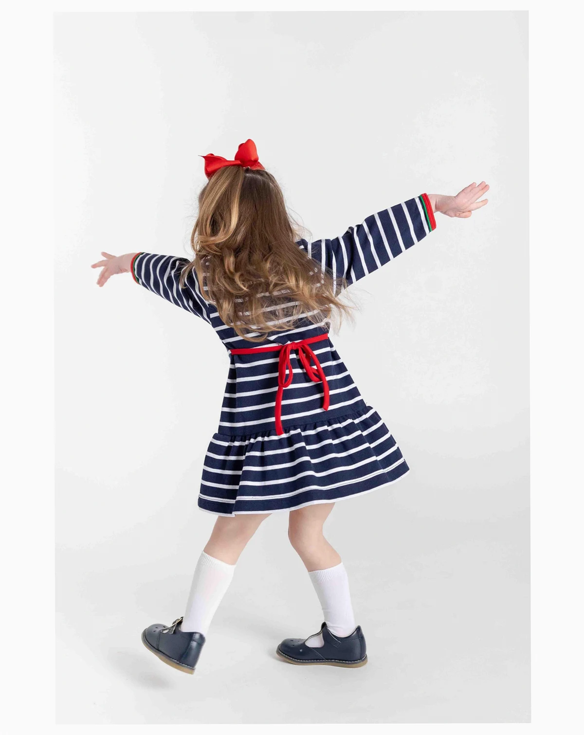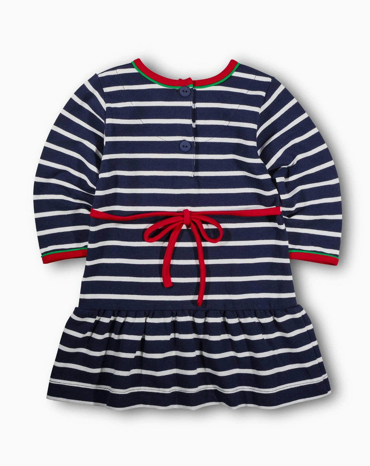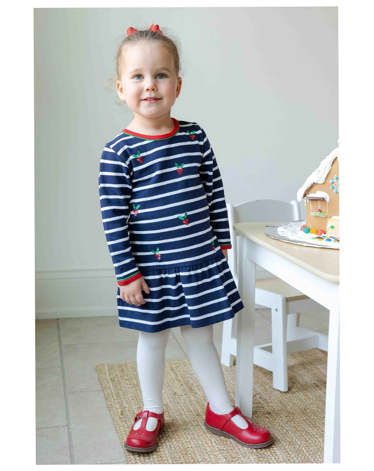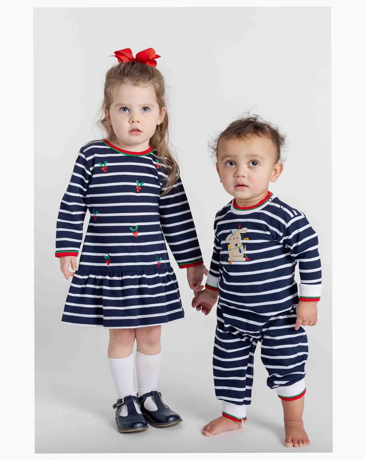 Full of holiday cheer, this cozy longall is crafted from navy and white yarn-dyed pique knit. A playful applique dog tangled in festive holiday lights decorates the chest, bringing a touch of whimsy to this seasonal style. White rib trim at the neck, sleeves, and legs—finished with navy tipping and a red stripe—adds a polished, sporty touch. Shoulder snaps and an inseam zipper make dressing and changes simple, while 100% cotton construction ensures softness and comfort all season long.