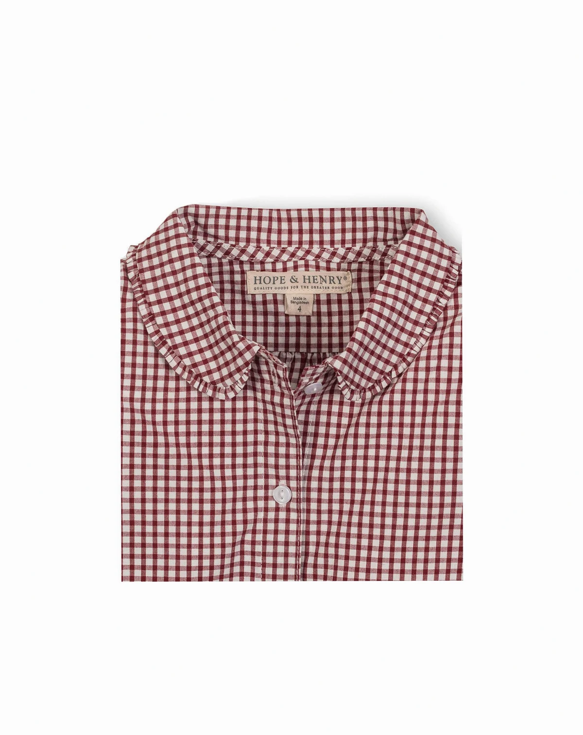 Our sweet button down shirt in a crisp organic cotton woven fabric is a shirt she'll be wearing all season long. Features a peter pan collar, pearlized button closure at the center front, and delicate gathering at the sleeves and back. Layers perfectly with our collection of organic cotton sweaters or jumpers.