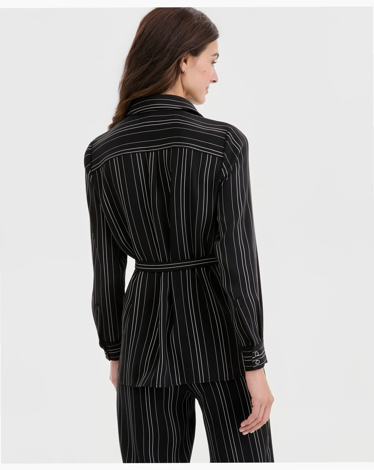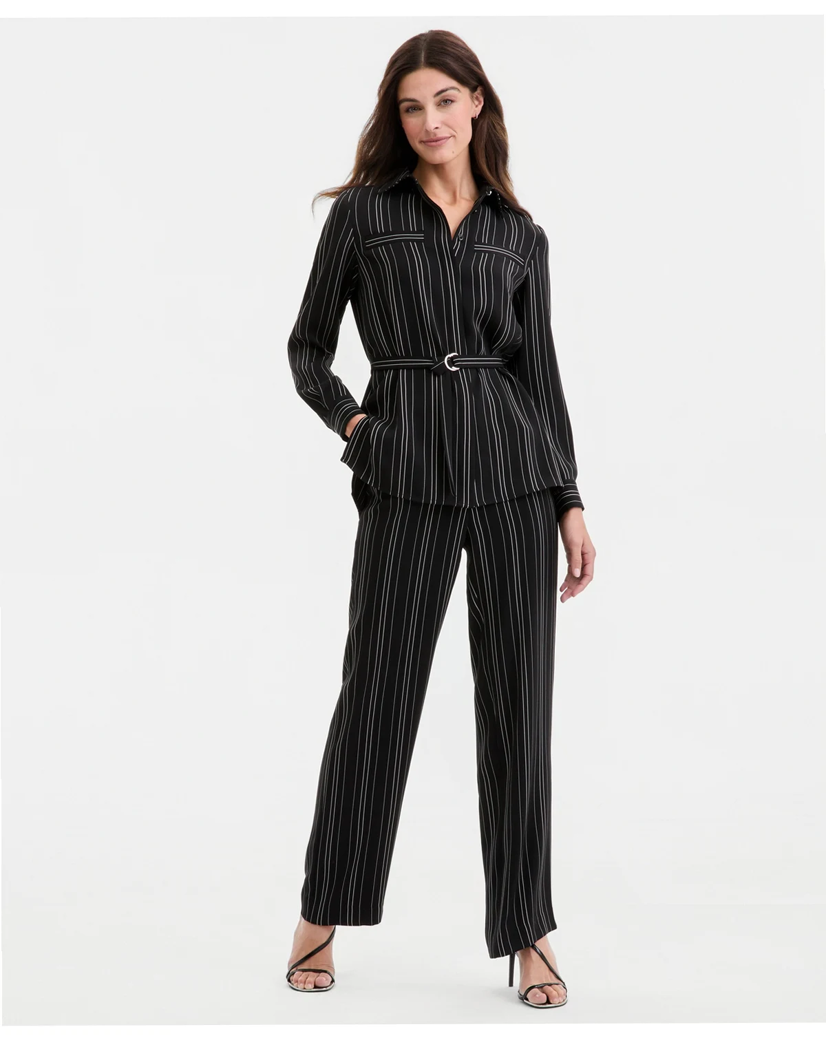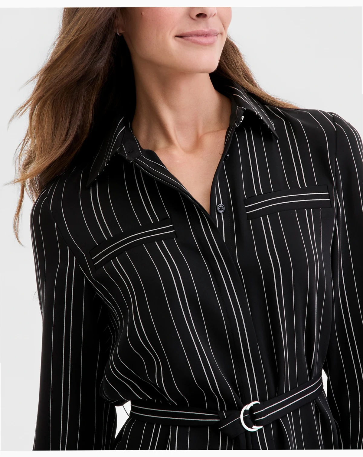 Effortlessly chic and endlessly versatile, this striped blouse by Anne Klein is the perfect blend of classic silhouette and modern femininity. Vertical stripes and a customizable tie waist create a silhouette that is as flattering as it is comfortable
