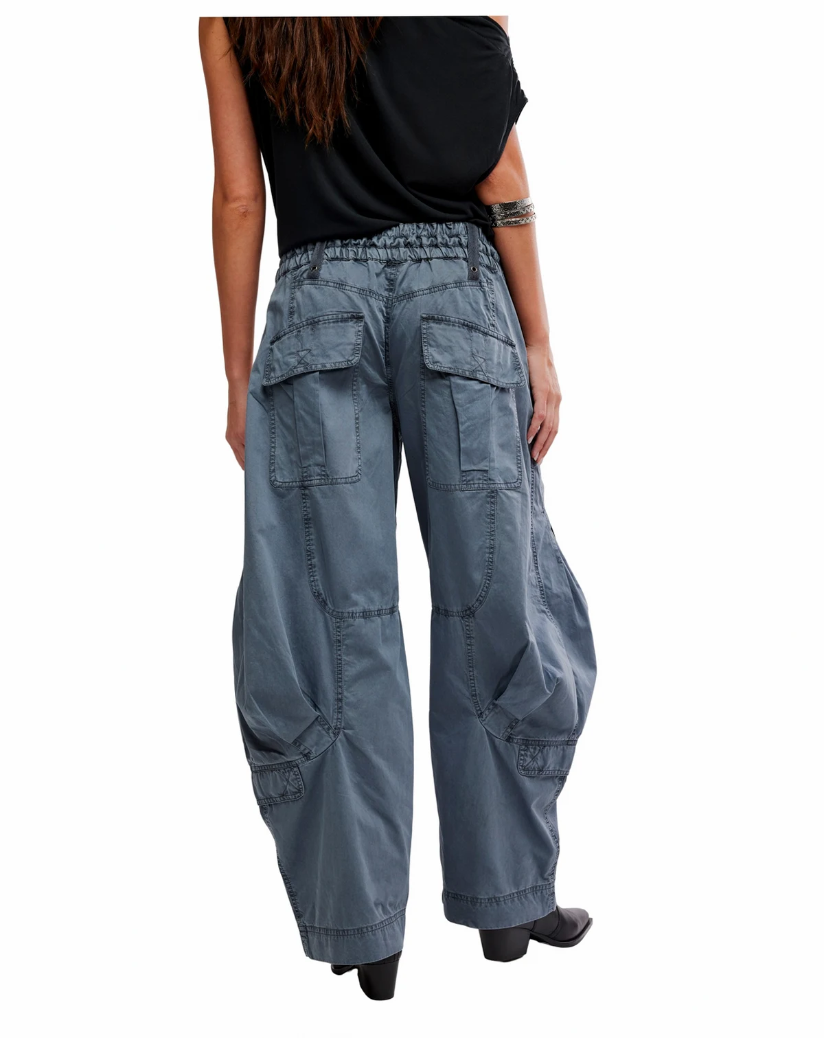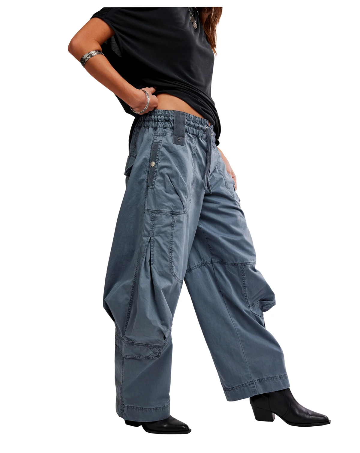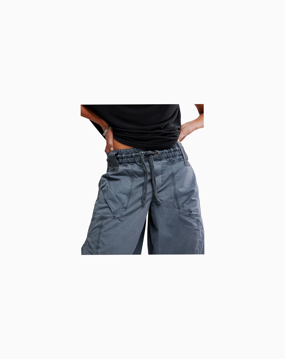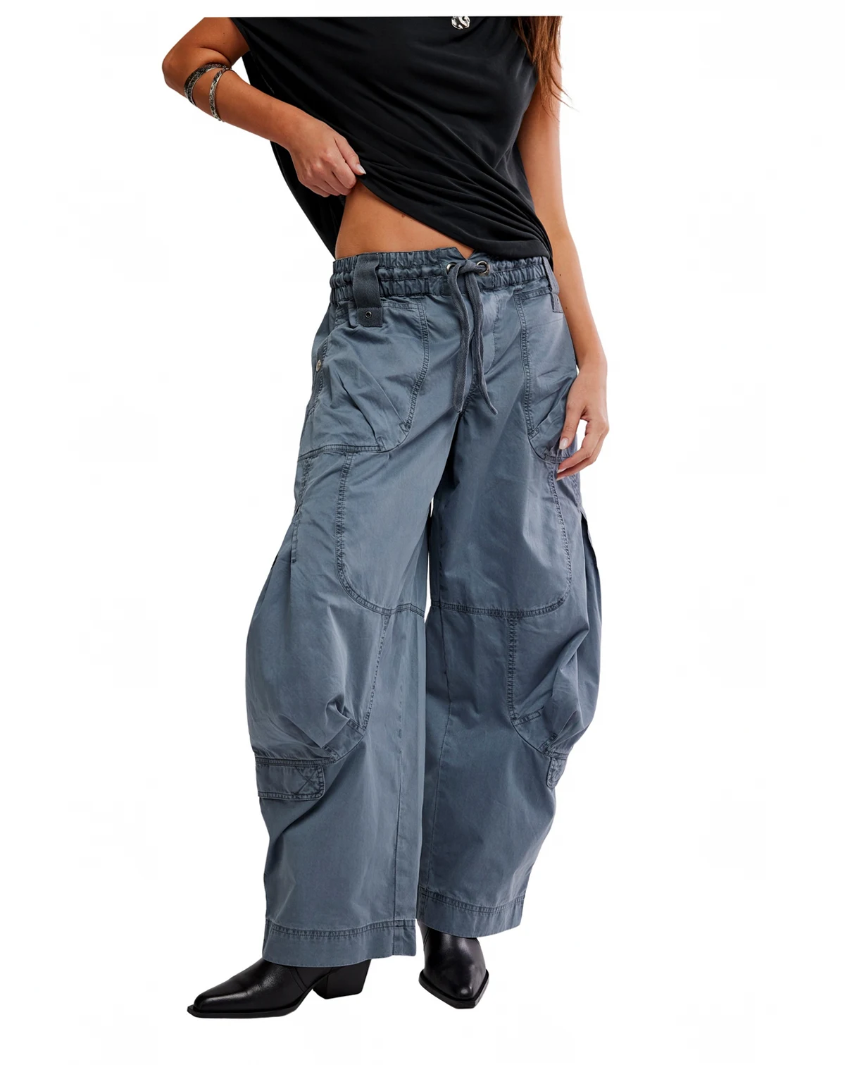 Enjoy laid-back utility style with these pants from Free People, featuring a billowy, parachute design and elastic waistband with drawstrings. Cargo pockets throughout add a functional, casual touch. ABOUT THE BRAND: If you love the laid-back charm of boho-chic apparel, you'll find a beautiful selection from Free People at Macy's that suits your style. From ultra-feminine dresses to cute tops, browse the collection of casual, hip designs.