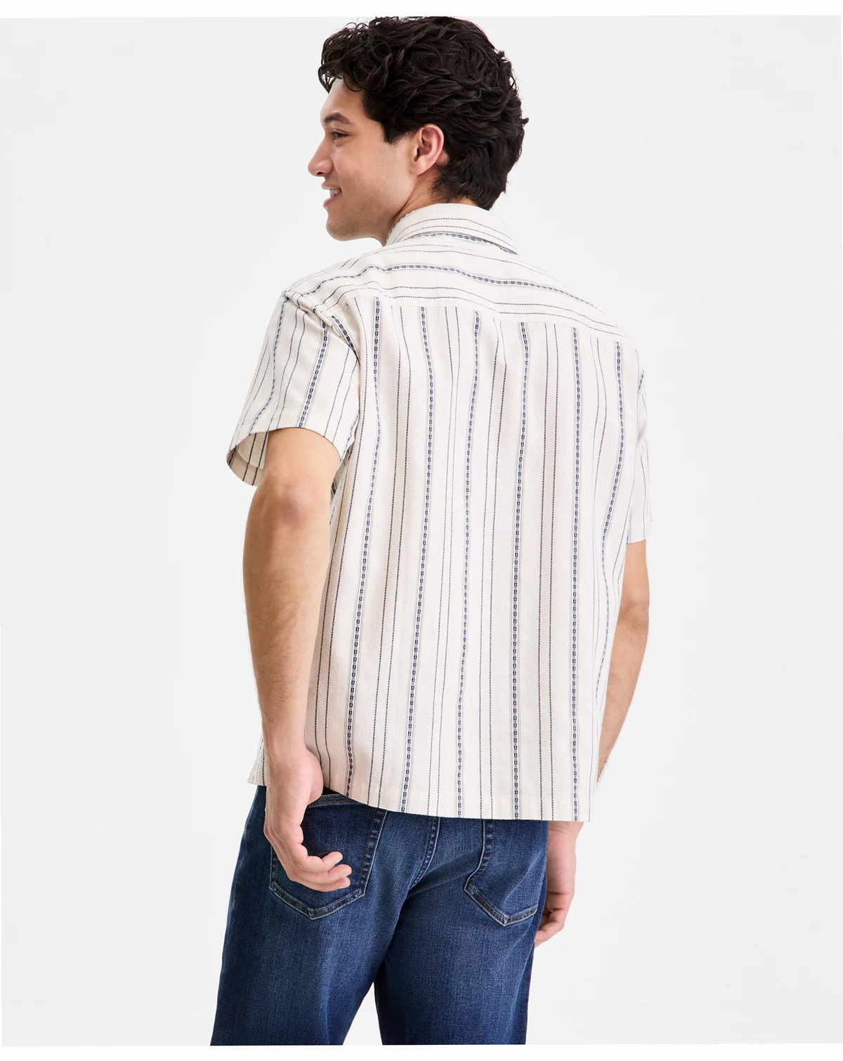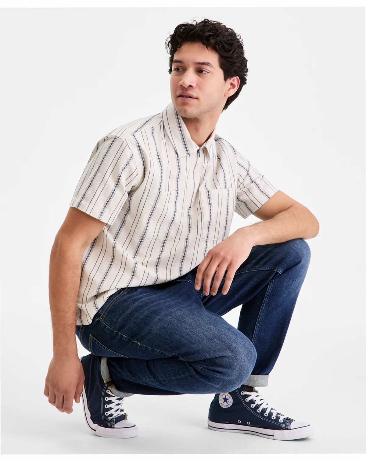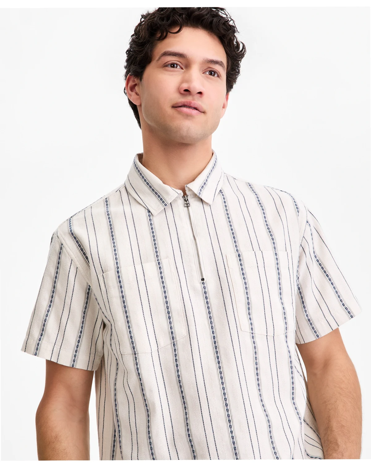 A quarter-zip closure freshens this look from Sun + Stone, a breezy cotton shirt with allover stripes that updates your casual collection.