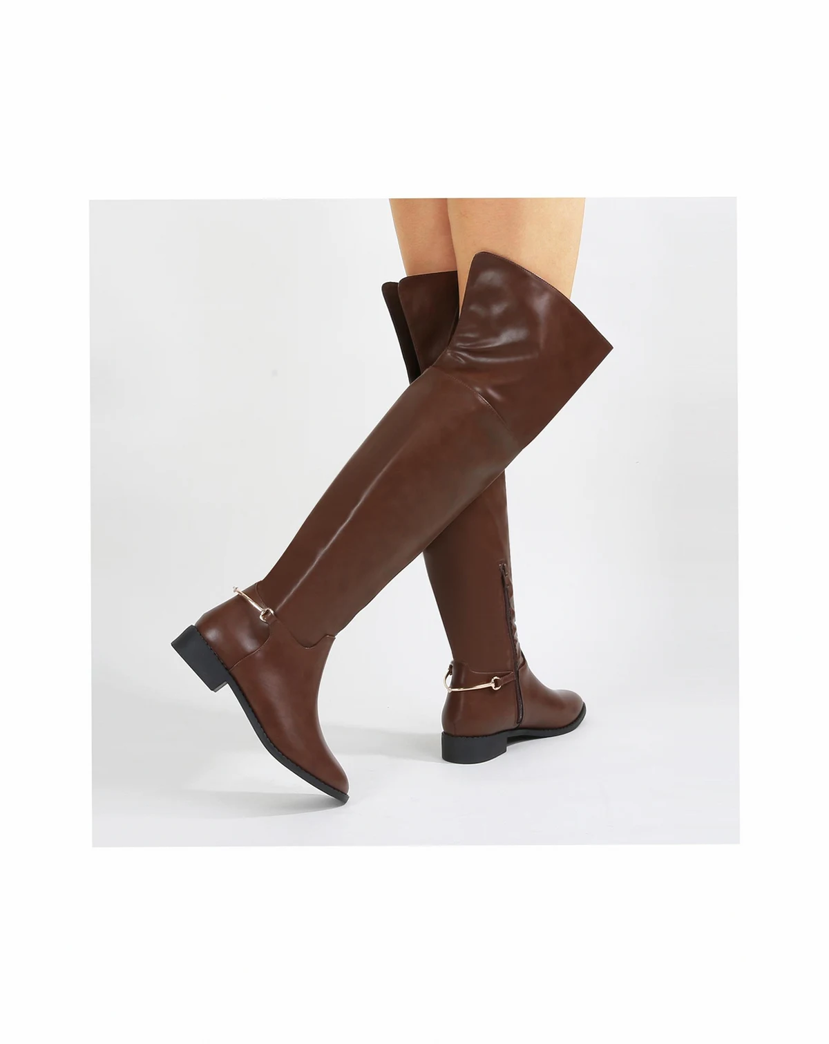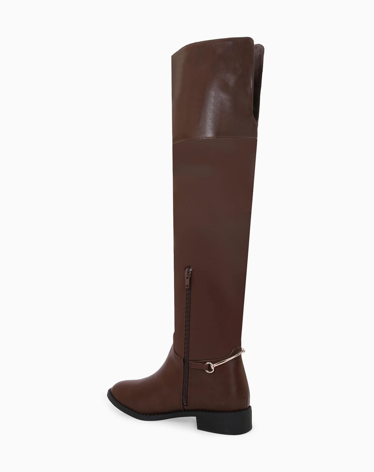 Elegance meets everyday edge in Berness Hern boots. These over-the-knee boots feature a smooth tall shaft and polished metal bit detail atop a thick rubber sole.