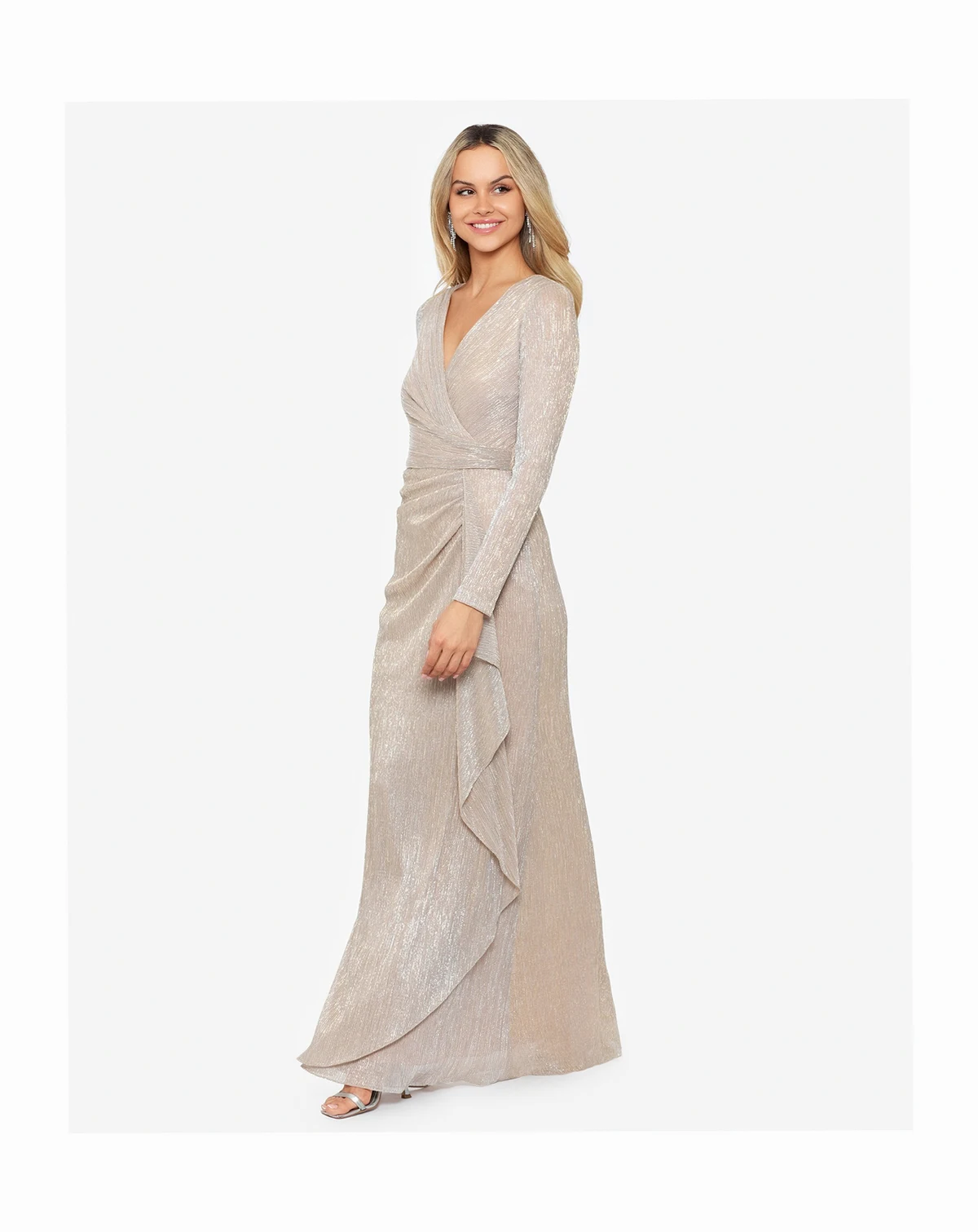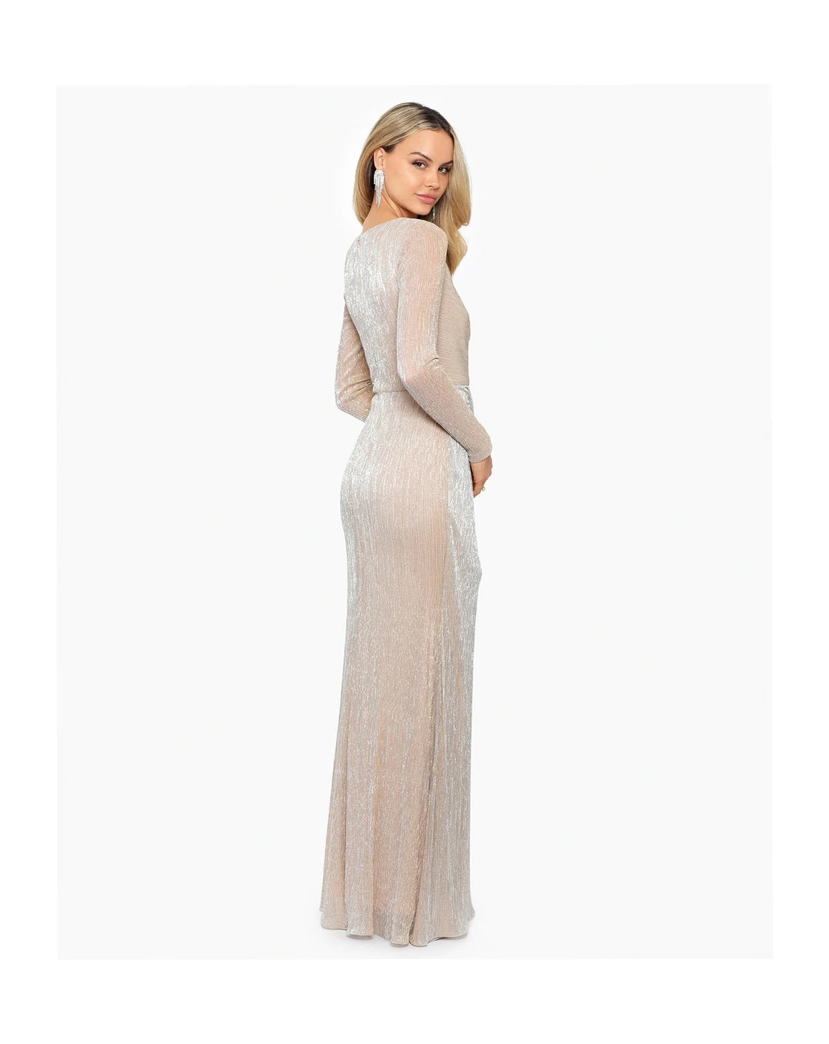 Shell: 60% polyester, 40% metallic; lining: 100% polyester; IMPORTANT NOTE: This item arrives with a return tag attached and instructions for removal. Once the tag is removed from the dress, this item cannot be returned.
