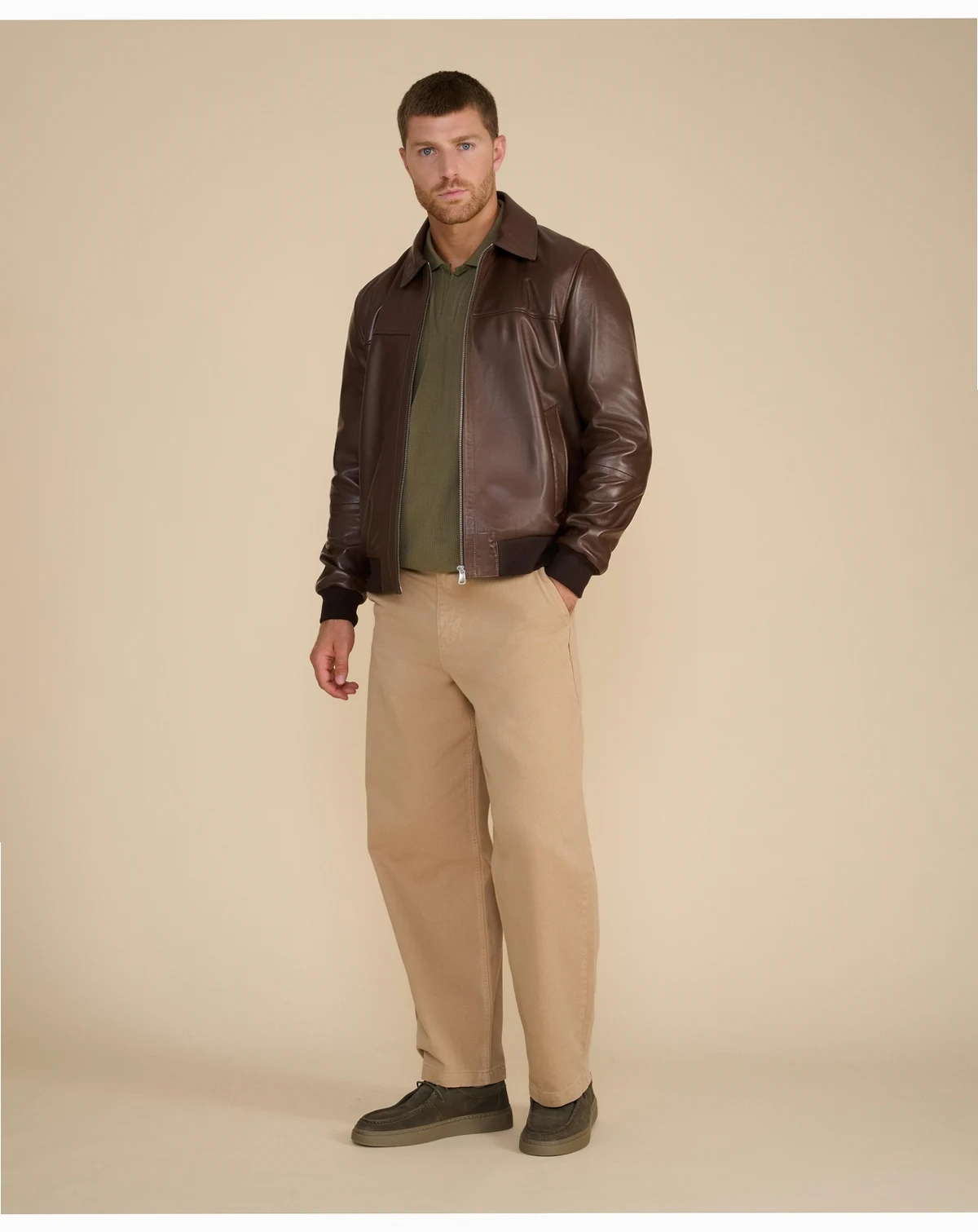 Striking the perfect balance between statement and sophistication, this Furniq UK leather bomber jacket is a bold update to a timeless silhouette. Cut from supple, full-grain nappa leather in a rich brown hue, it delivers a sleek look with a luxuriously smooth finish. The ribbed hem and cuffs add structure and comfort, while the classic collar and streamlined design ensure daily wear