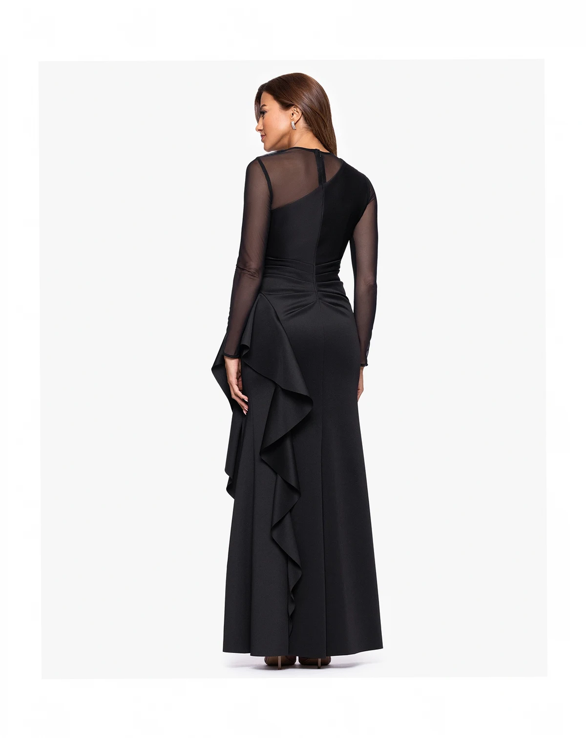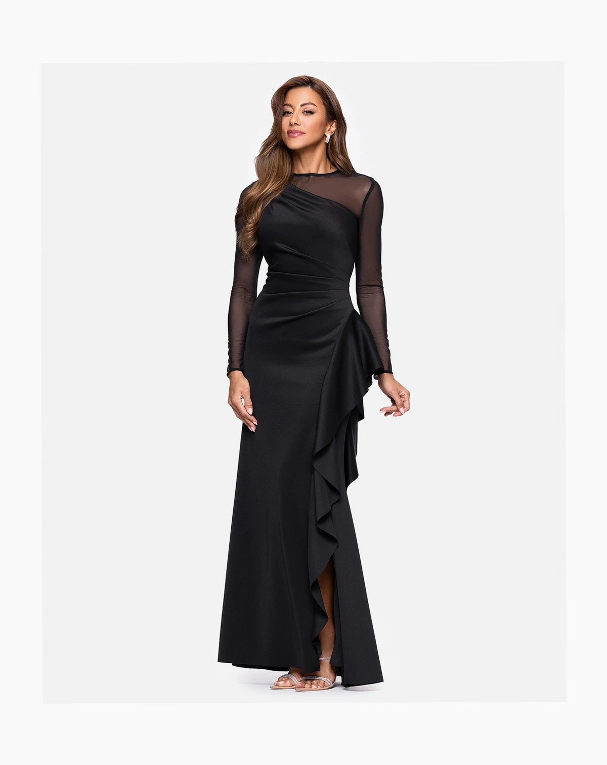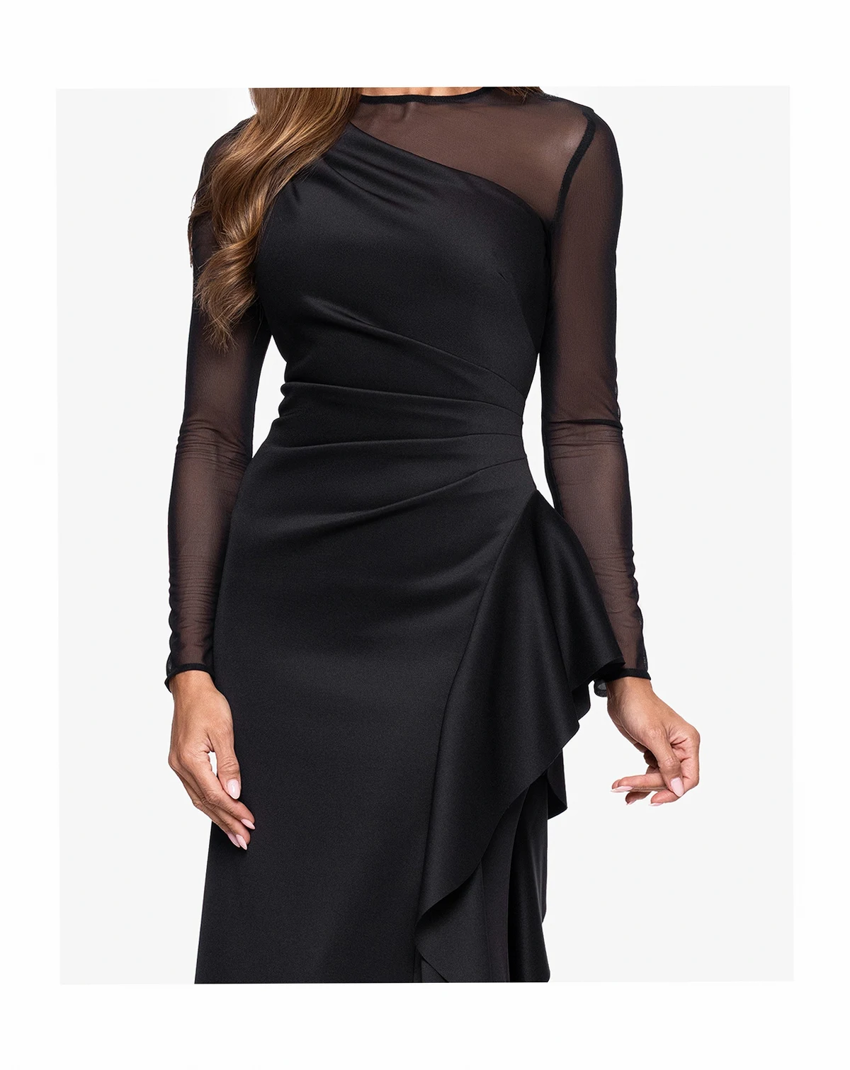 Embrace contemporary elegance in this XSCAPE dress, styled with sleek mesh panels for a touch of modern flair. Long sleeves offer refined coverage, while a concealed back zipper keeps the silhouette clean and polished.