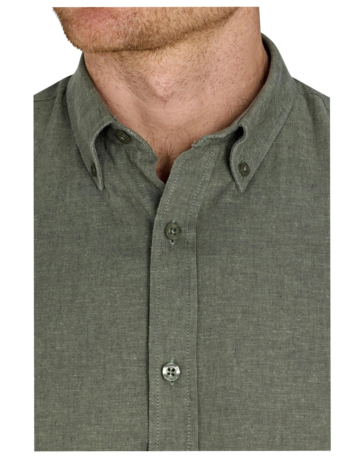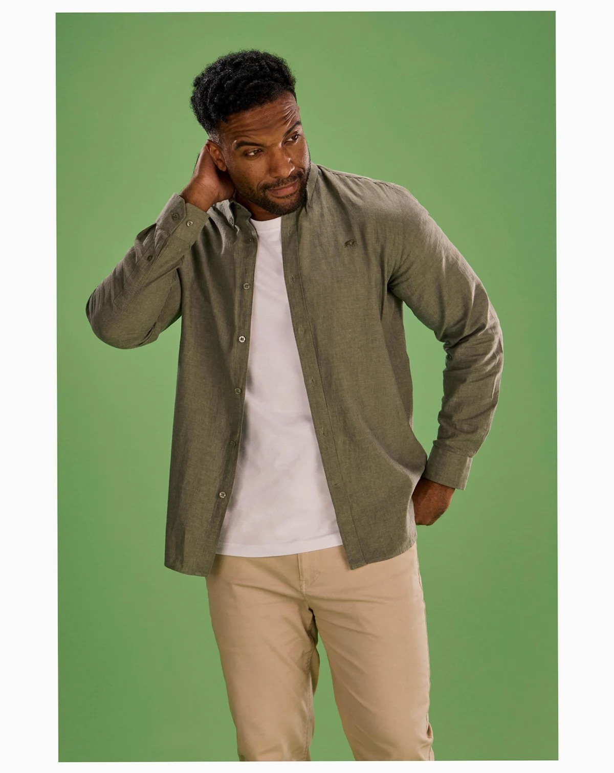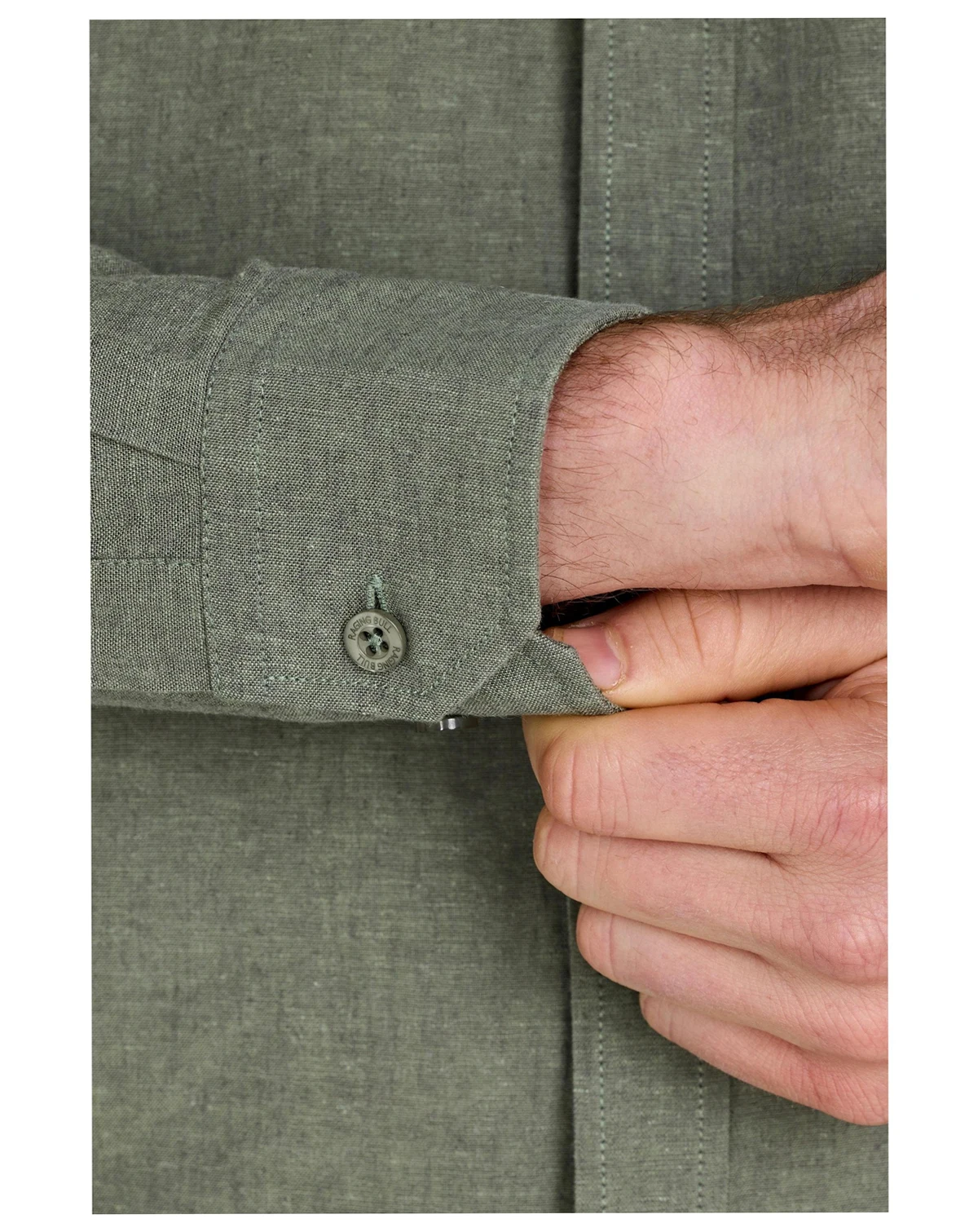 This men's premium linen cotton blend shirt in olive green is tailored to provide a classic, stylish, and smart or casual look. Its lightweight and breathable fabric offers comfort and durability, perfect for any occasion. With buttoned cuffs and a buttoned collar, this full length button up shirt exudes quality and longevity. Machine washable for convenience, it features an embroidered Raging Bull logo on the chest for a touch of sophistication.