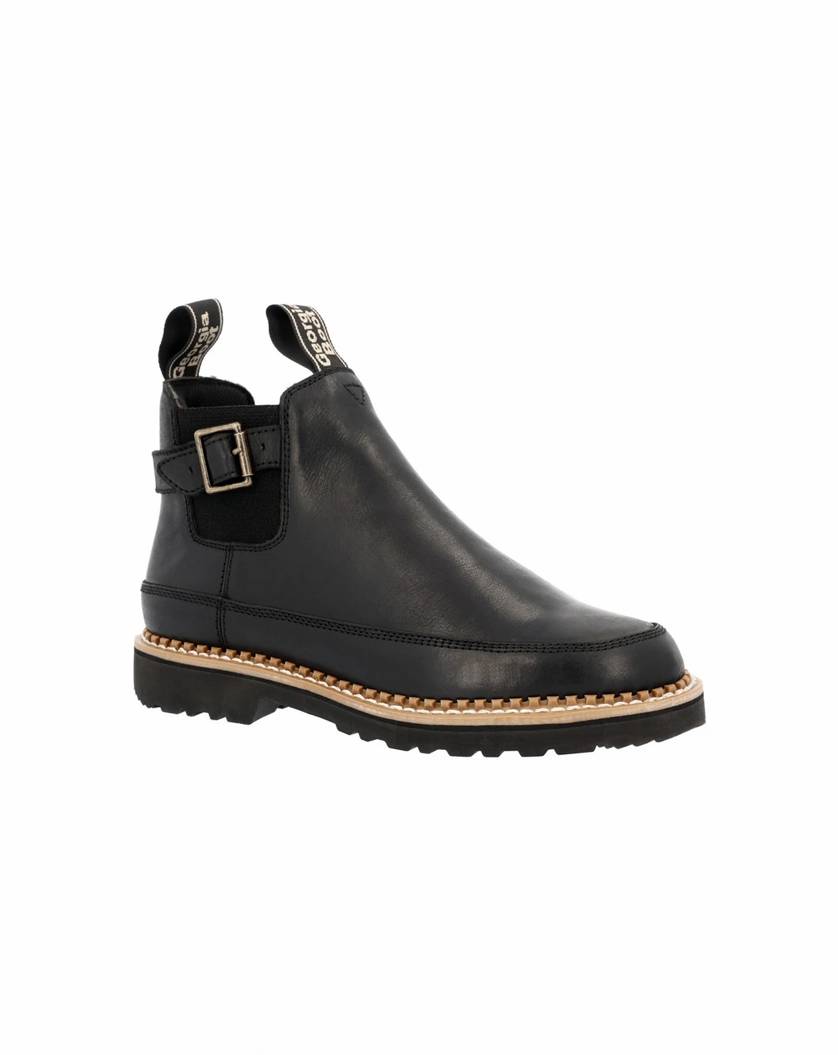 This limited edition Chelsea-style Romeo boot, by Georgia Boot, is the perfect addition to your wardrobe! It features a black leather upper with twin gore panels for easy on/off and a fashionable buckle for styling.The lined interior has a removable memory foam insole for added cushioning comfort. The polyurethane outsole is oil- and slip-resisting and includes a steel shank for added arch support. This women's Chelsea boot has a notched welt construction, providing a durable foundation. Be sure to get this fashionable Romeo style before it's gone!.