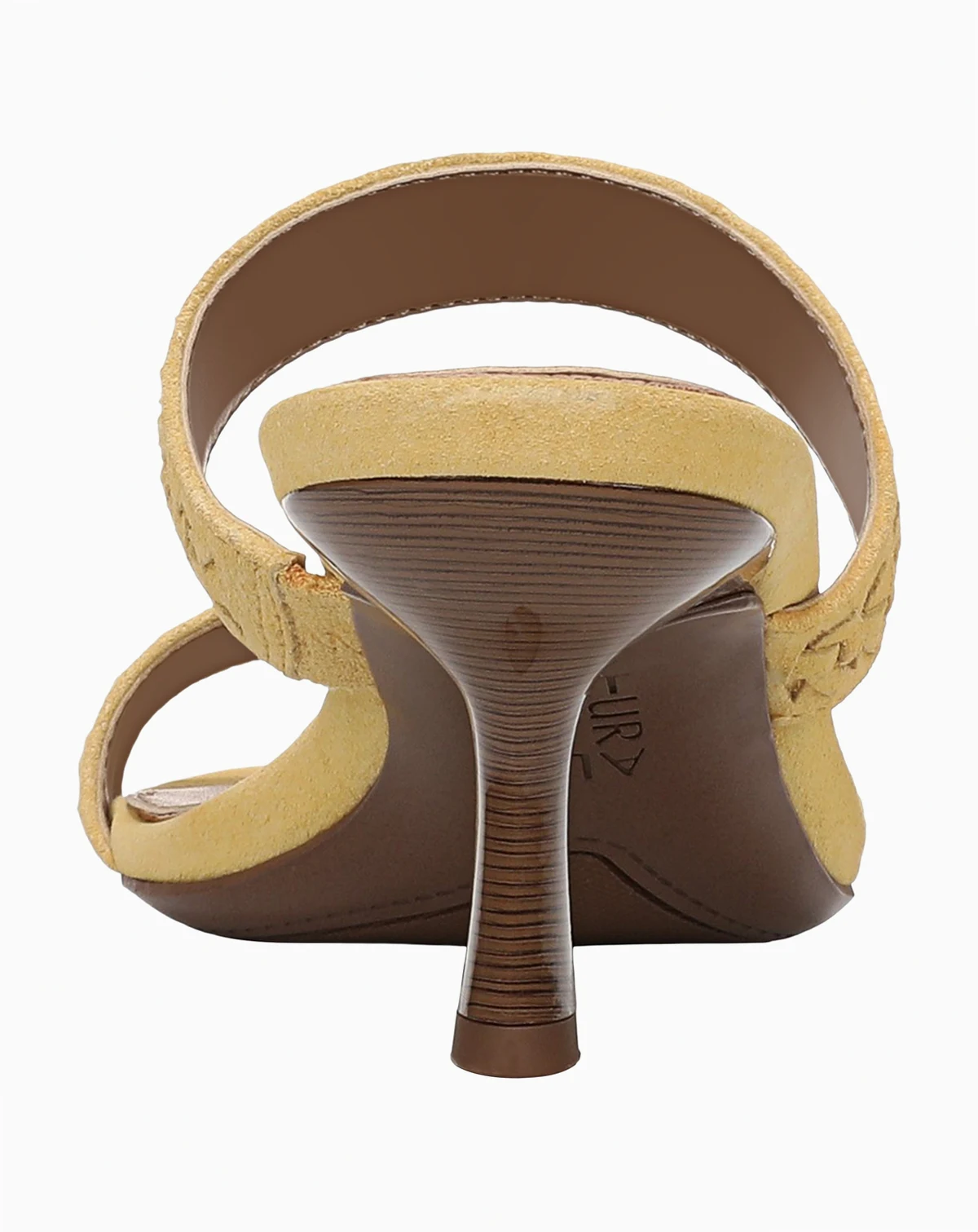 Heel height: 2.38 sculpted architectural heel; Slip on fit, slingback strap