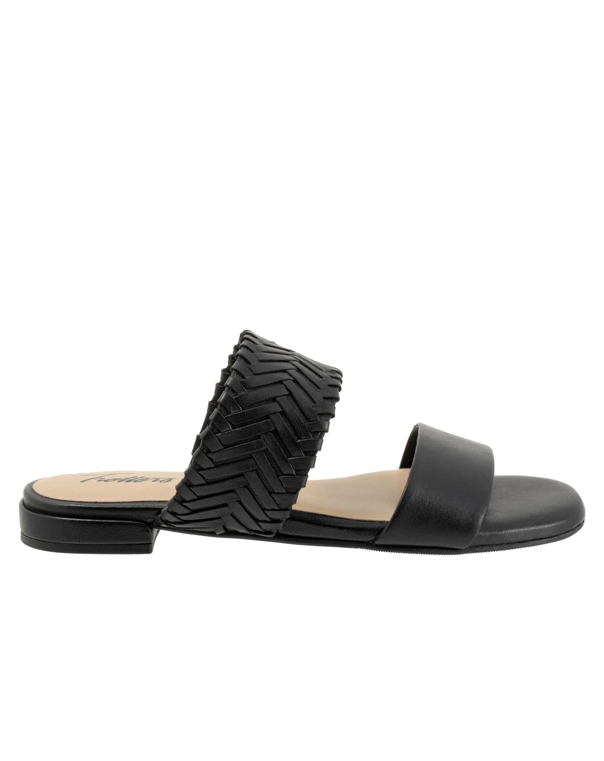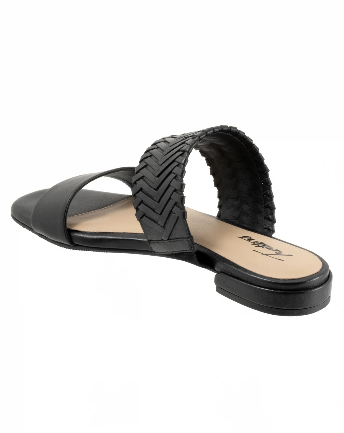 The Nalane sandal combines a smooth leather strap with a woven leather strap for a fun look. The woven strap has elastic goring on the instep and the lining is all leather for a super-comfortable sandal flat.