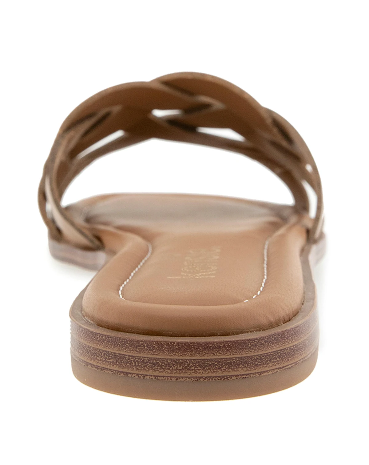 The Kensie Rima is a flat sandal with a cushioned footbed and a braided upper, offering an easy slip-on comfort with a touch of casual elegance.