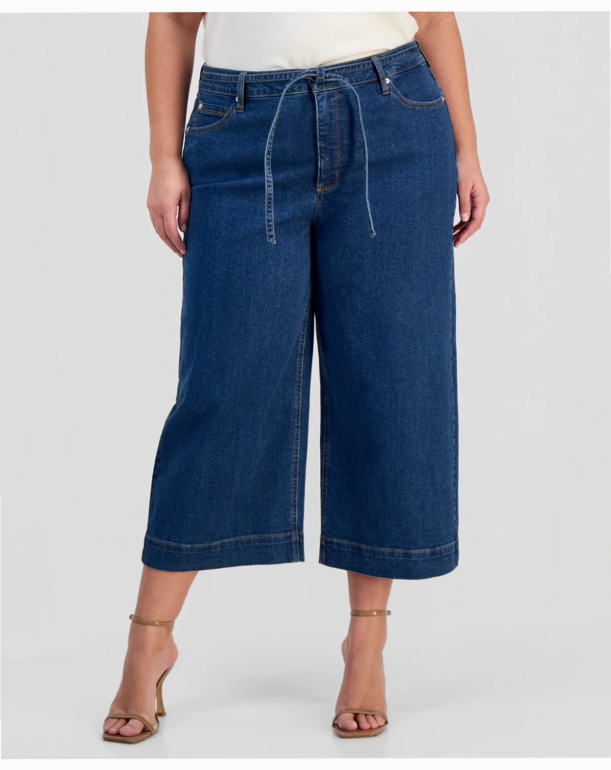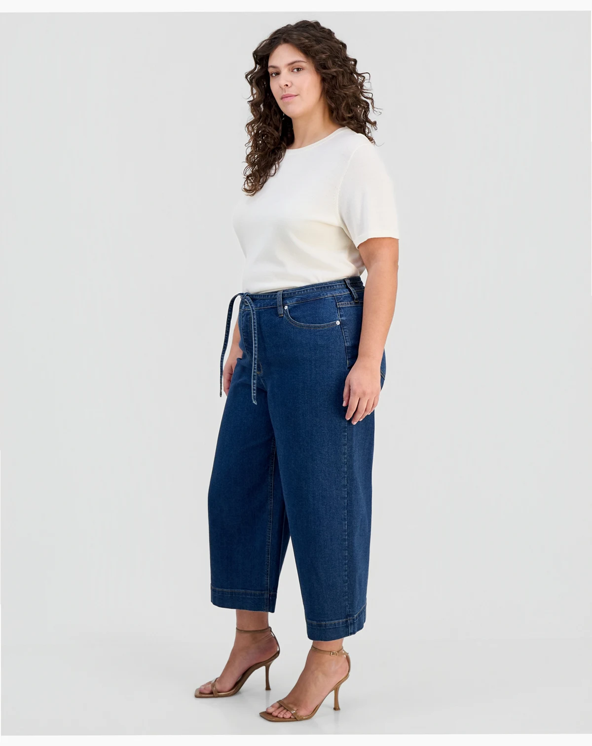 Accented with a matching self-tie sash at the waist, Anne Klein's plus size jeans give your casual tops a stylish base with their modern cropped wide leg silhouette.