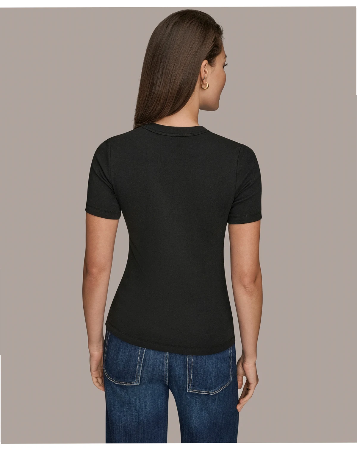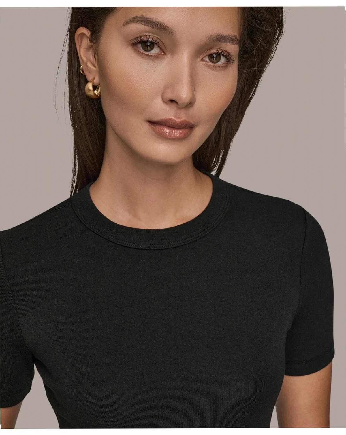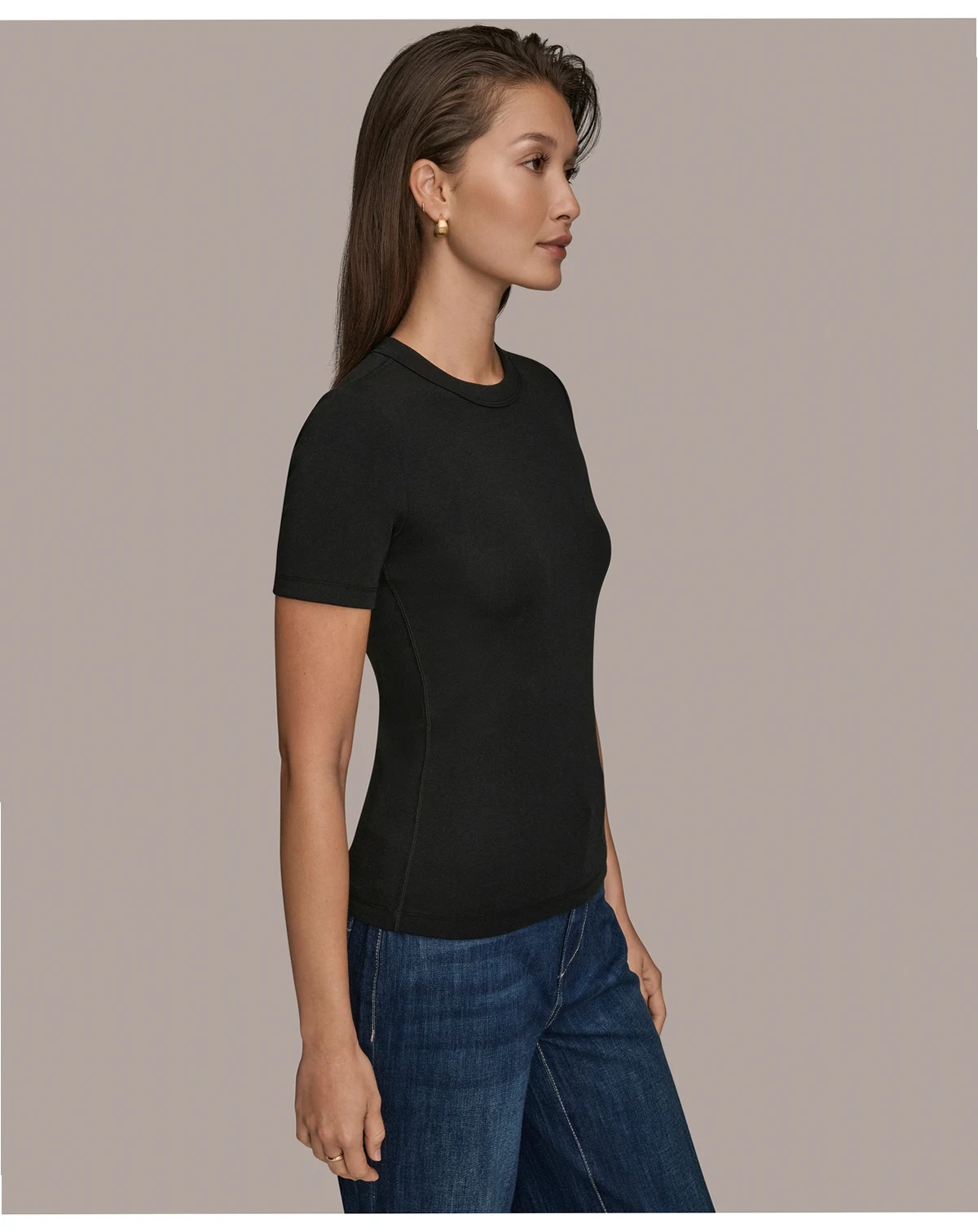 Casual sophistication defines the Donna Karan New York Women's Rib Short-Sleeve Crewneck T-Shirt, featuring a soft ribbed knit, classic crewneck, and short sleeves. Perfect for layering, weekend errands, or relaxing during vacation.