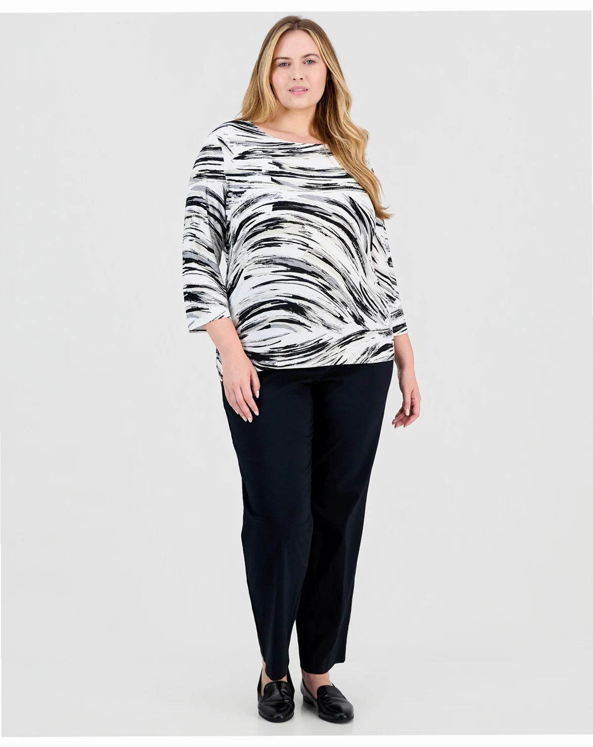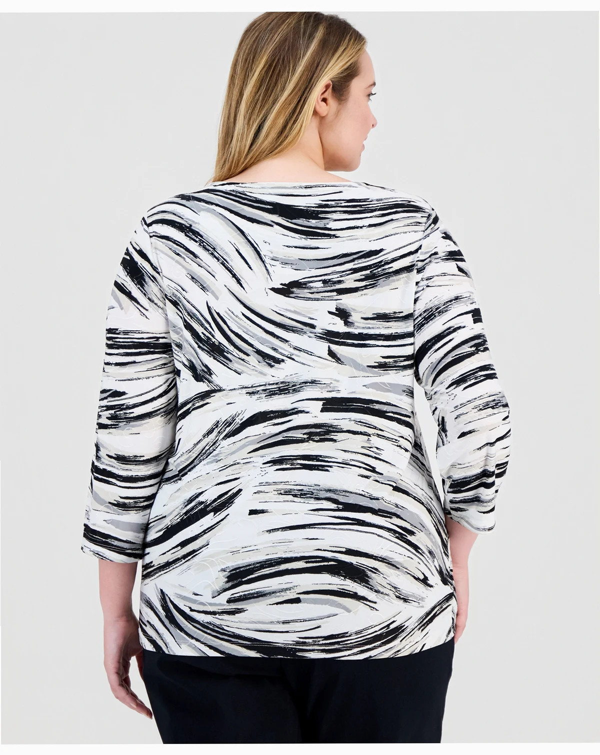 JM Collection adds depth to your look with a jacquard pattern over an abstract print on the plus size Beth top.