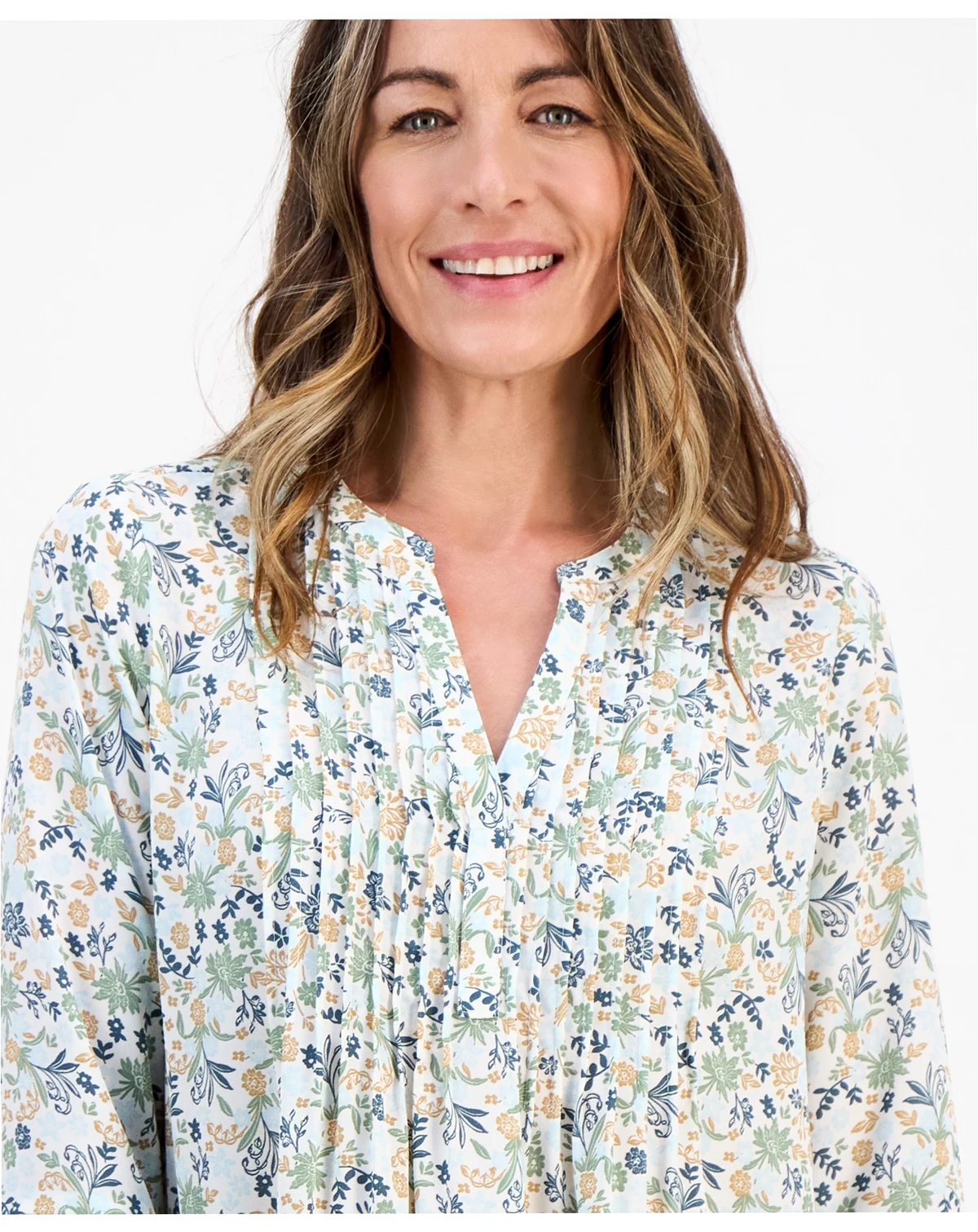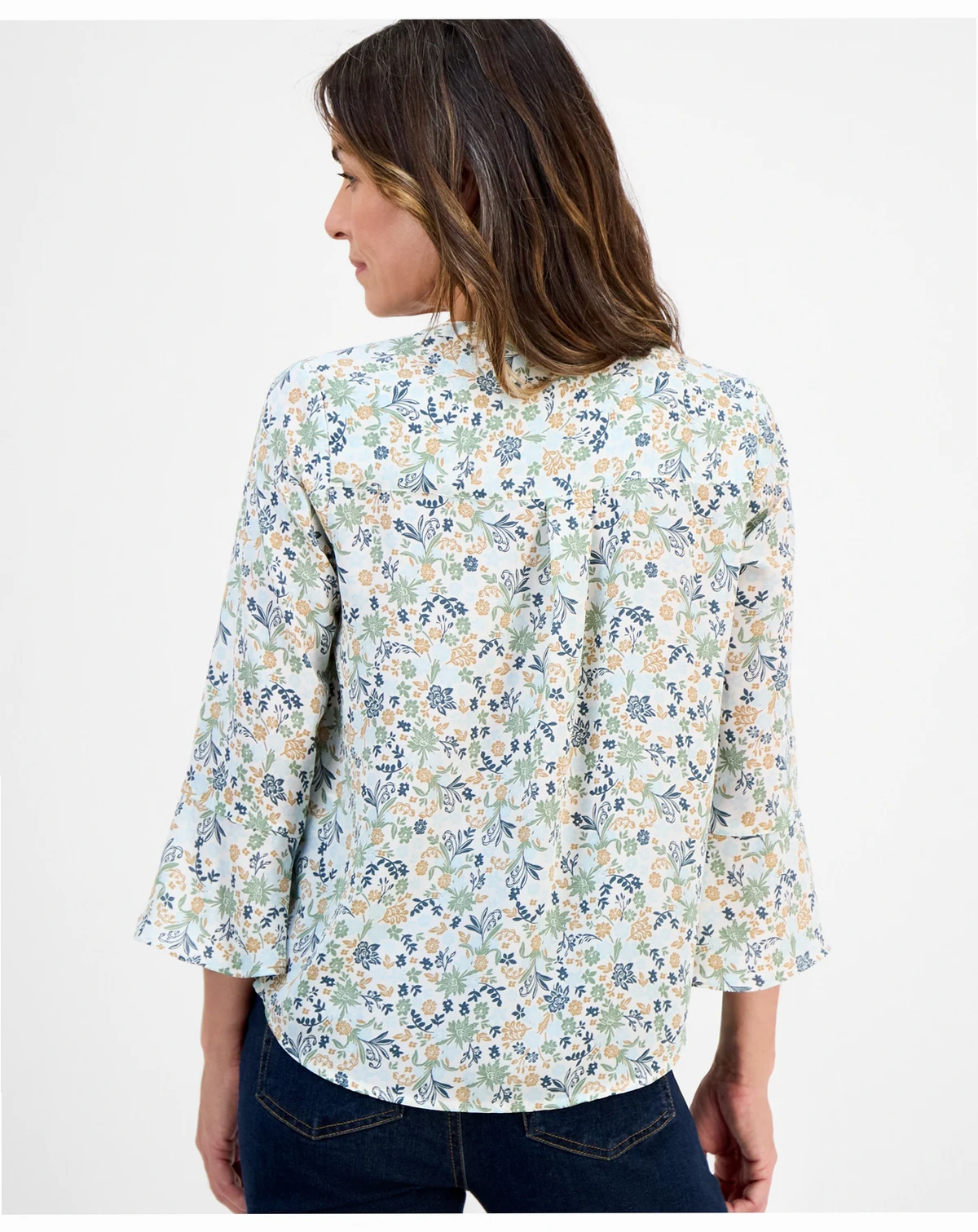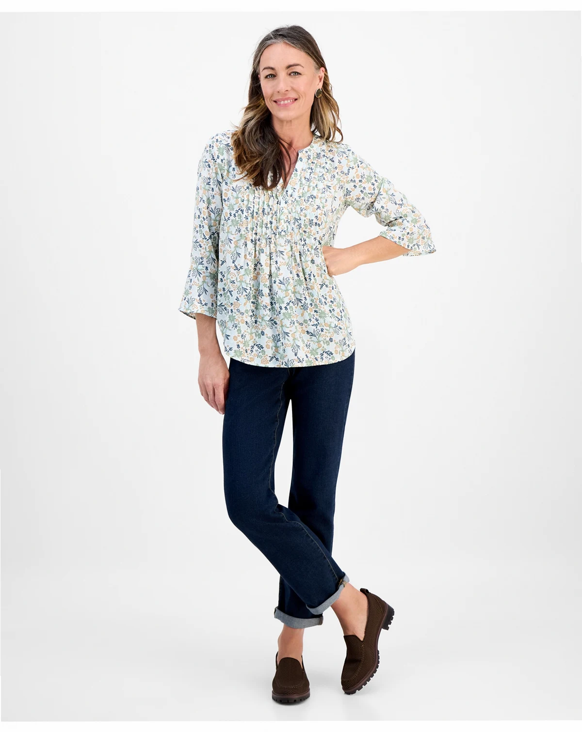 Fresh 3/4-sleeves are so charming on this petite floral top from Style & Co. Pintucks at the front give it added dimension.