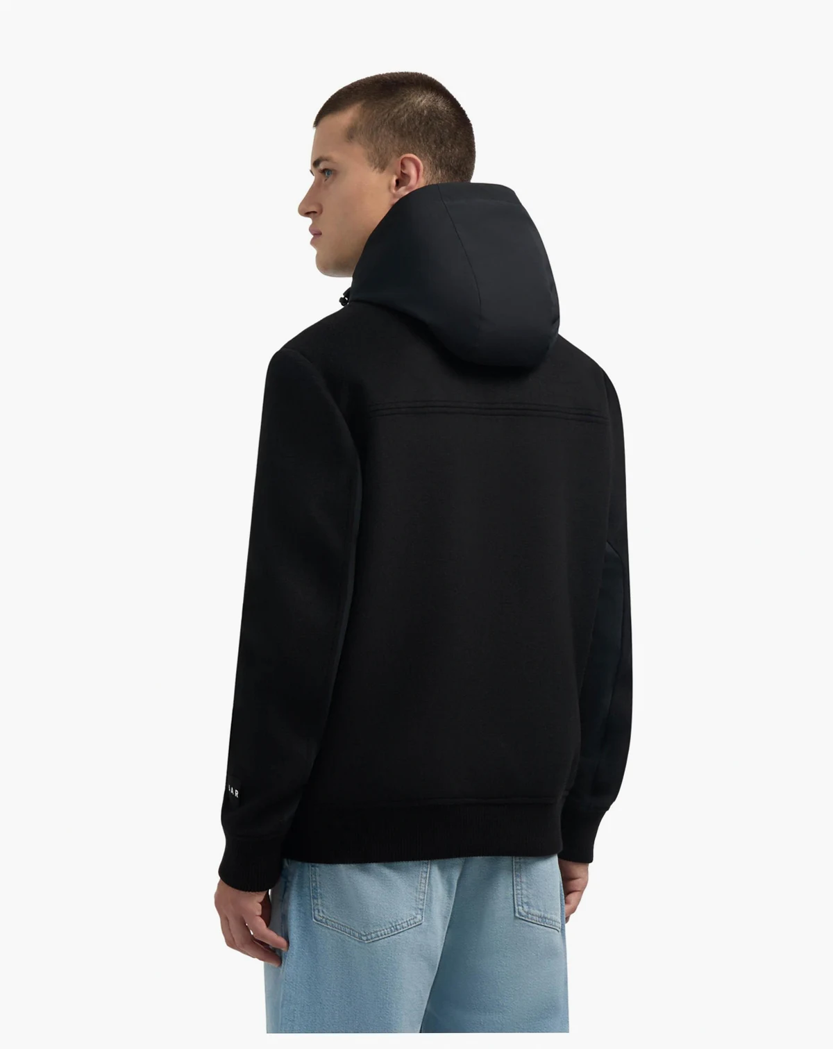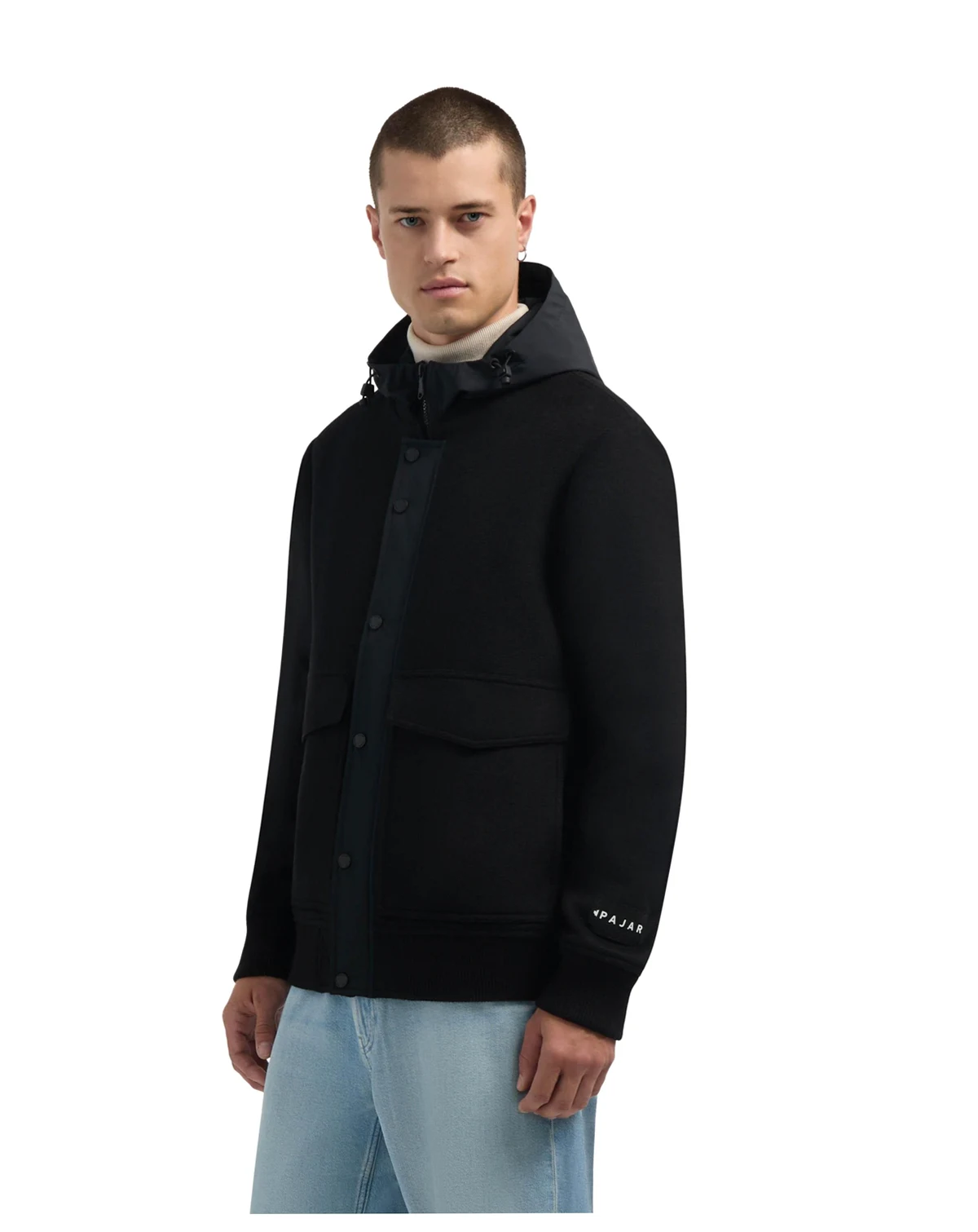 Men's Hader wool blend bomber jacket features a removable hooded bib with a zip closure. Designed with a snap front, large double-entry patch pockets, and rib knit cuffs and waistband for added warmth. Equipped with adjustable bungee cords on the hooded bib for a custom fit.