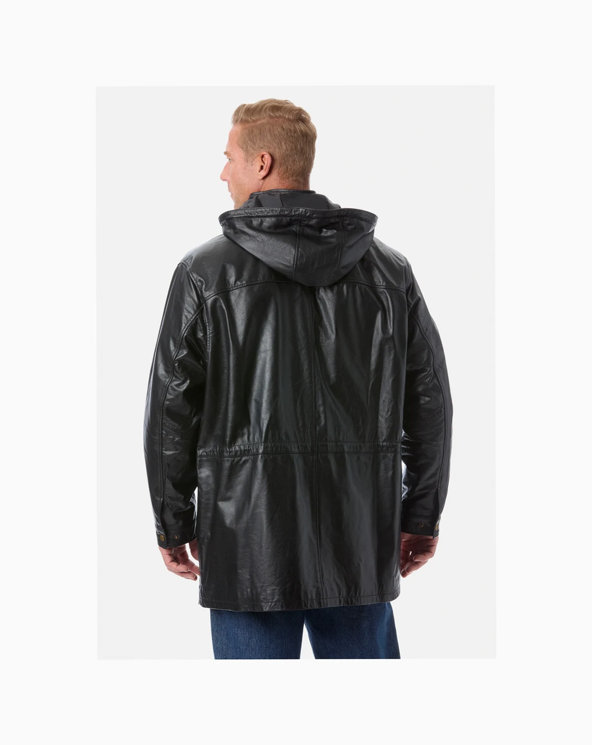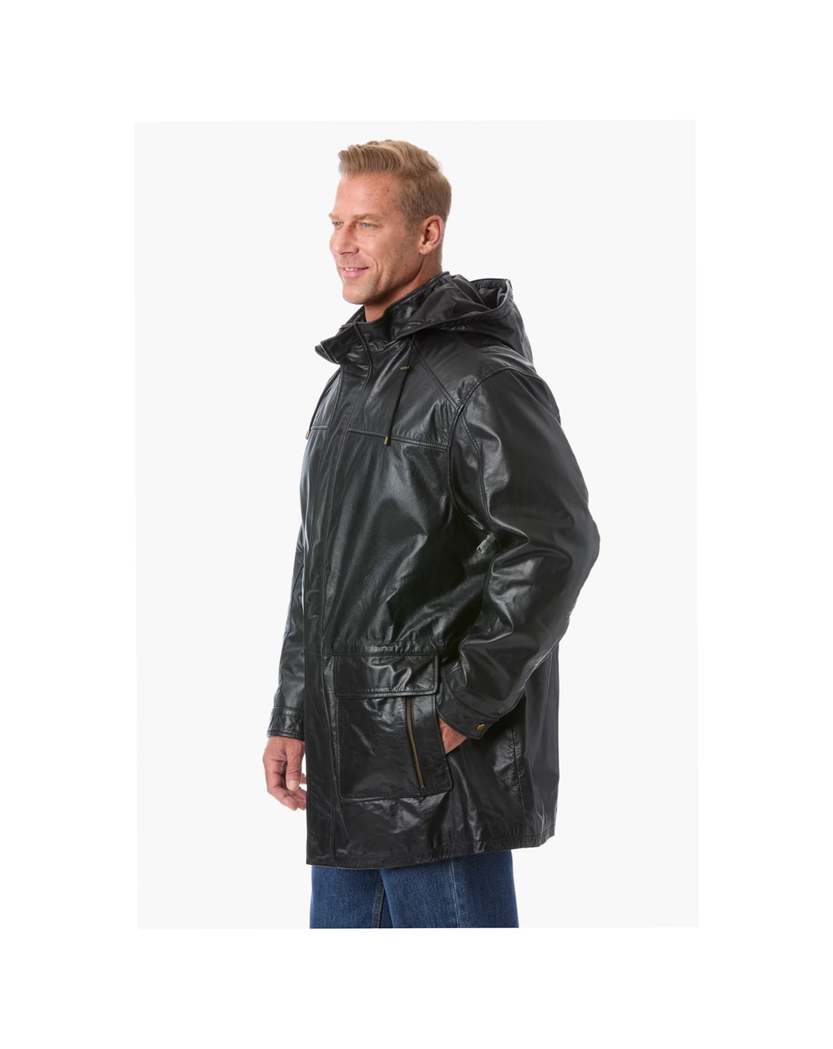 Combine comfort and style with ease in this Hooded Leather Parka. It's cut from a smooth genuine leather with a drawstring hood for those unpredictable downpours. Genuine leather Drawstring hood. Storm flap for extra protection. Dual flap pockets side-entry zip pockets. Adjustable cuffs Zip/snap closure. Professional leather clean imported Big length approx. 36". Tall length approx. 38"