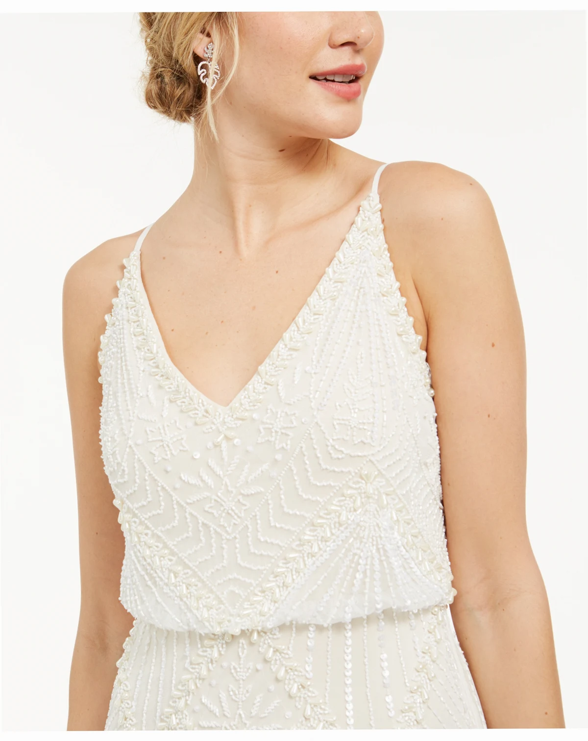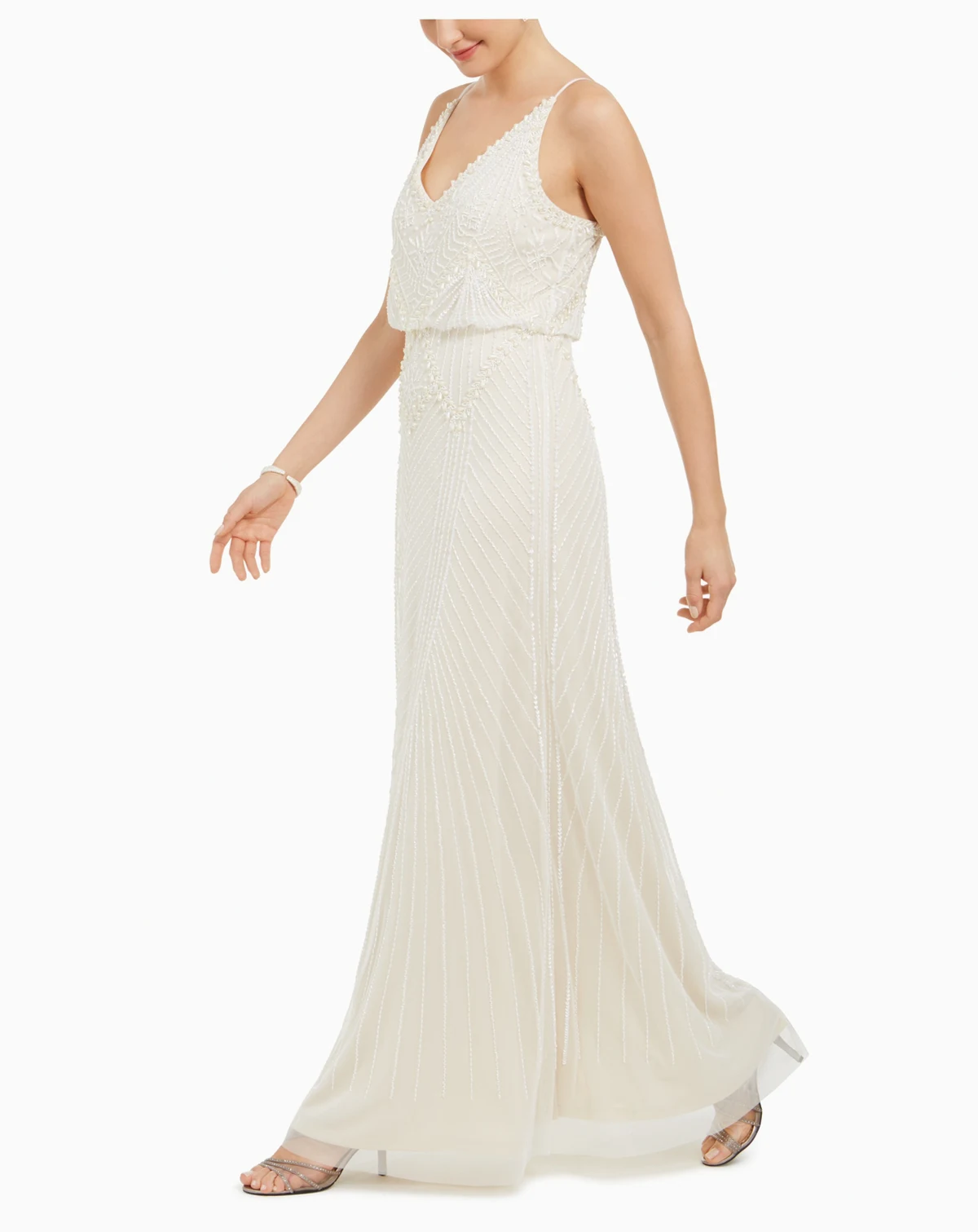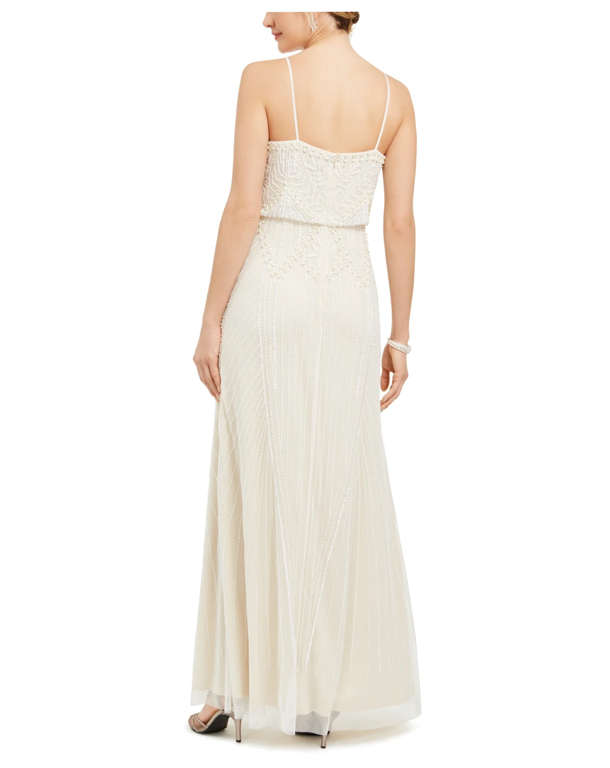 Enjoy a flowing silhouette in this blouson long dress from Adrianna Papell, featuring a crewneck. The graceful design, complemented by the longer length and delicate beaded details, creates a romantic and sophisticated look suitable for evening occasions or special events.