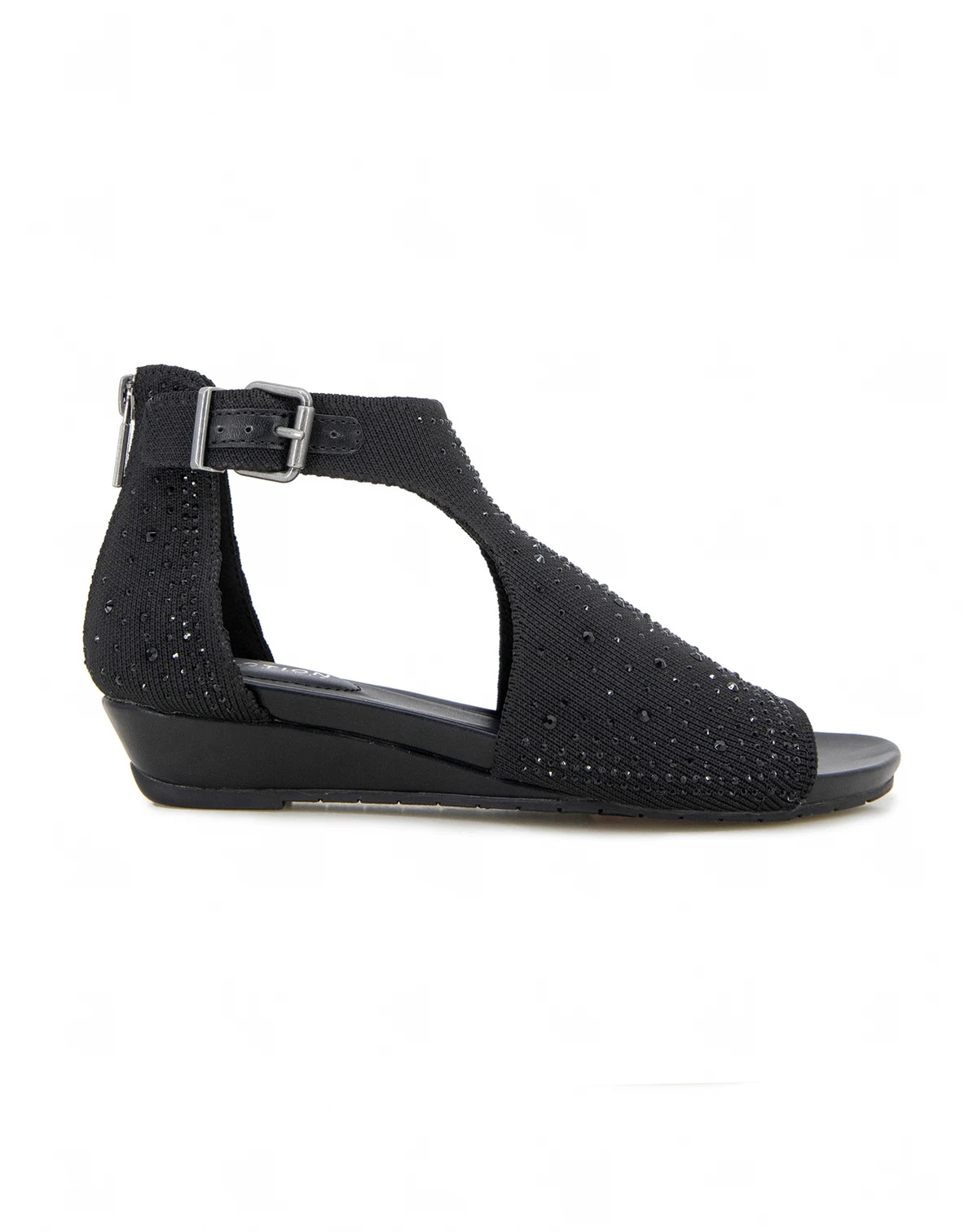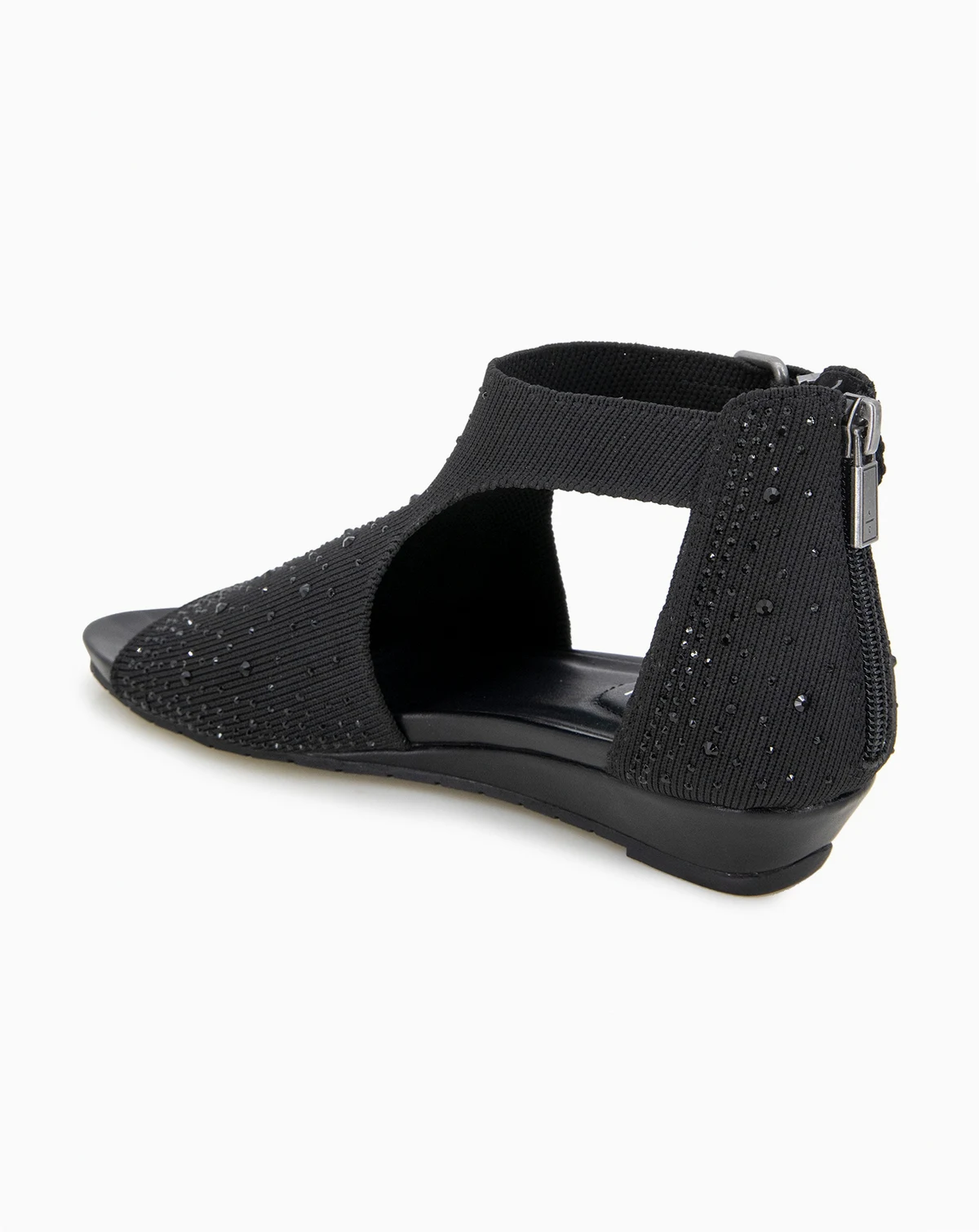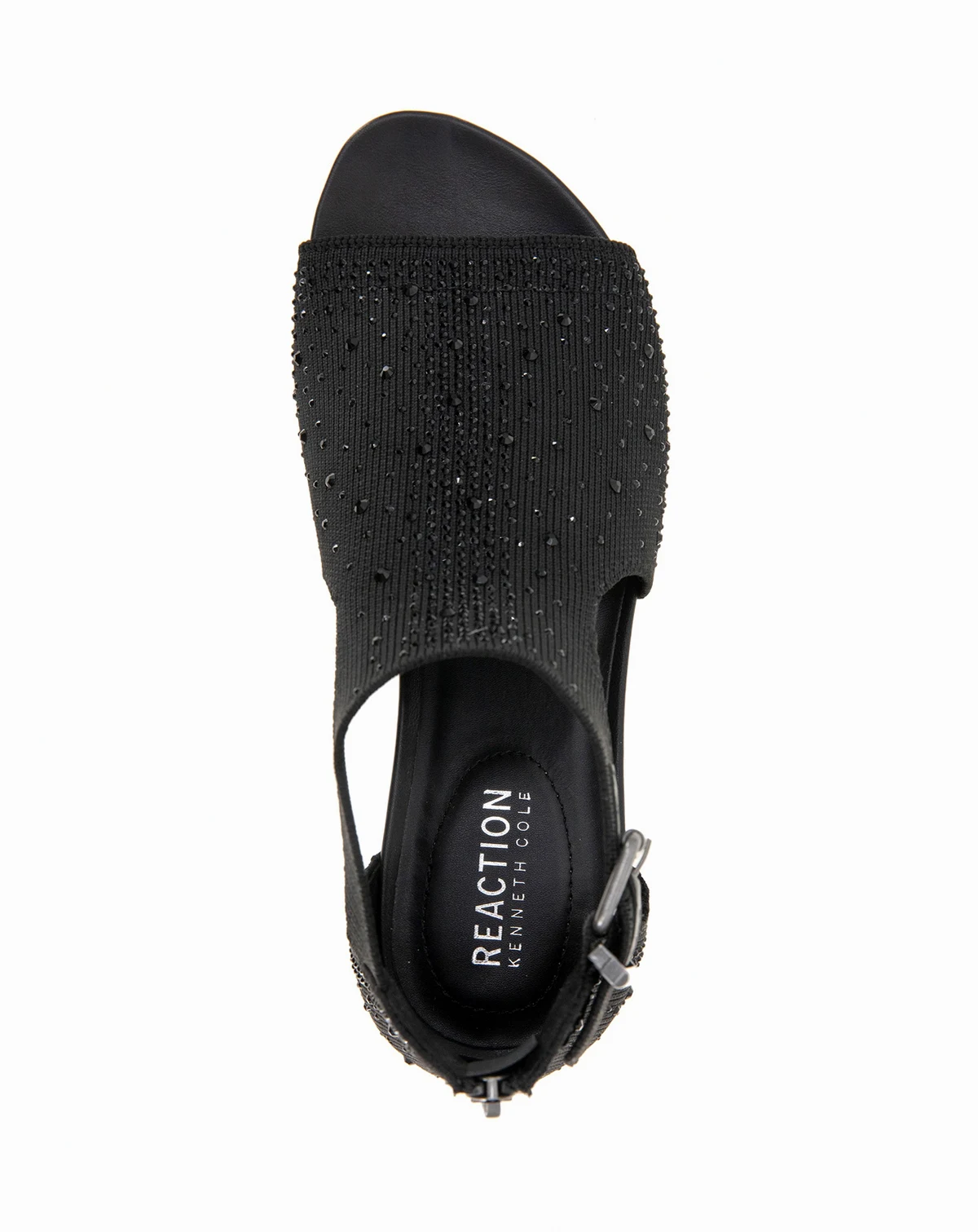 You will be sure to shine in the Kenneth Cole Reaction Gail Stretch. This low wedge sandal features a faux jeweled stretch hooded upper and a closed back with a zipper for easy on easy off. It also has a side buckle so you can customize fit to your foot.