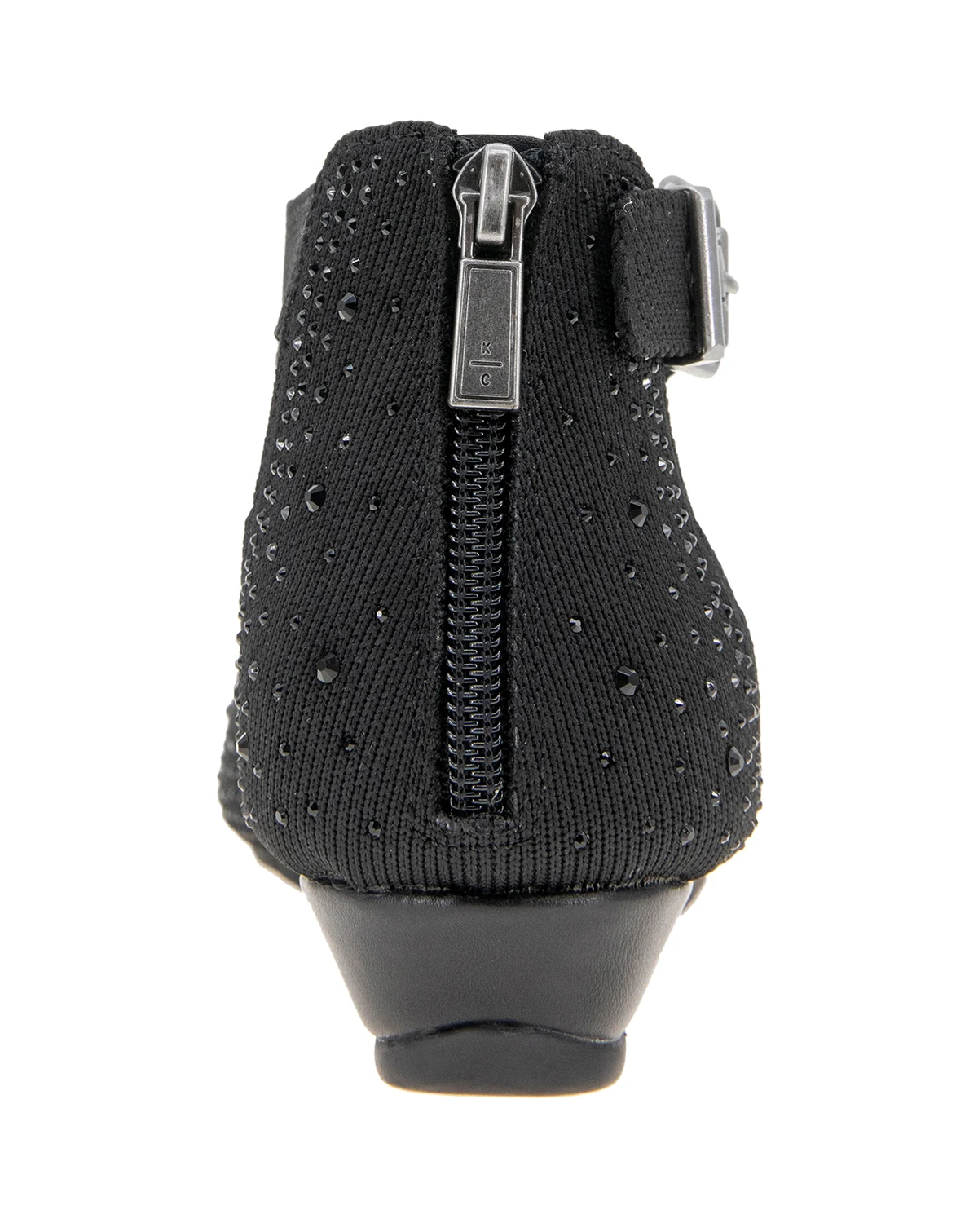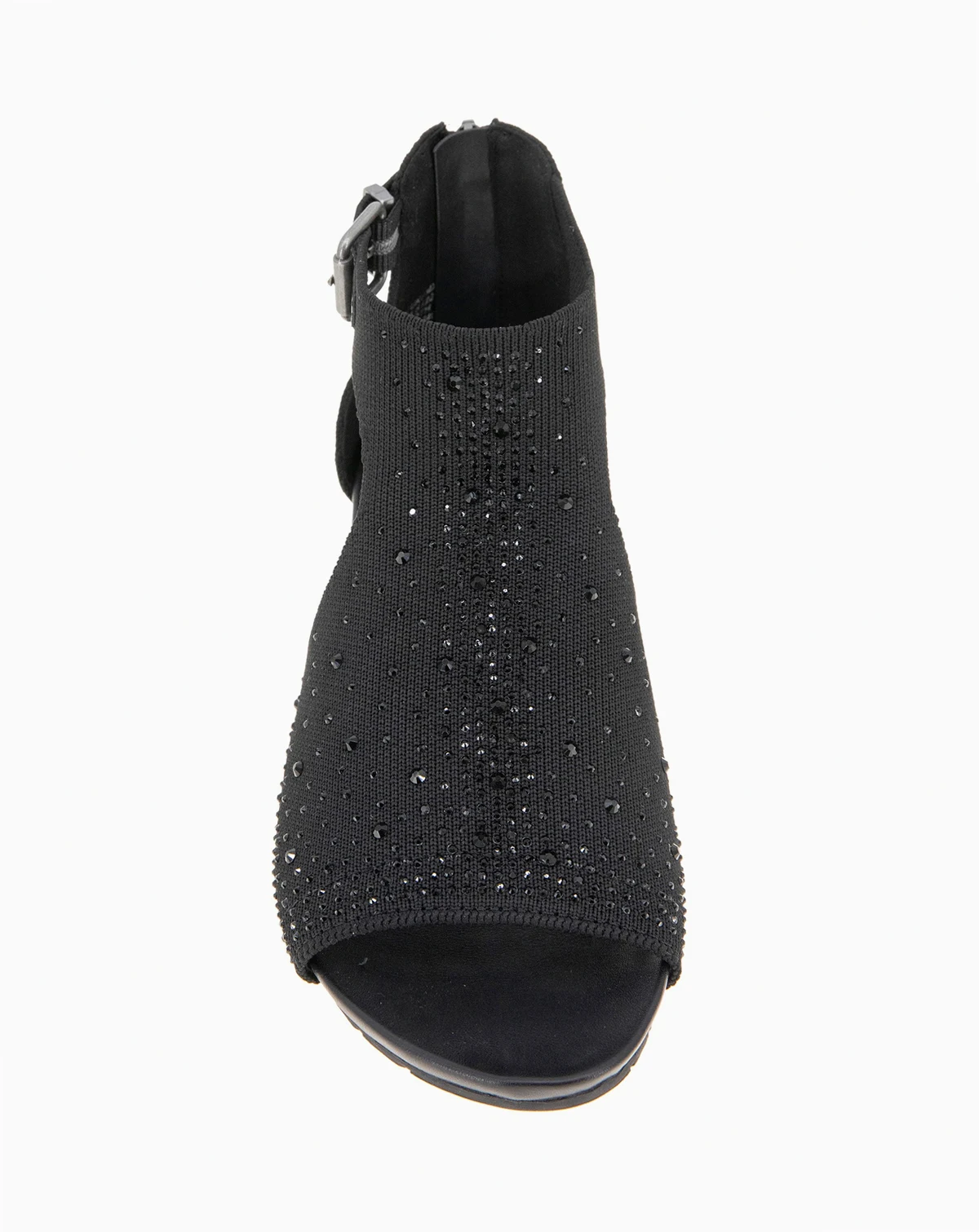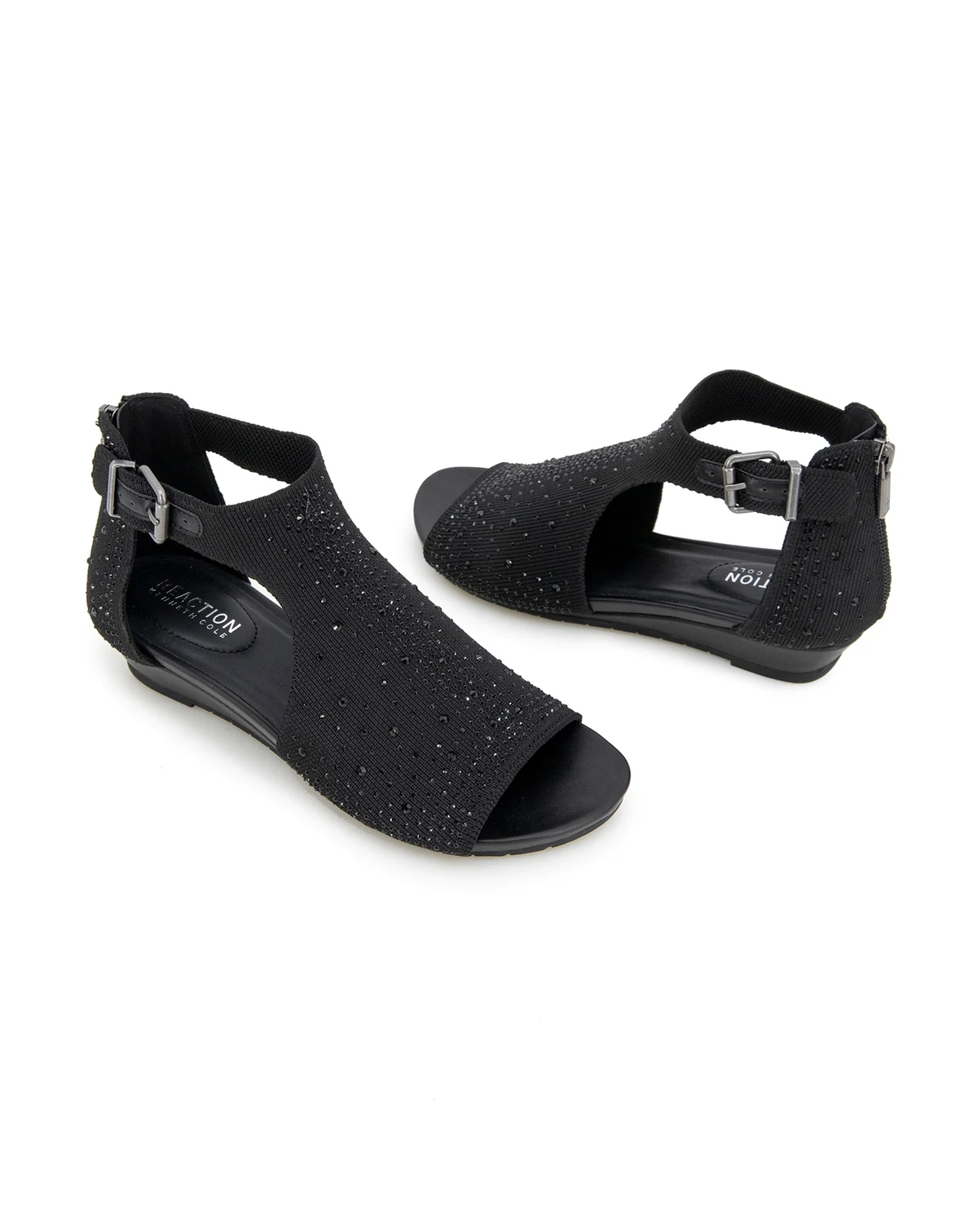 You will be sure to shine in the Kenneth Cole Reaction Gail Stretch. This low wedge sandal features a faux jeweled stretch hooded upper and a closed back with a zipper for easy on easy off. It also has a side buckle so you can customize fit to your foot.