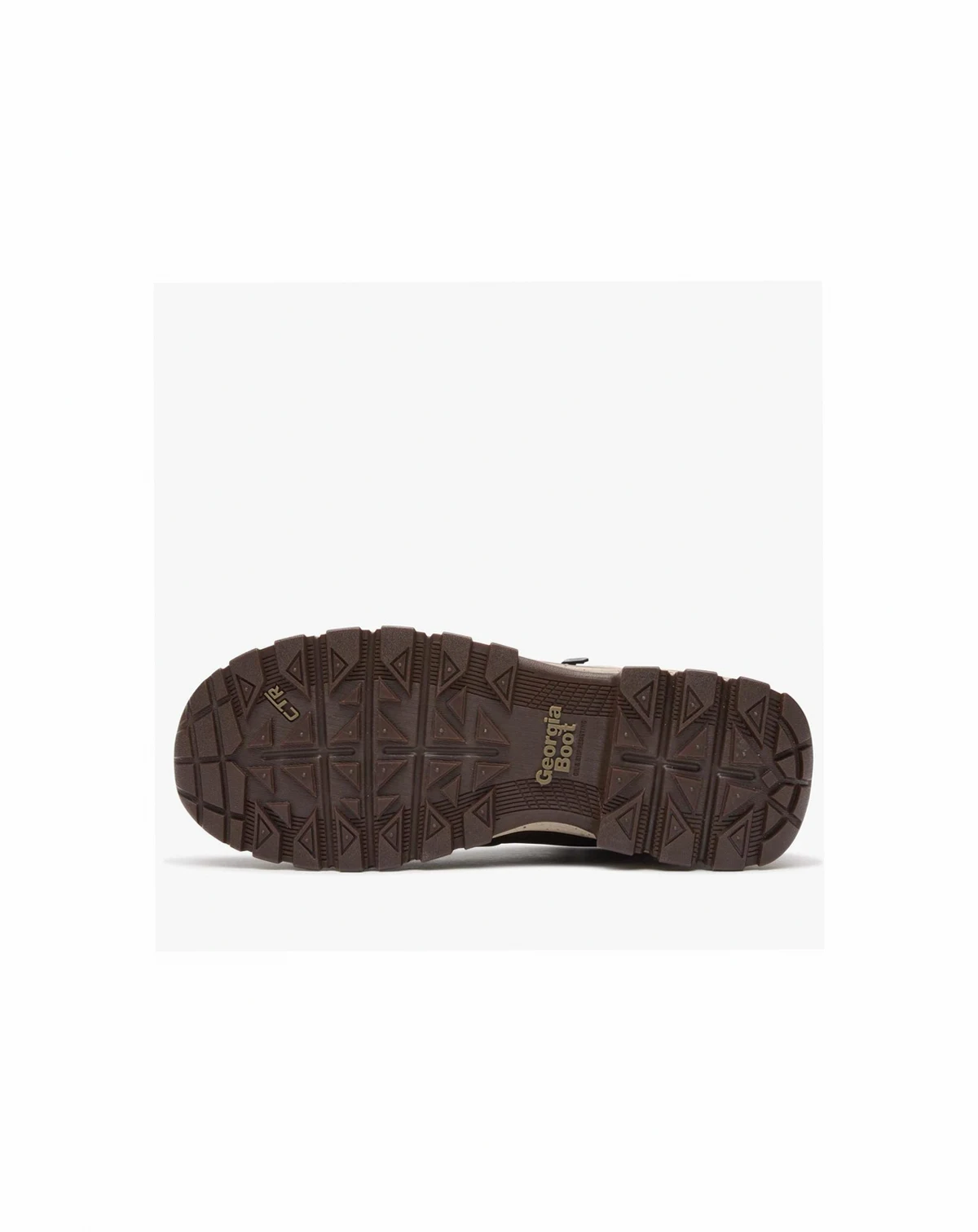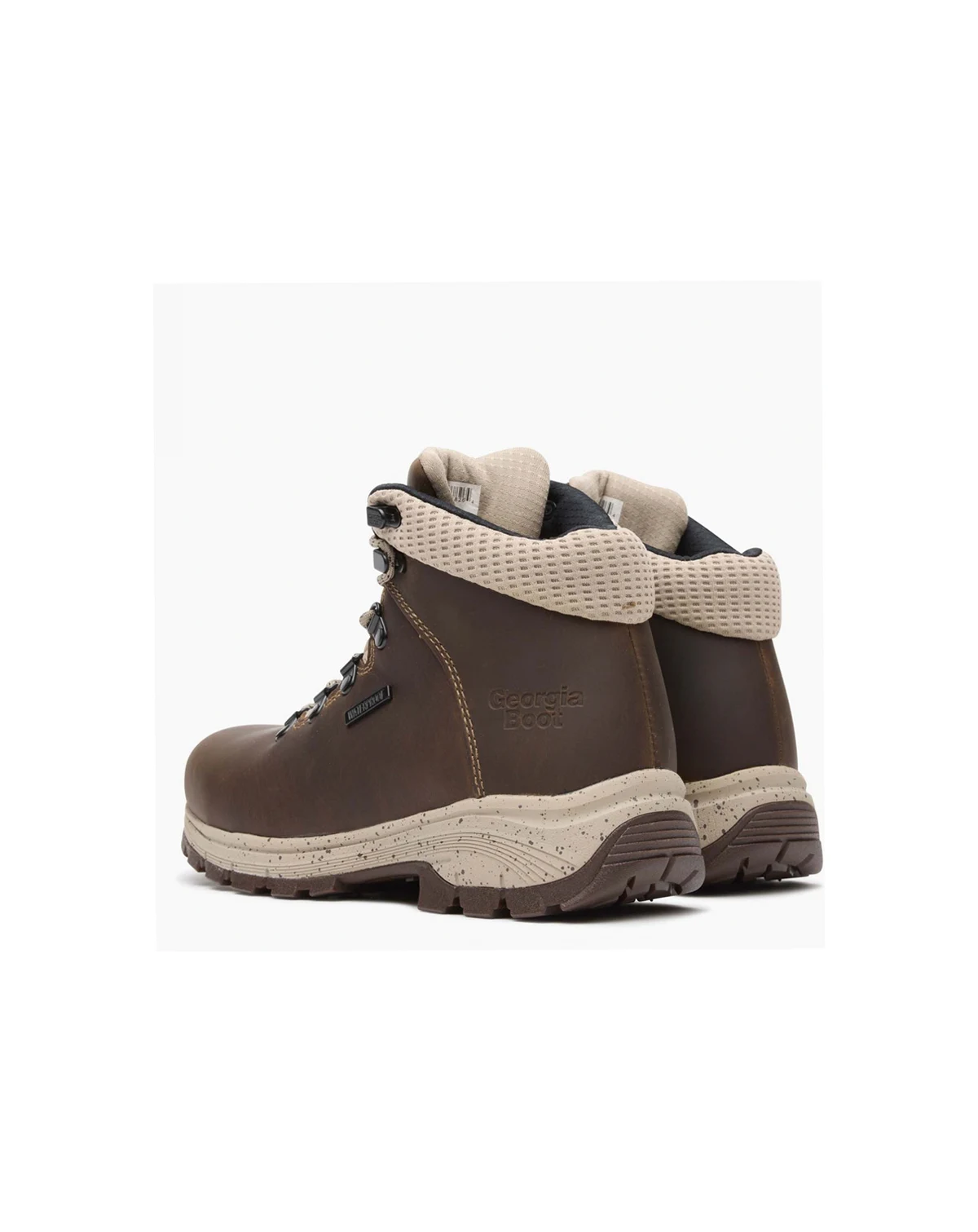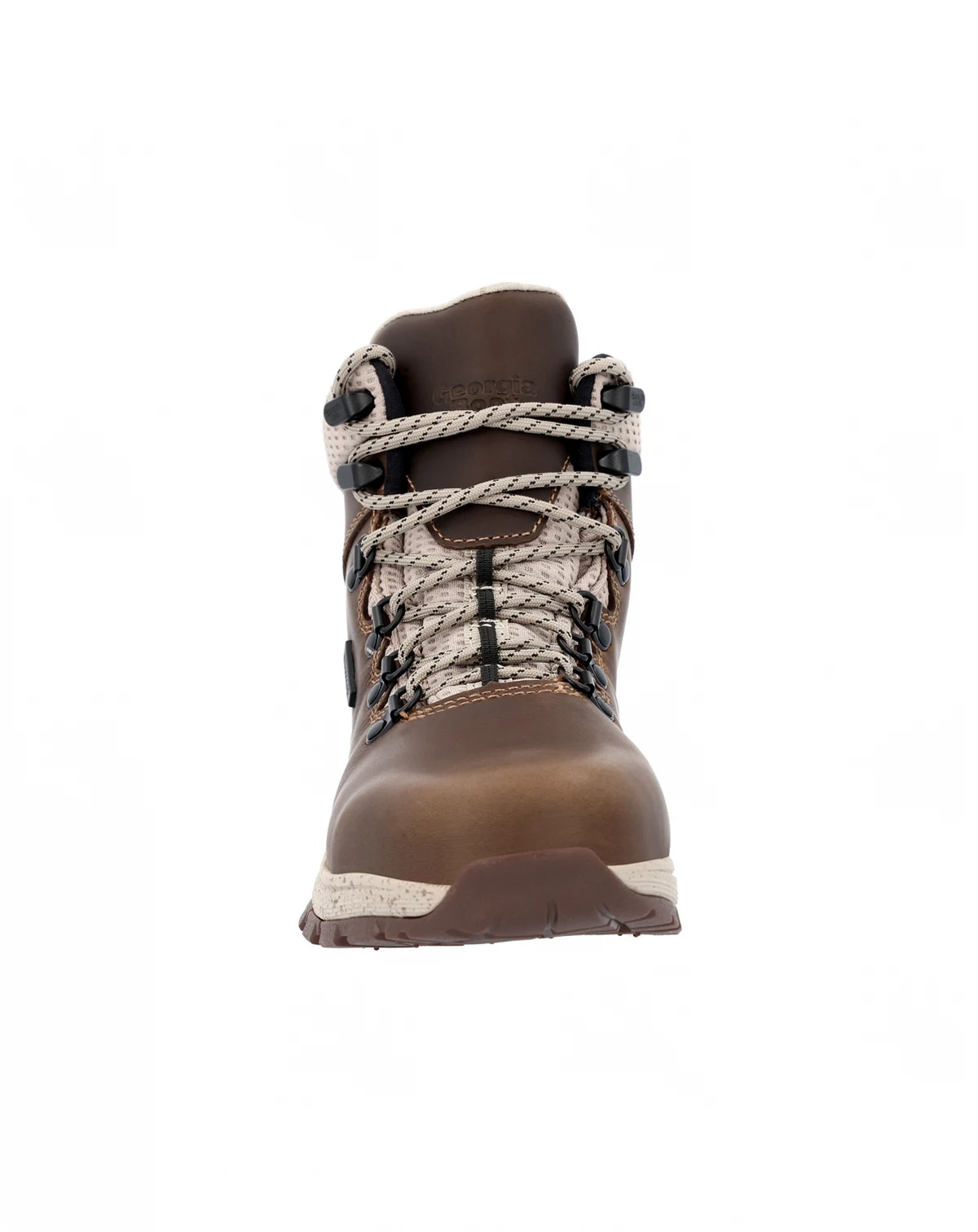 The Georgia Boot Eagle Trail women s protective toe hiker work boot is great for light industrial work environments. The full-grain salt-resistant leather upper features combination hardware, a padded tongue and collar, and an Ergo-Fit alloy toe cap for lightweight protection. This women s safety toe boot meets ASTM F2413 impact and compression standards for safety toe work boots. The interior of this women s protective toe work boot is equipped with a waterproof membrane and lined in a high-performance mesh material. The removable polyurethane foam insole provides responsive cushioning and shock absorption with each step. Below the insole is a fiberglass shank for added arch support and a dual-density EVA and Carbo-Tec rubber outsole that meets ASTM F2413 electrical hazard standards. Work in comfort with this Georgia women s hiker work boot..