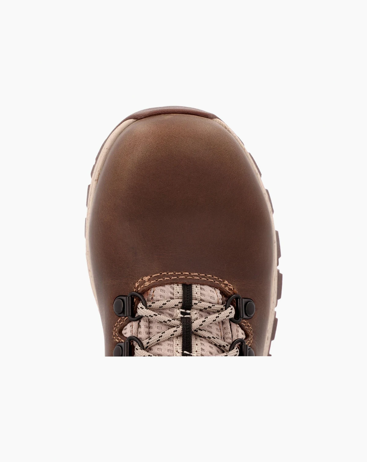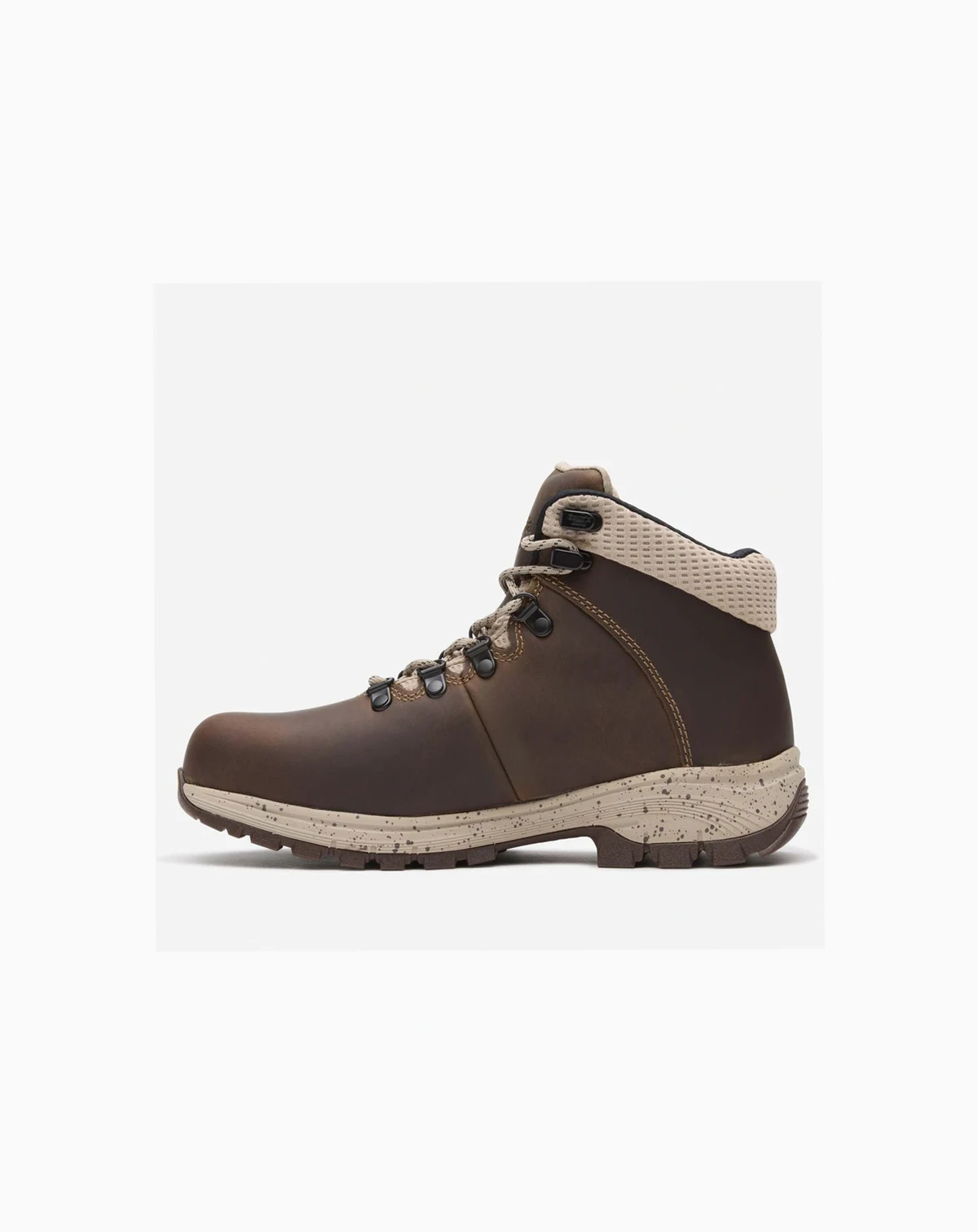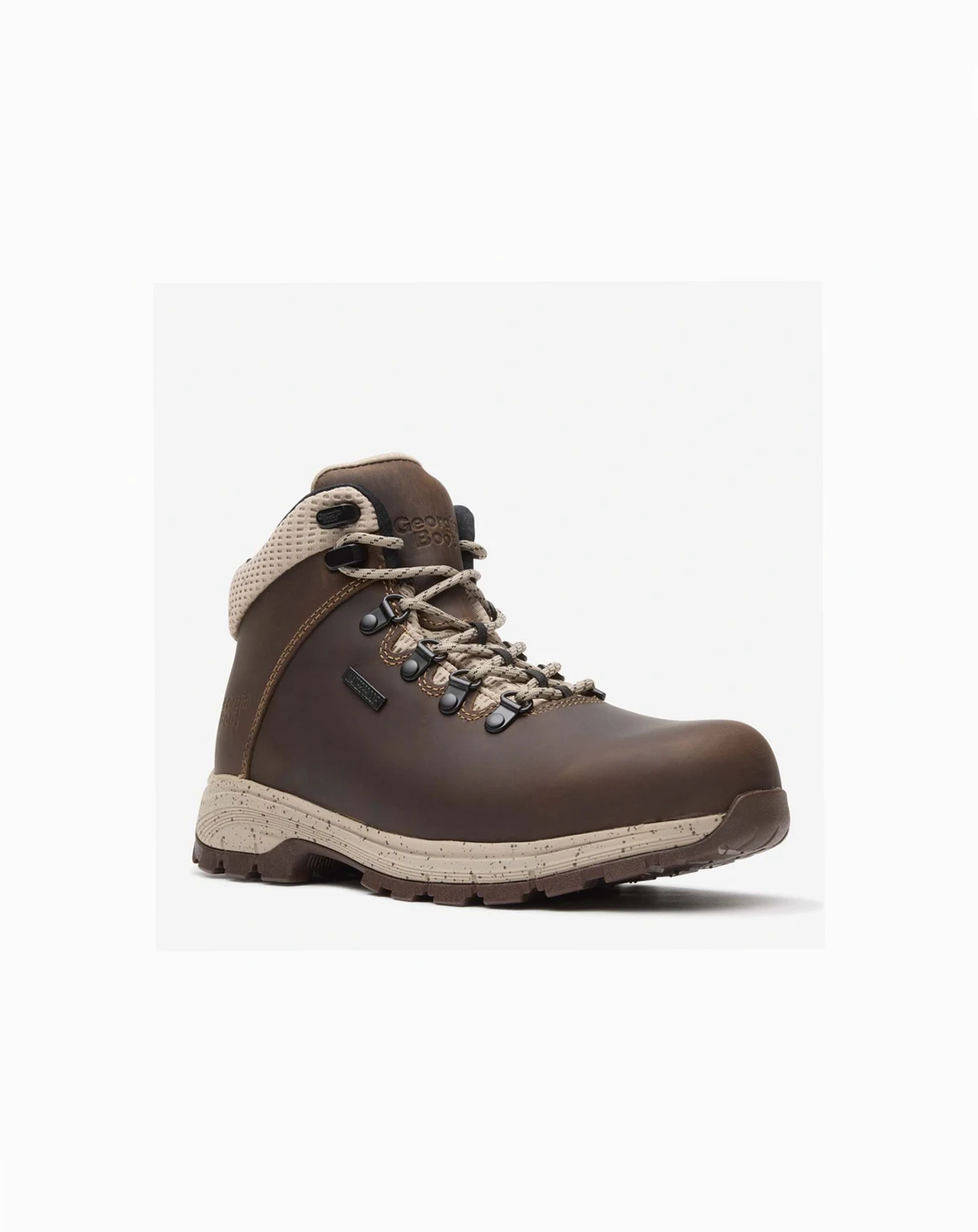 The Georgia Boot Eagle Trail women s protective toe hiker work boot is great for light industrial work environments. The full-grain salt-resistant leather upper features combination hardware, a padded tongue and collar, and an Ergo-Fit alloy toe cap for lightweight protection. This women s safety toe boot meets ASTM F2413 impact and compression standards for safety toe work boots. The interior of this women s protective toe work boot is equipped with a waterproof membrane and lined in a high-performance mesh material. The removable polyurethane foam insole provides responsive cushioning and shock absorption with each step. Below the insole is a fiberglass shank for added arch support and a dual-density EVA and Carbo-Tec rubber outsole that meets ASTM F2413 electrical hazard standards. Work in comfort with this Georgia women s hiker work boot..