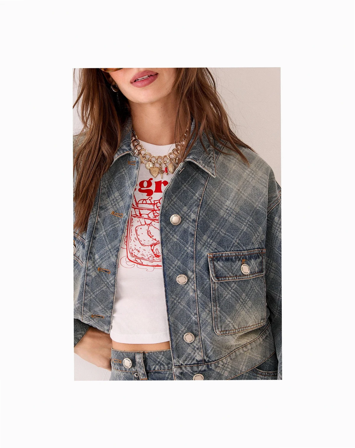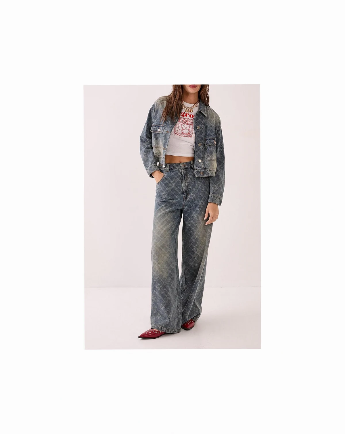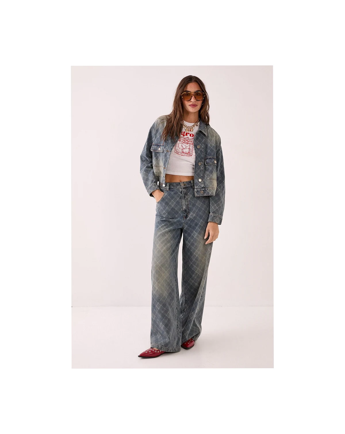 Make a statement with this eye-catching Check Denim Distressed Jacket from NastyGal. The striking check pattern combined with carefully placed distressing creates a bold yet wearable piece that stands out from standard denim offerings. Style it as seen with the matching wide-leg jeans and a graphic crop top for a fashion-forward daytime ensemble, or throw it over a simple slip dress with sneakers for an effortless weekend look.