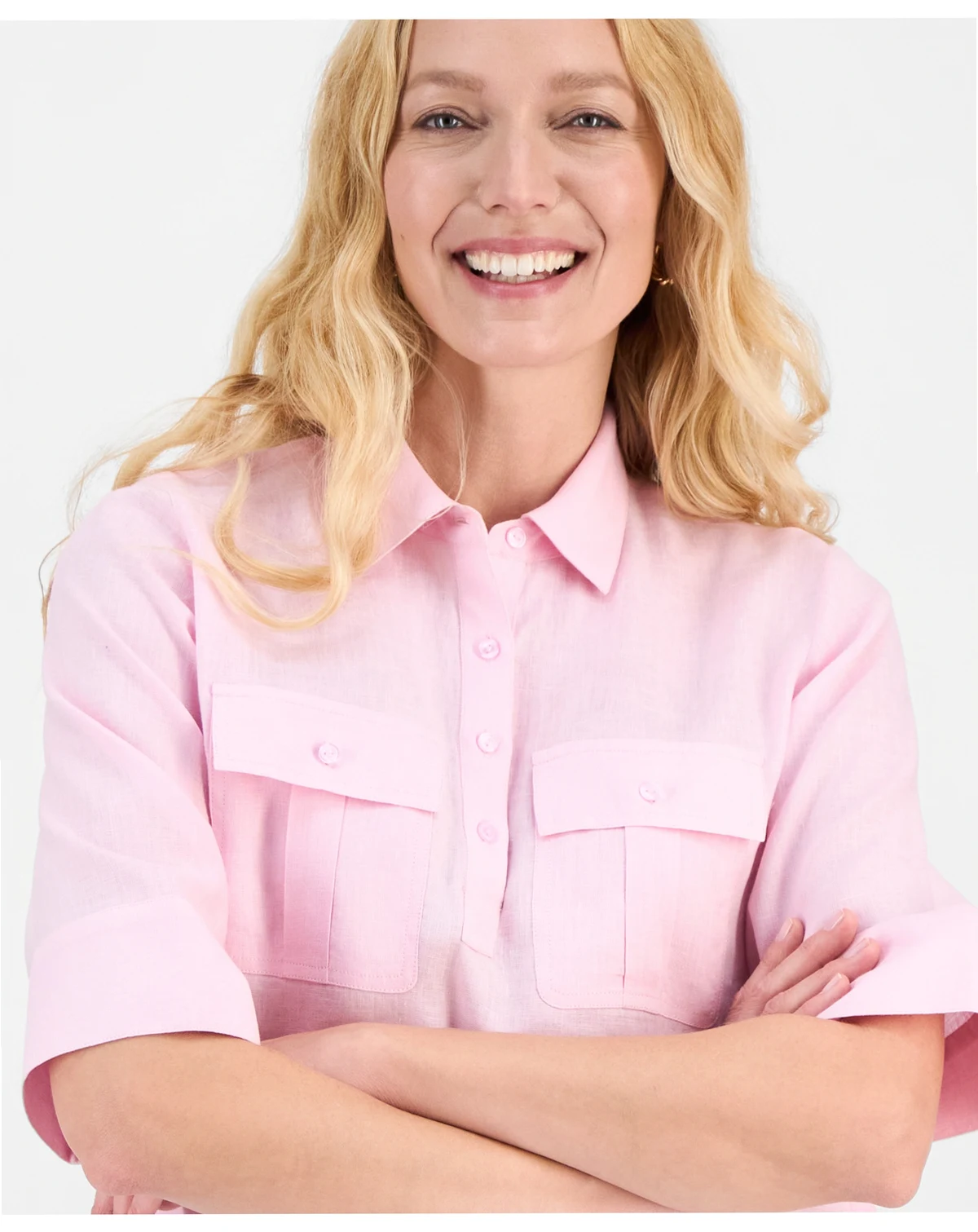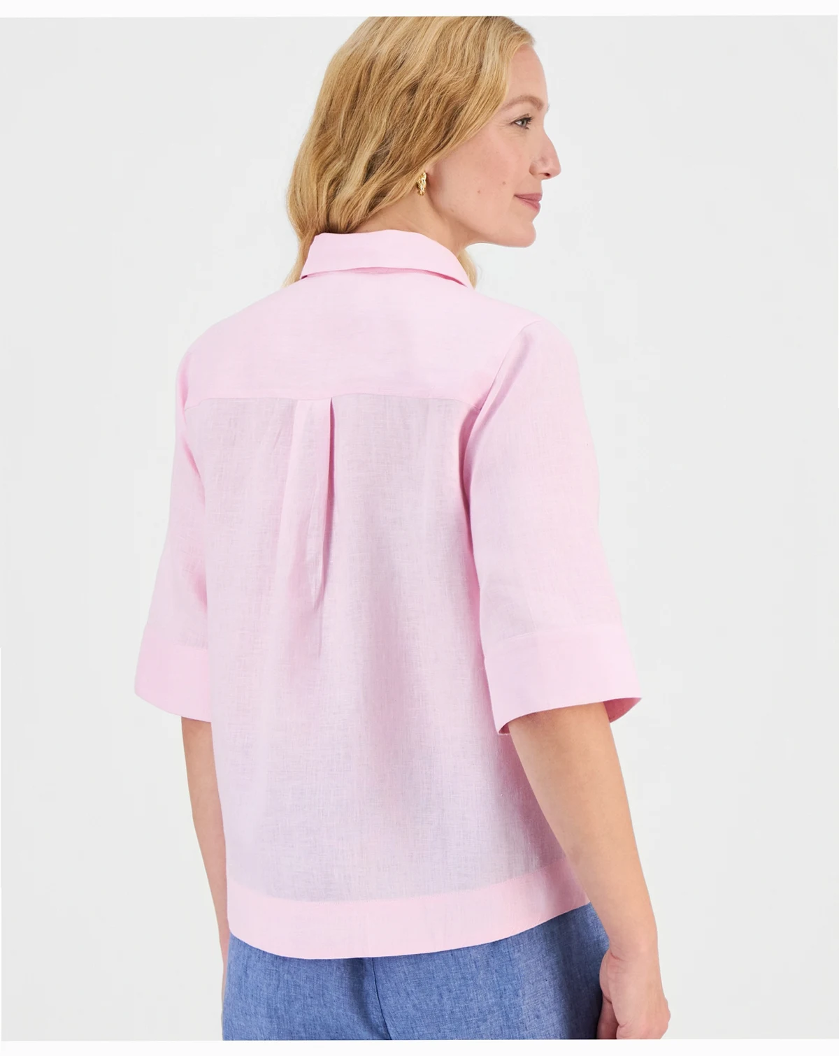 Women's 100% Linen Solid Half-Placket Elbow-Sleeve Blouse, Macy's Exclusive