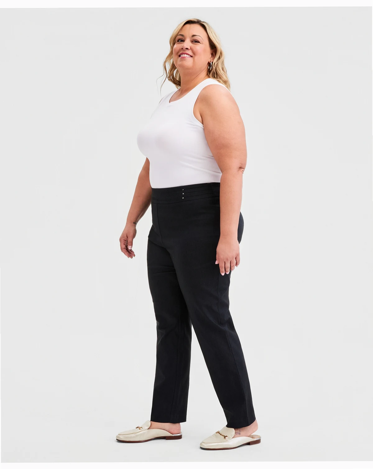 Approx. model height is 5'10" and she is wearing a size 2X; Approx. inseam: 30-1/2"; Mid rise: approx. 11-3/4"; leg opening: approx. 16-1/2"