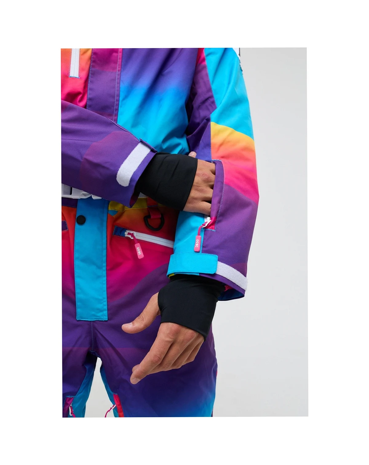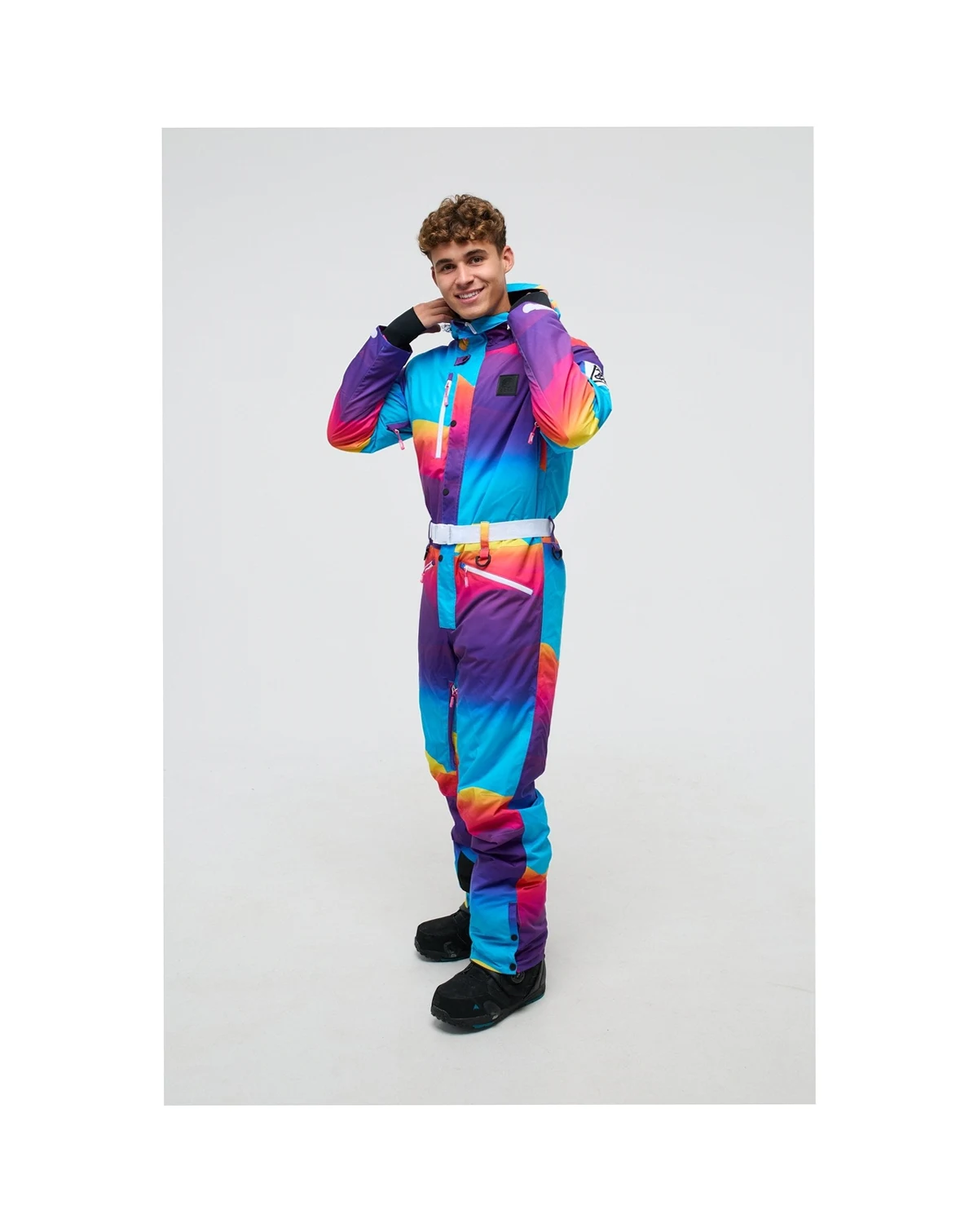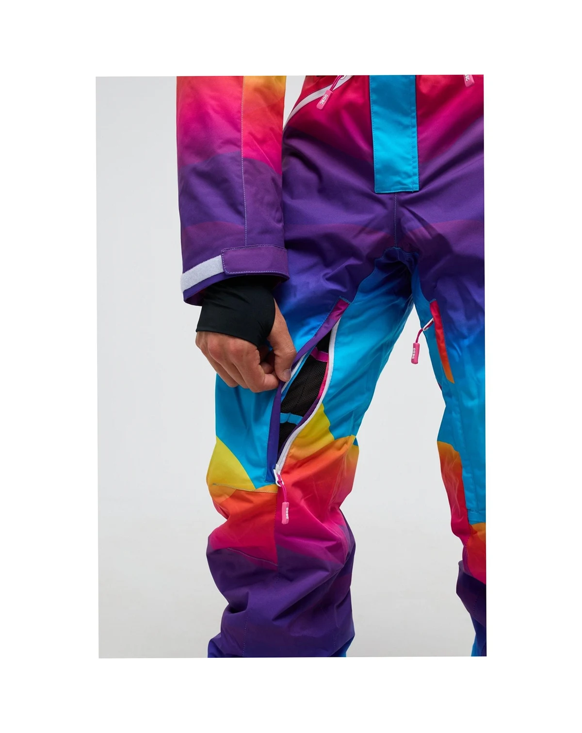 The Mambo Sunset all-in-one ski suit was inspired by the epic sunsets at the iconic Ibiza venue, its a multi colored piece of art consisting of blue, red, yellow and purple waves. The Mambo Sunset Mens ski suit is the only piece of ski clothing you'll ever need.