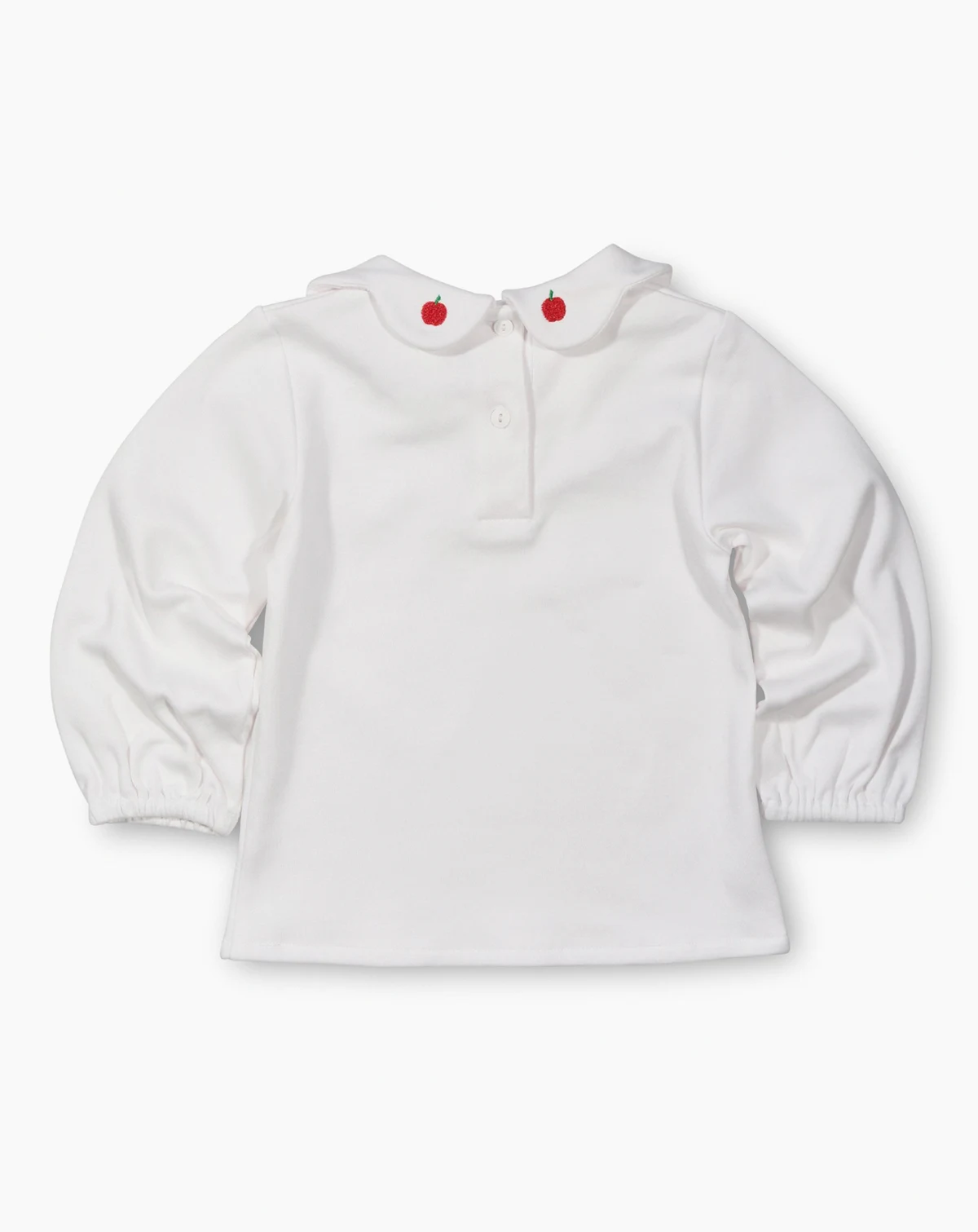 This charming blouse from Florence Eiseman is crafted from soft, breathable white cotton interlock knit, featuring delicate embroidered apples adorning a scalloped Peter Pan collar. Elasticized wrists add playful detail and ensure a cozy fit. Machine washable for easy care—perfect for adding a sweet, classic touch to any outfit.