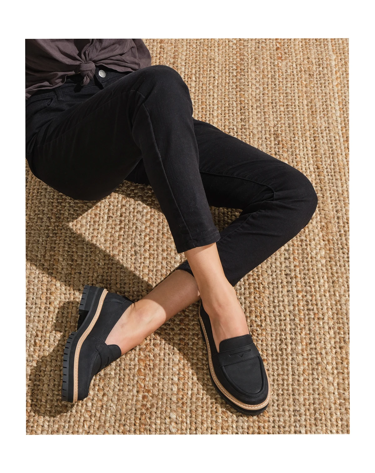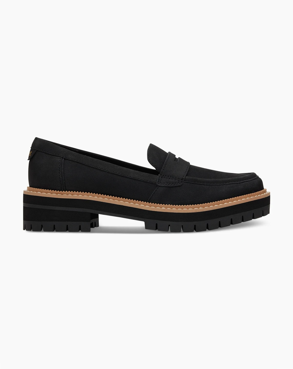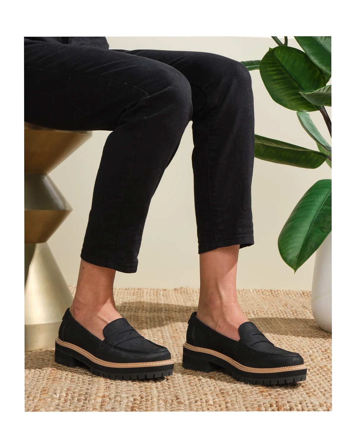 Lug sole platform loafer with classic penny keeper details and menswear-inspired tailoring. Leather uppers. Non-removable Custom Cloud Bound™ insoles for all-day comfort and support and TPR outsole with rubber lug for traction.