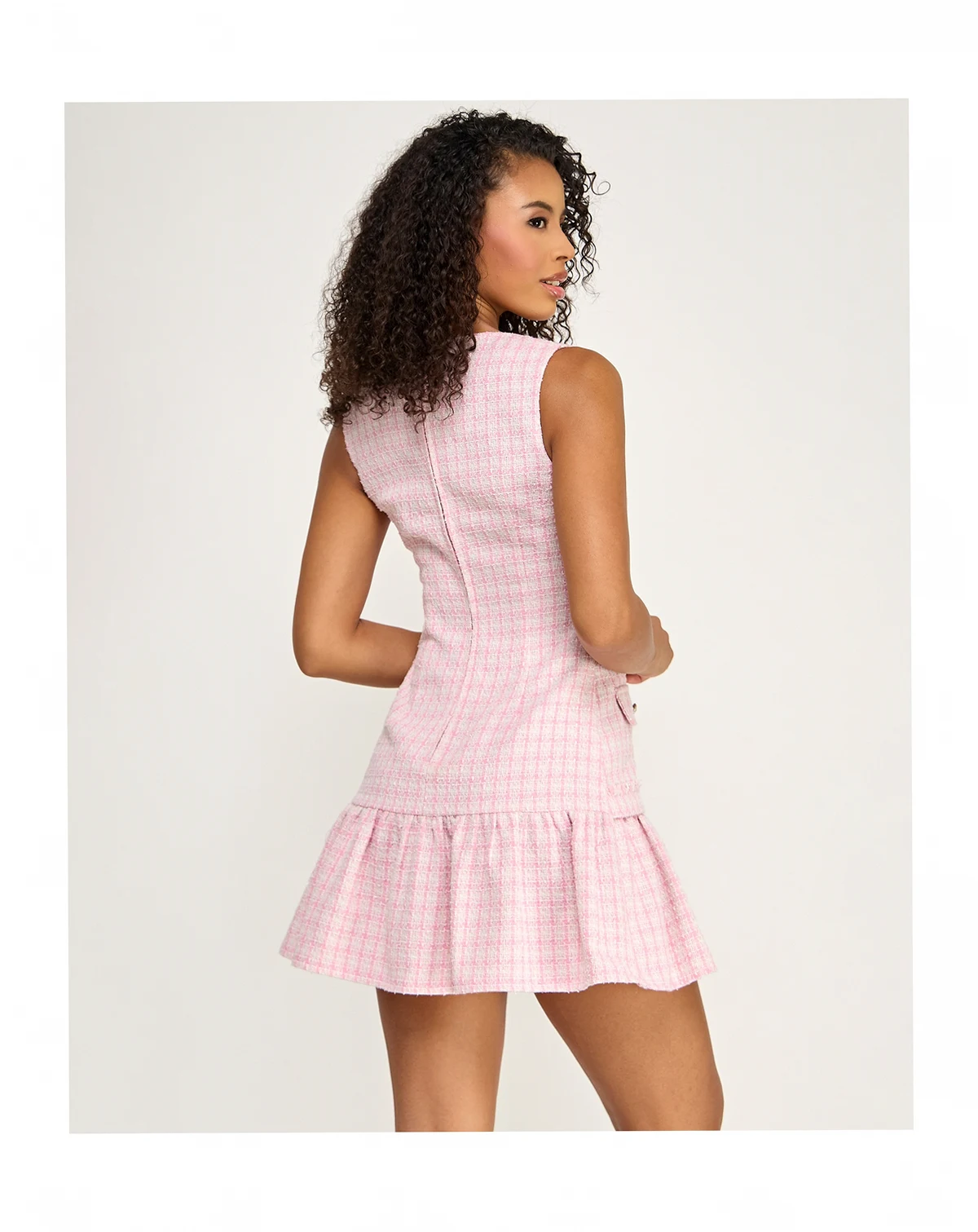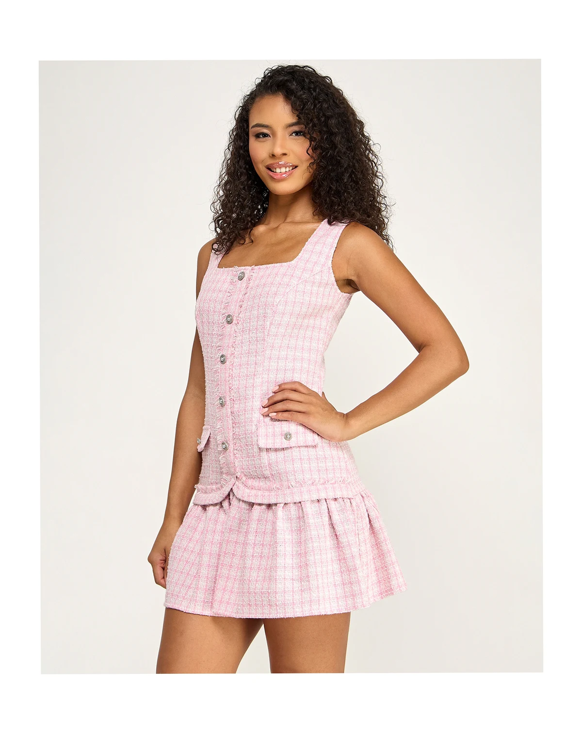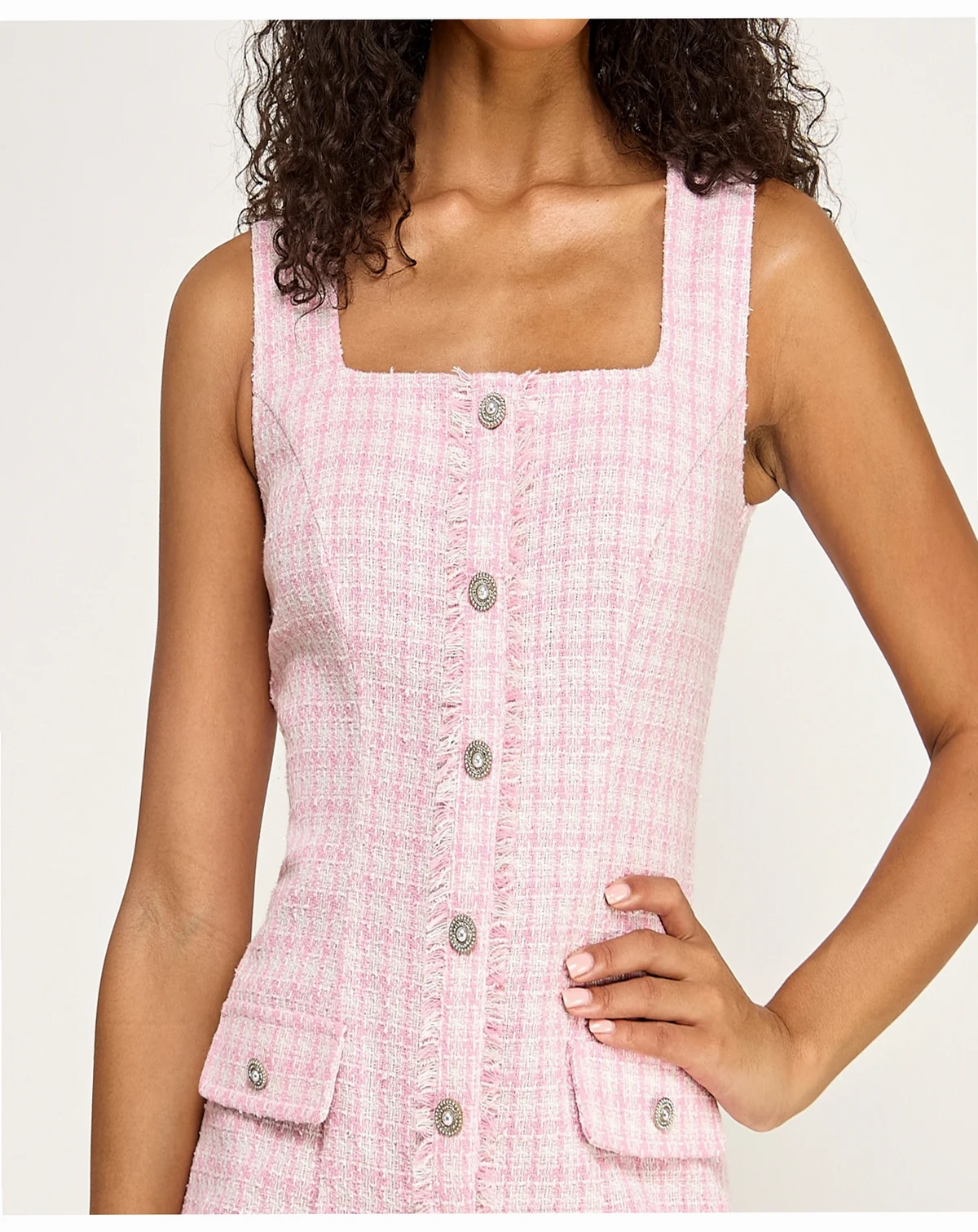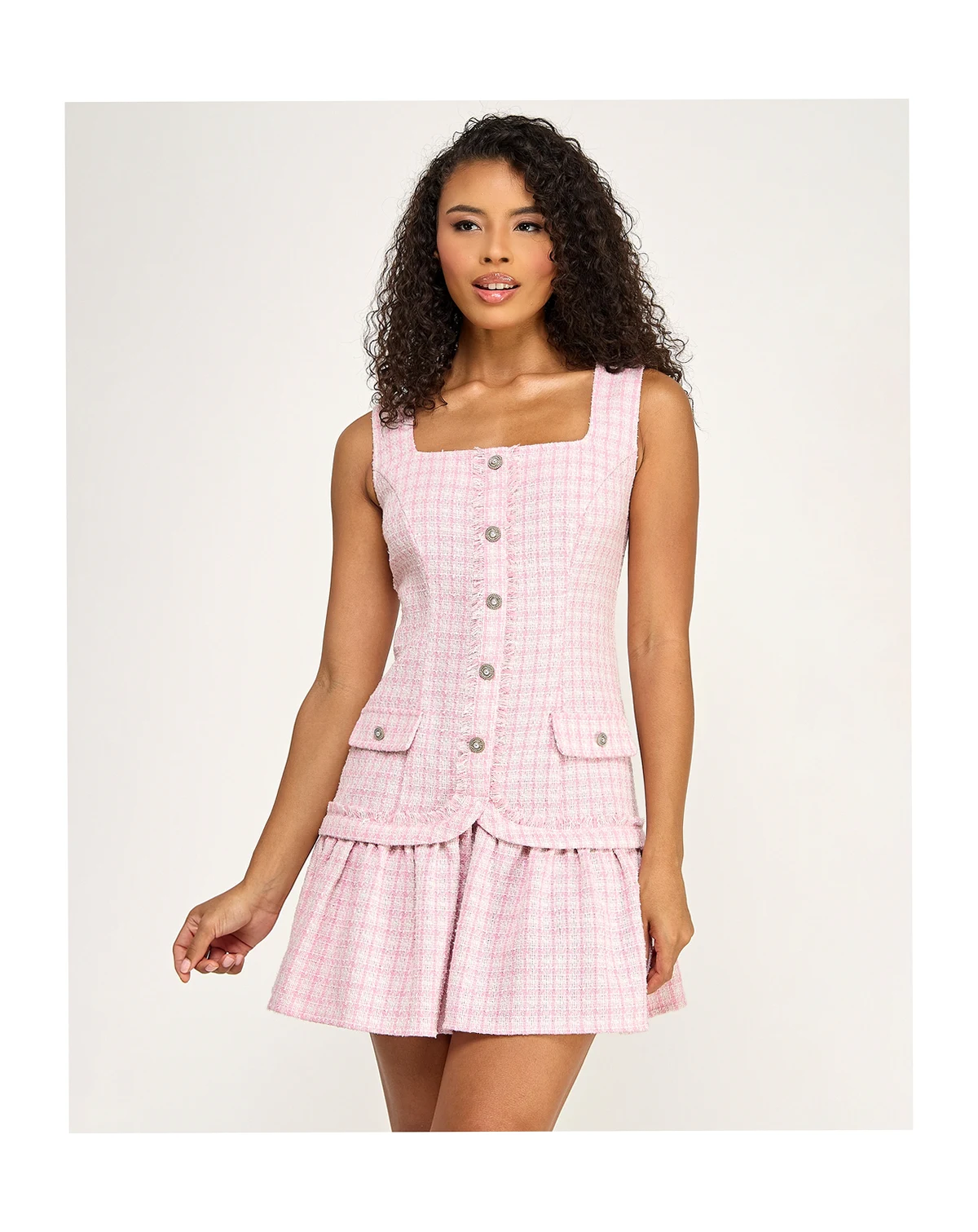 Add a touch of sparkle with the lurex fabric of this sleeveless square neck dress from City Studios. A button-up front and drop waist with bottom ruffle create a playful, festive look.