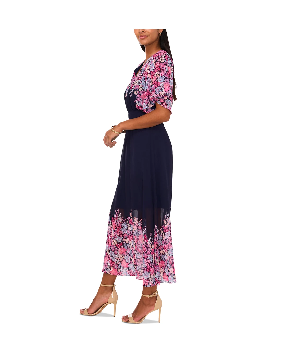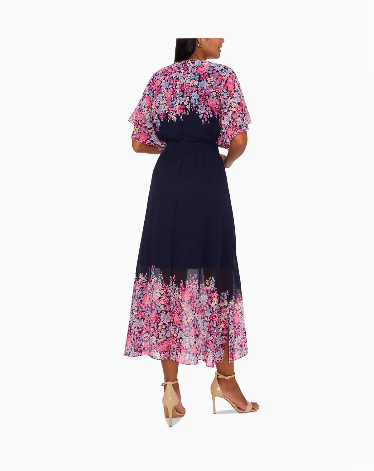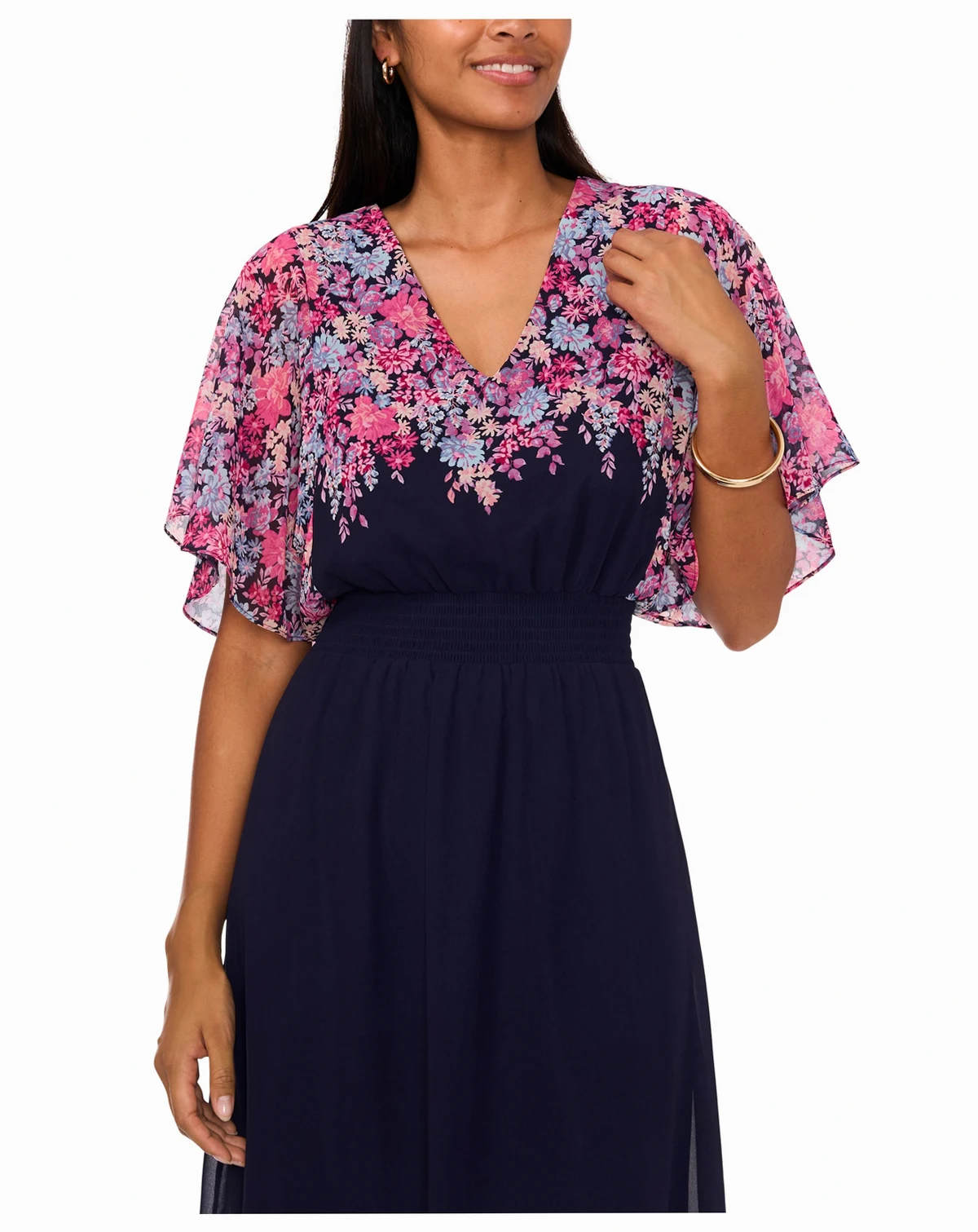 Celebrate in a floaty piece that stays comfy all day with this flutter-sleeve chiffon dress from MSK. Placed floral print gives it a framed look for added interest.