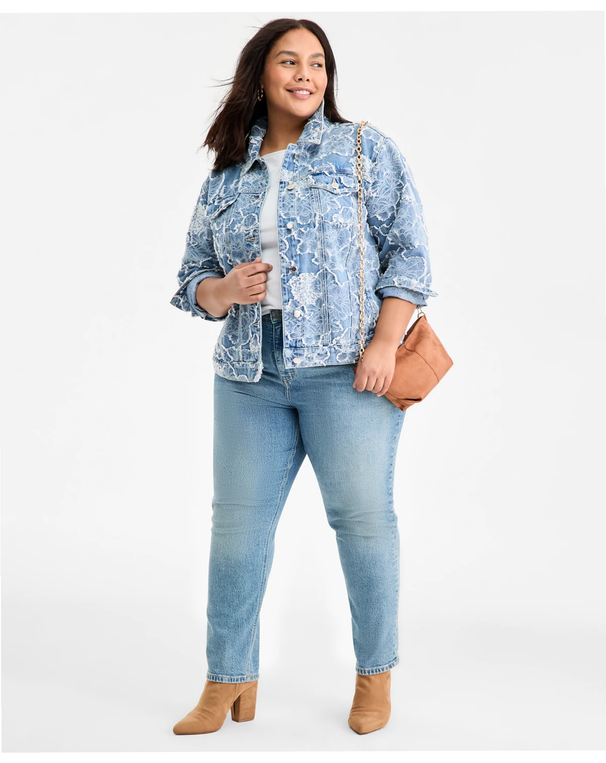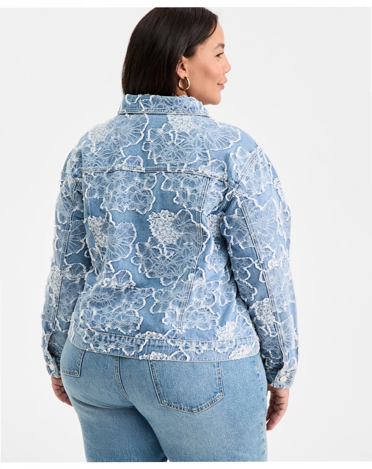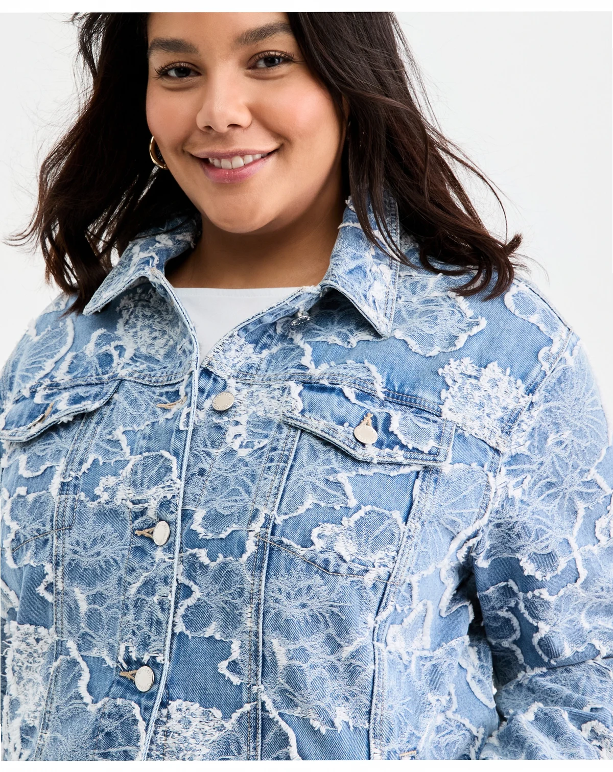 Finished in crisp, lightweight cotton denim, this trucker jacket by On 34th gets an update thanks to a floral-textured jacquard. The perfect casual style choice for your weekend looks, designed for the Trendy Plus range. ABOUT THE BRAND: On 34th was designed for and with women like you. Made for your body, your style, and your truth. As your wardrobe's BFF, these mix-and-match pieces work with everything in your closet.