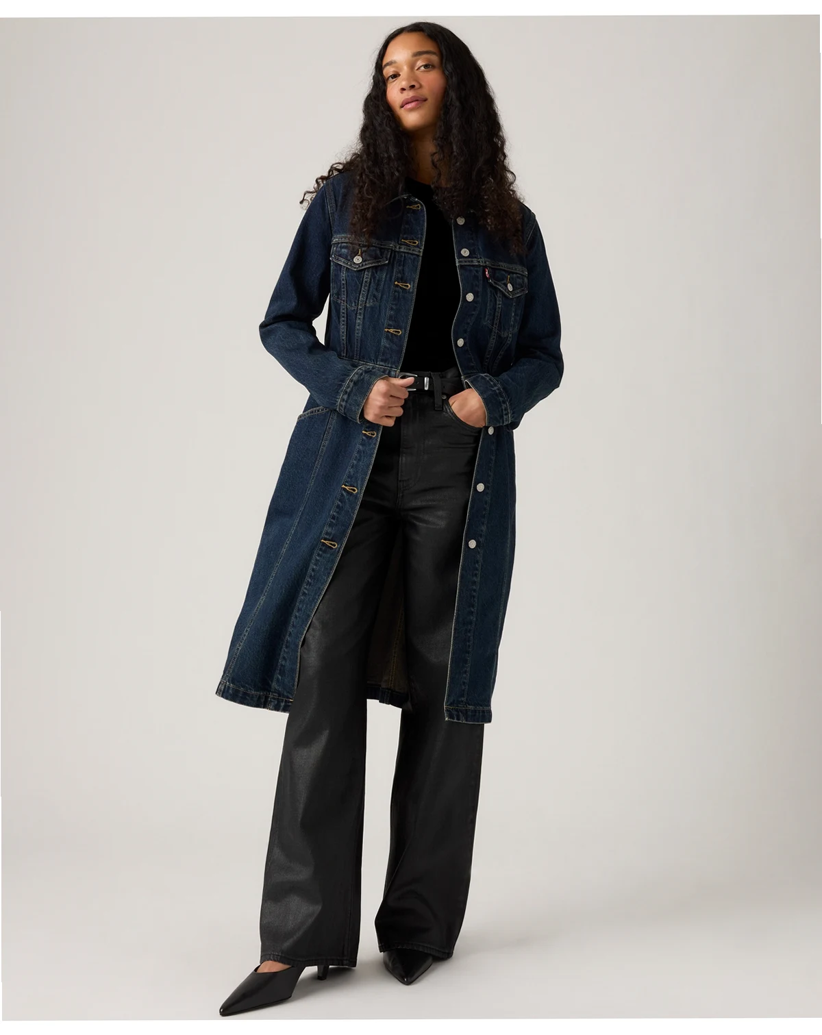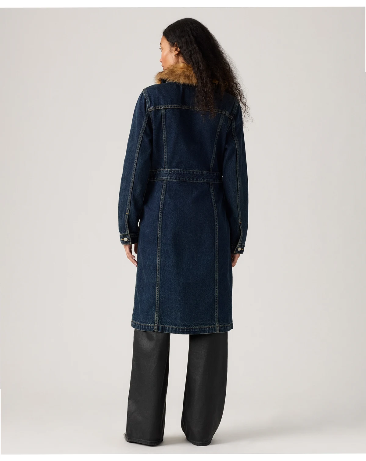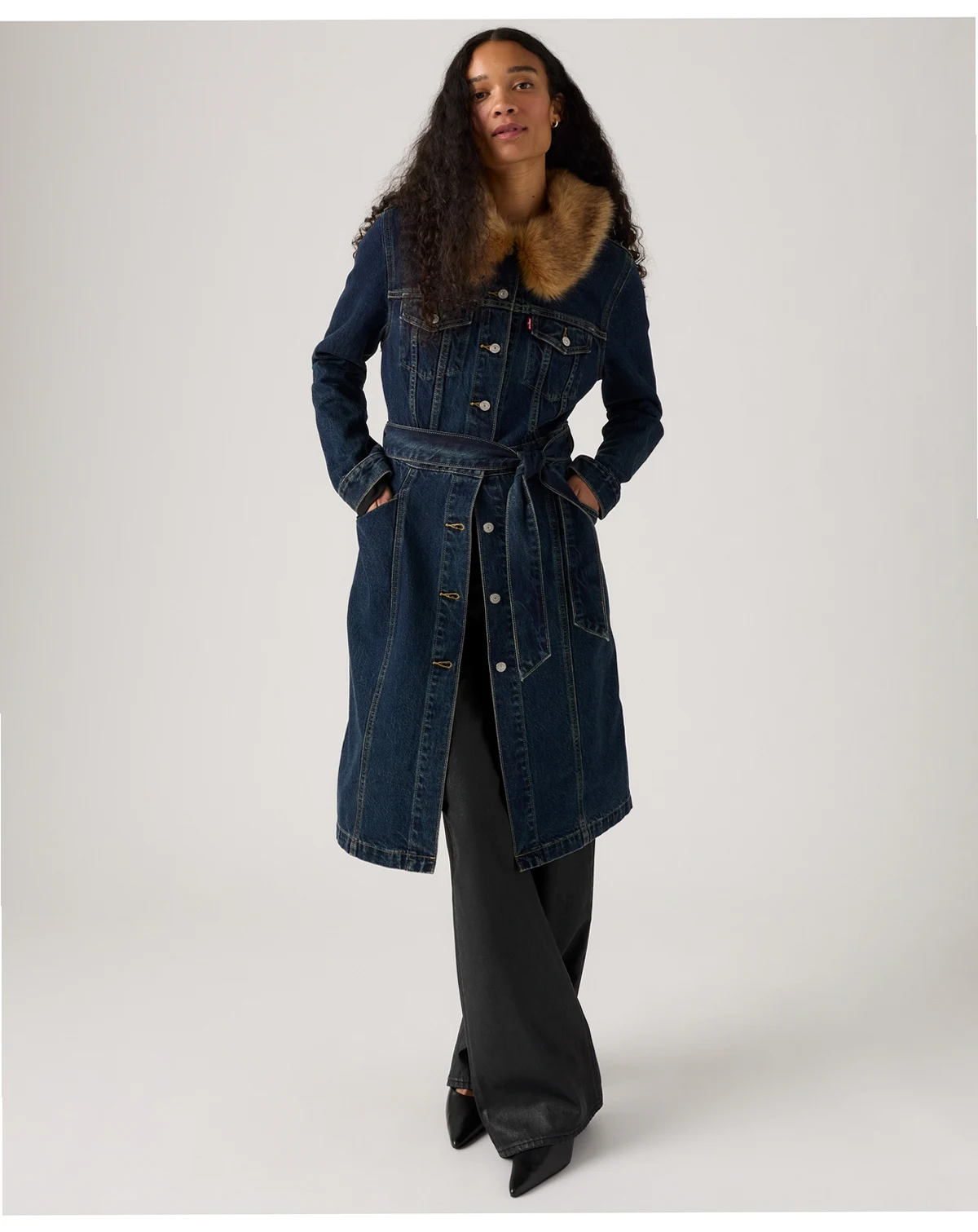 Enjoy a longline silhouette with this Fur Trucker Jacket from Levi's, featuring a playful removable collar. Two chest pockets and side pockets combine style with functionality. An adjustable belt lets you cinch the waist for a customized fit.