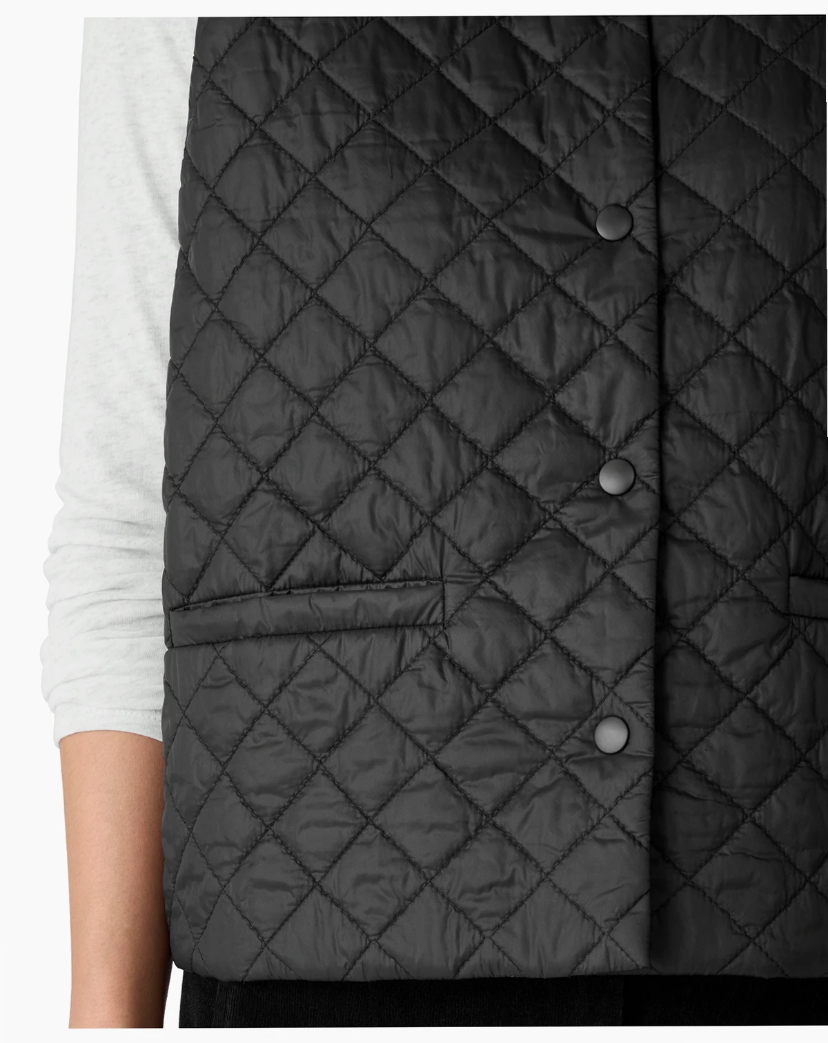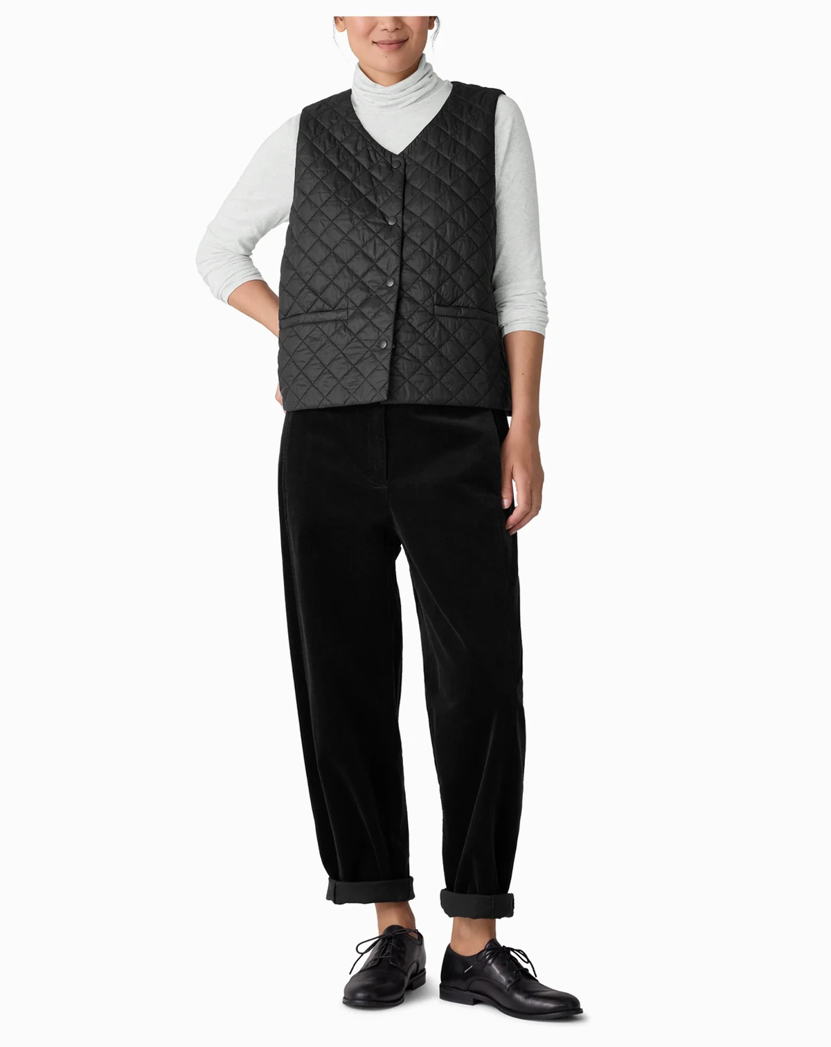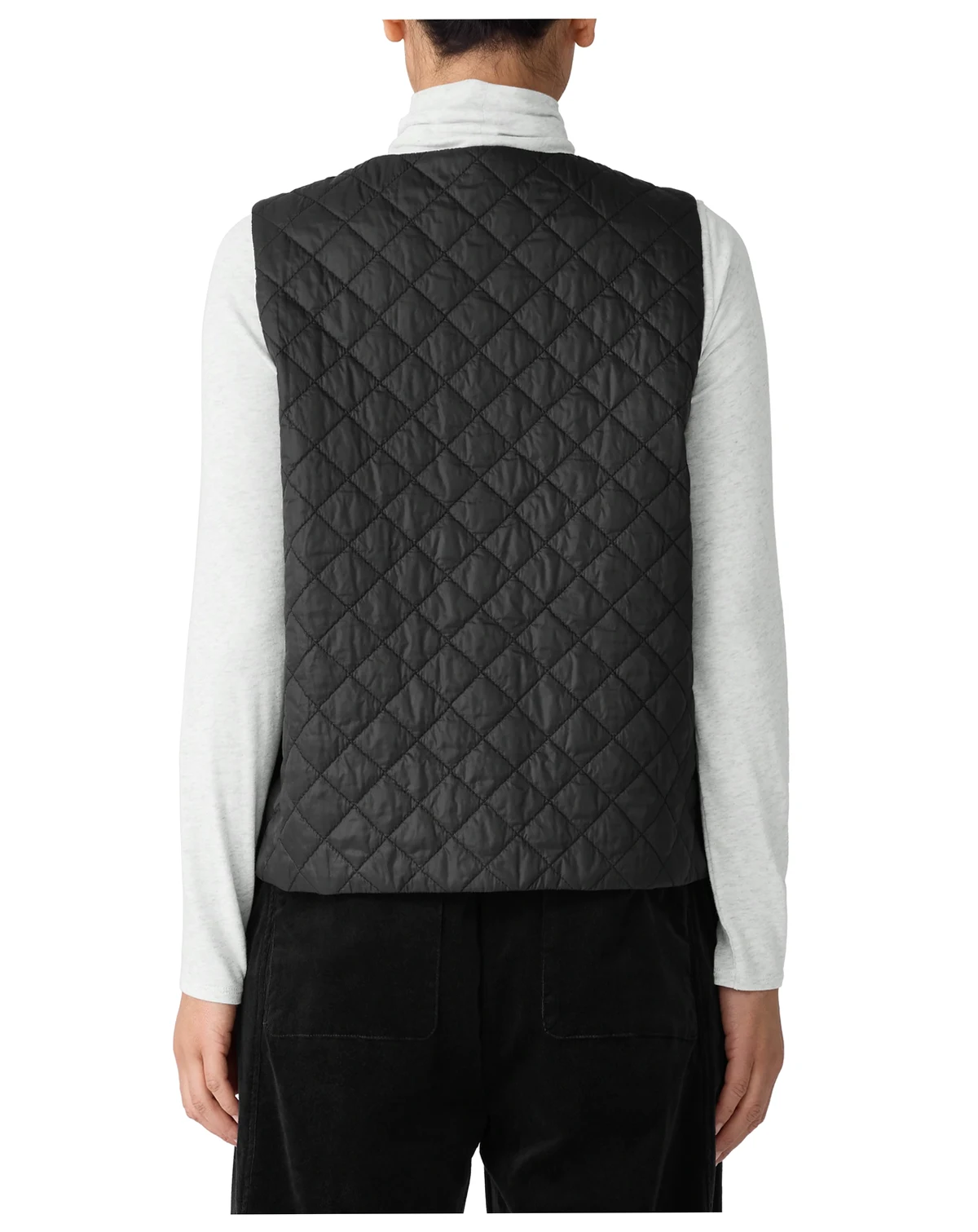 Stay comfortable and chic in this quilted V-neck sleeveless vest by Eileen Fisher. The button-front closure ensures a polished look while the front welt pockets bring practicality, keeping small items close or hands warm.