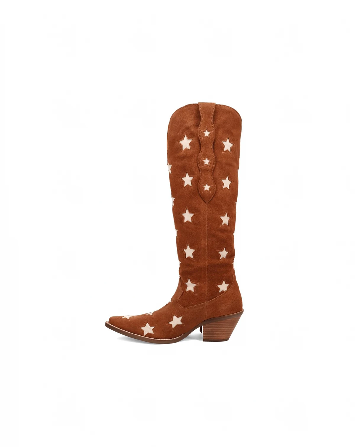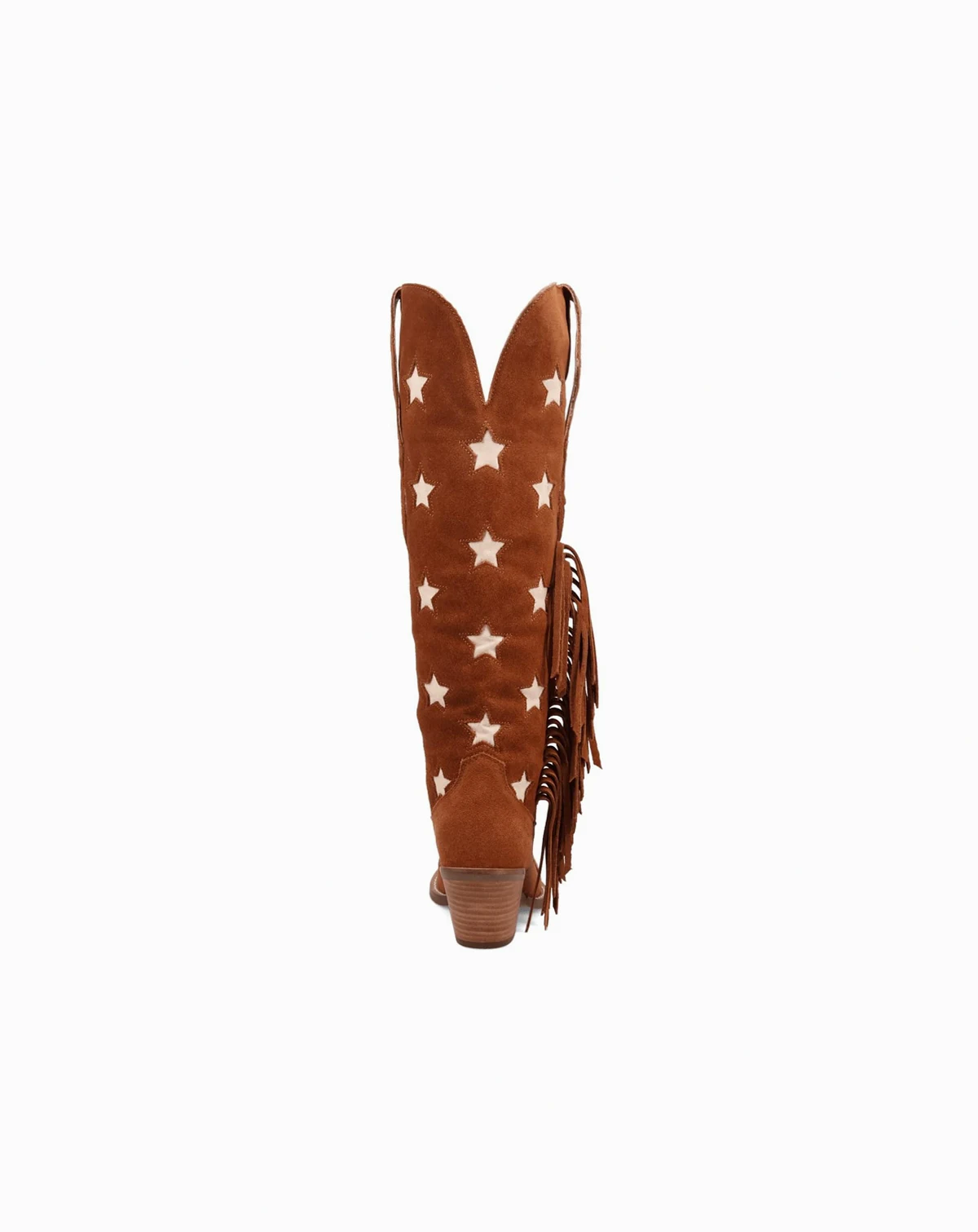 Introducing SUPER STAR— where bold style meets Western charm. Covered in suede and an all over star pattern, these boots are designed to turn heads and shine bright. The playful fringe on the sides adds a touch of movement and flair, making them perfect for both casual outings and standout events.