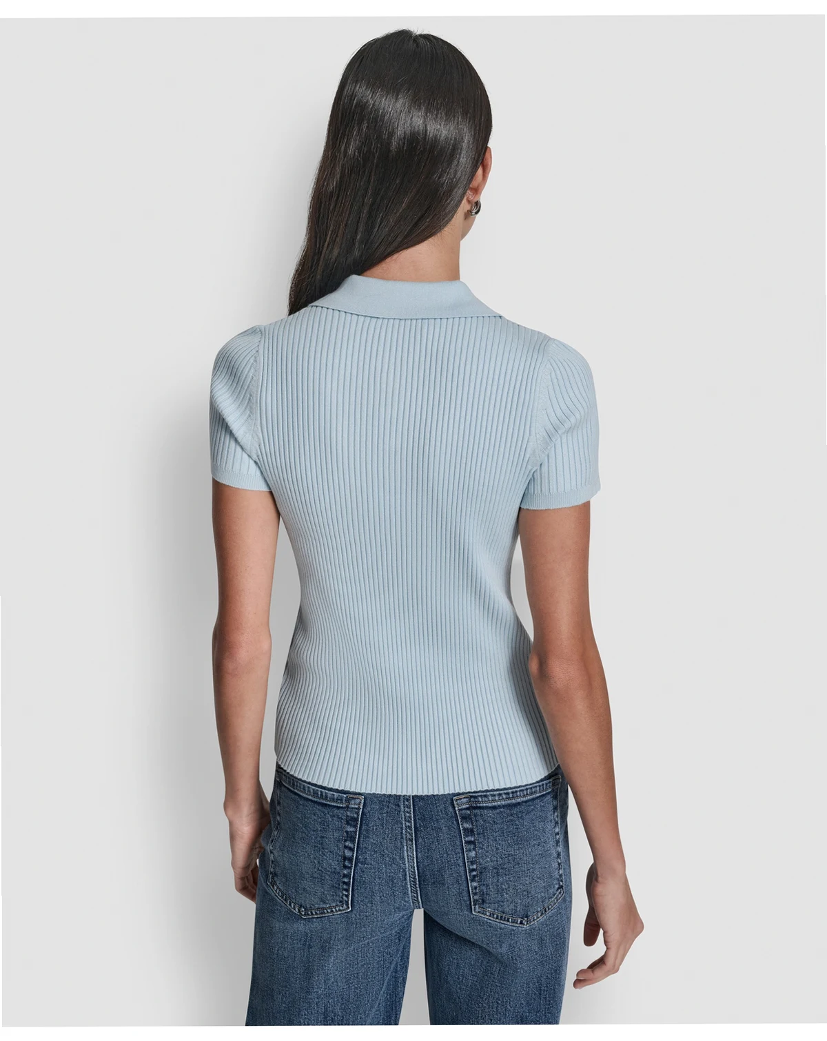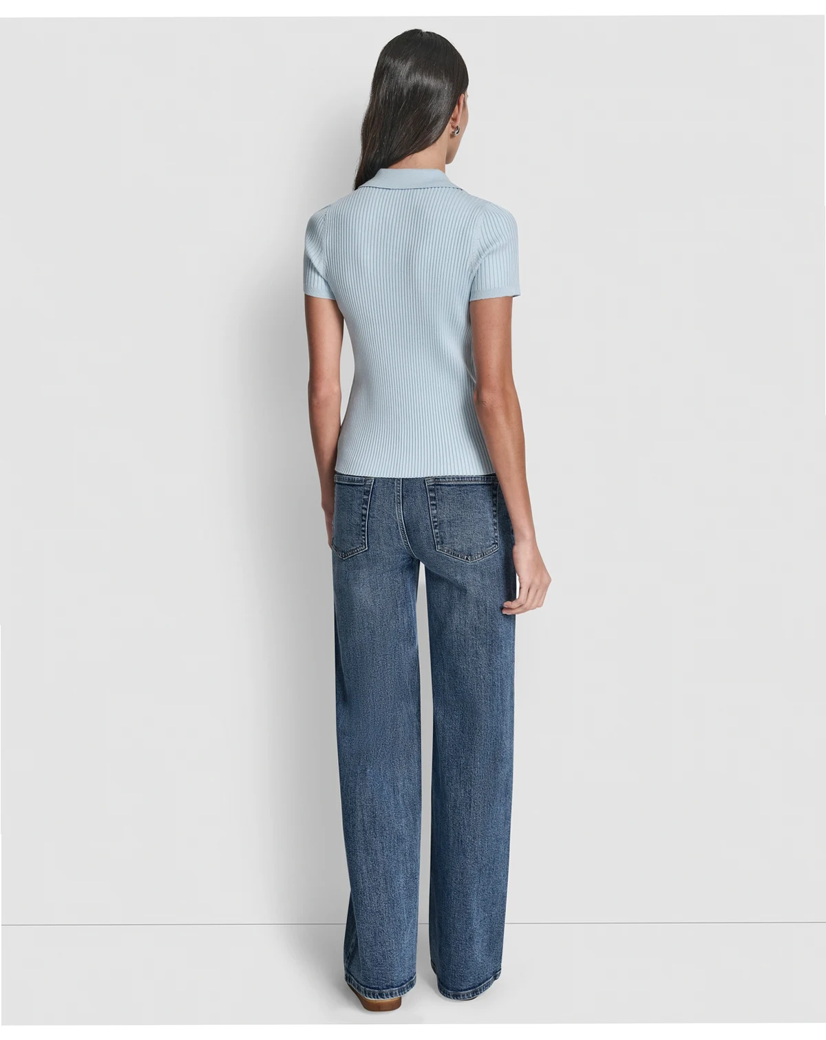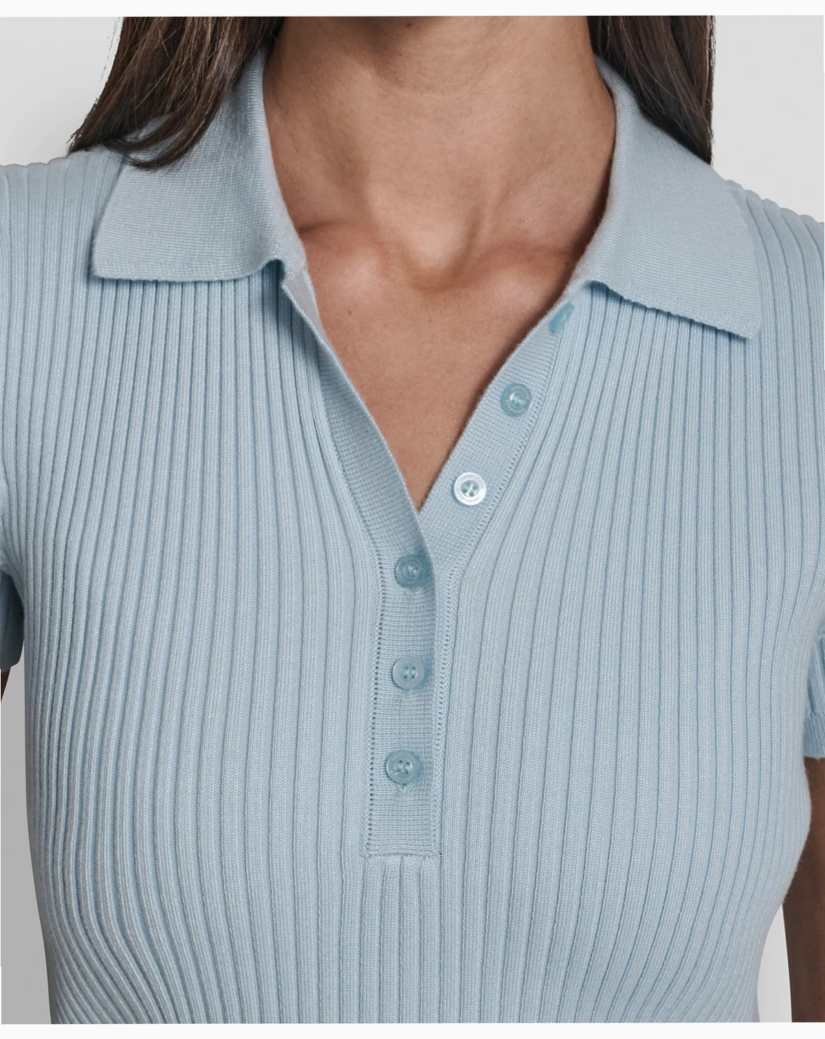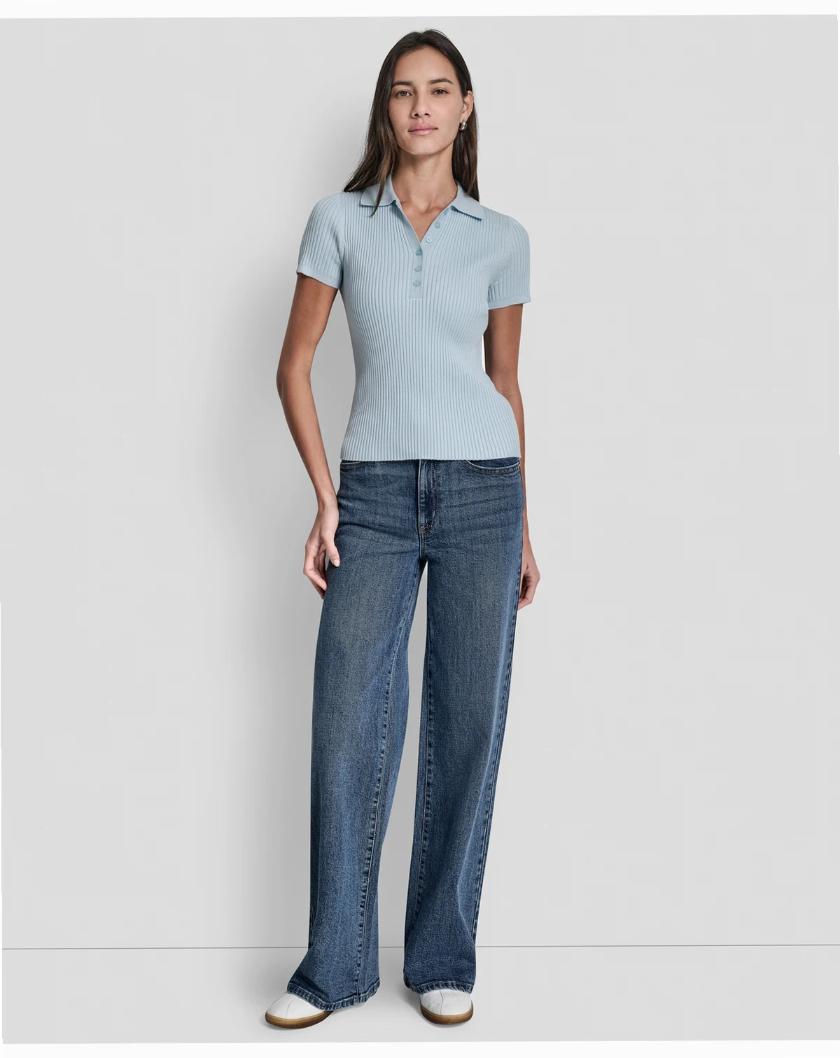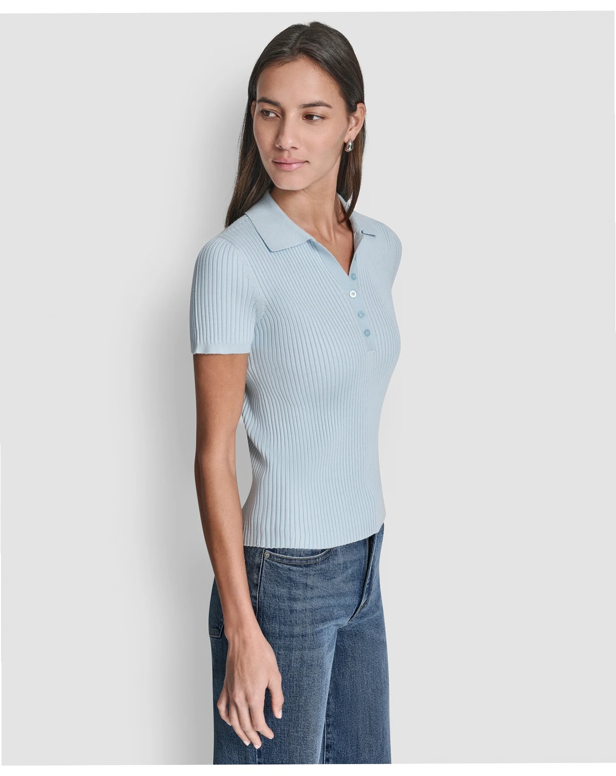 Preppy polo style gets a texture makeover with this ribbed petite shirt from DKNY Jeans. Its slim fit lets you take it from day to night with ease.