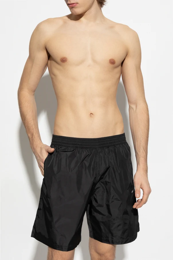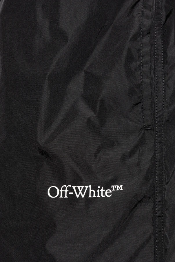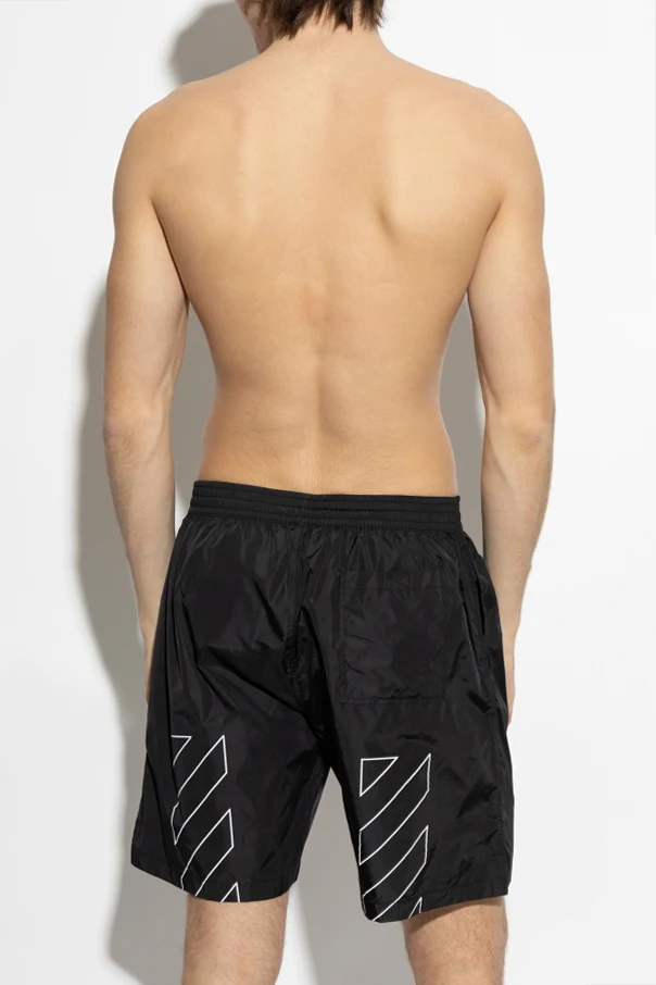 Introducing the Off-White™ Black Swim Shorts , a sublime fusion of elegance and modernity. Crafted from lightweight, water-repellent polyamide, these shorts are the epitome of beach-ready sophistication.